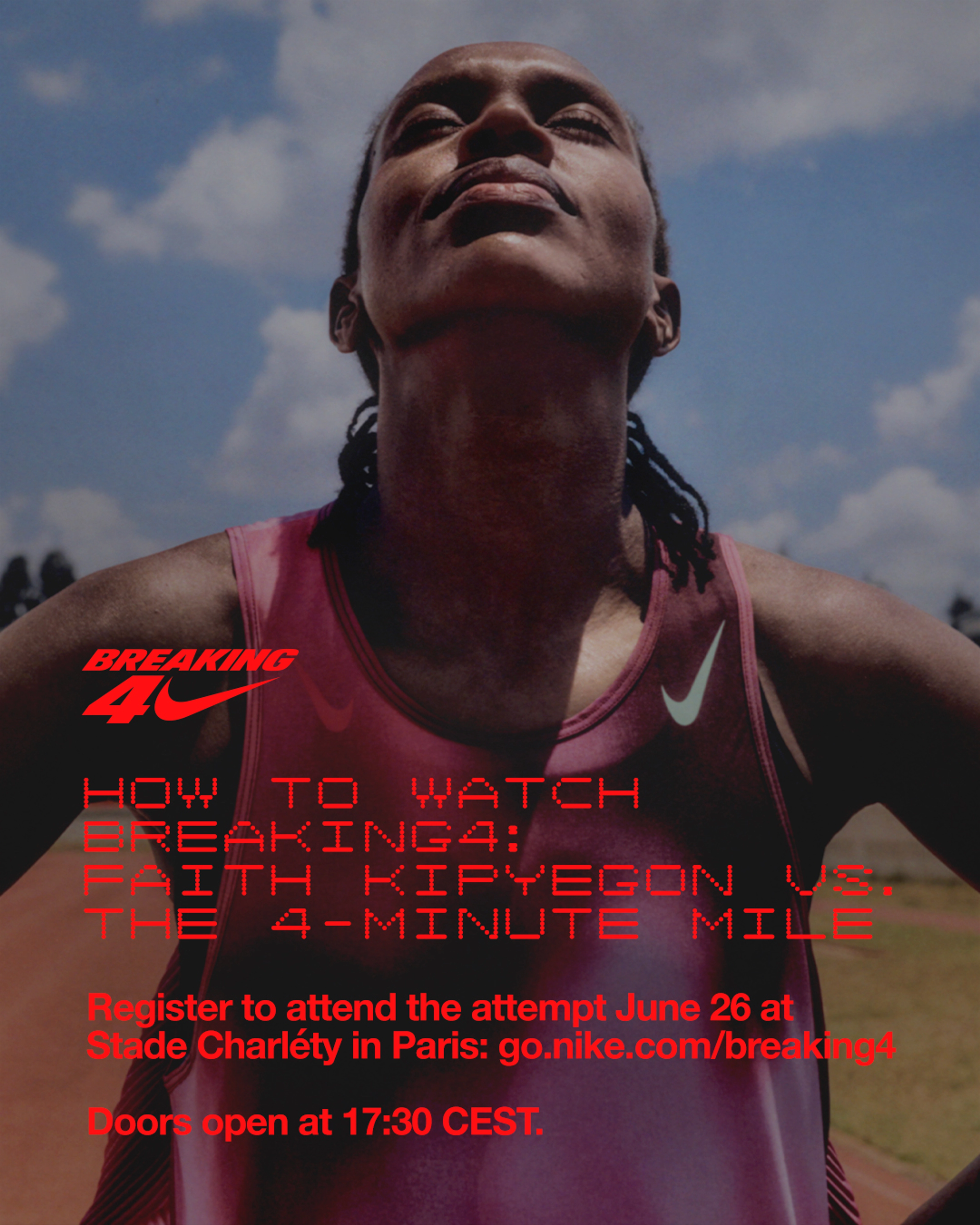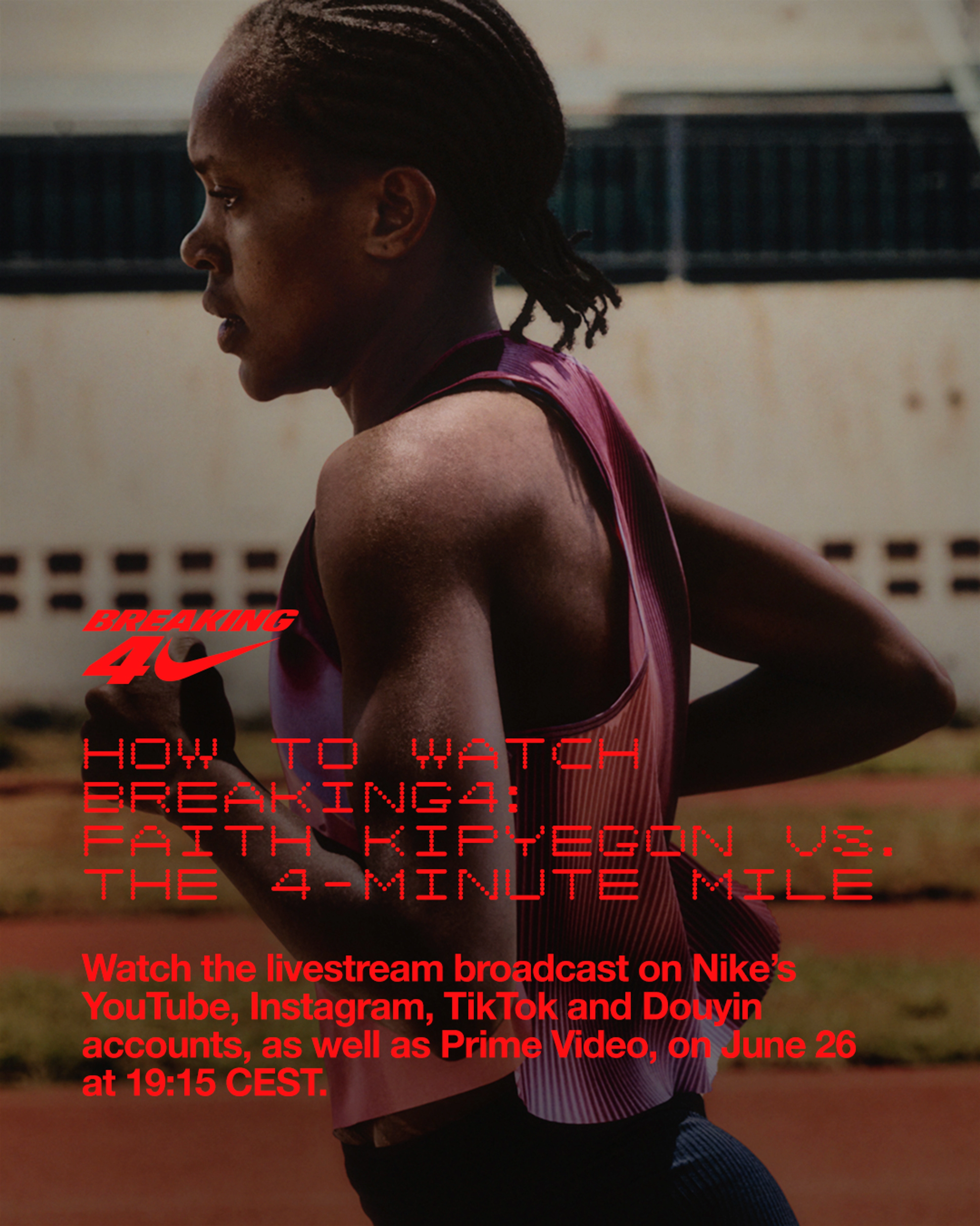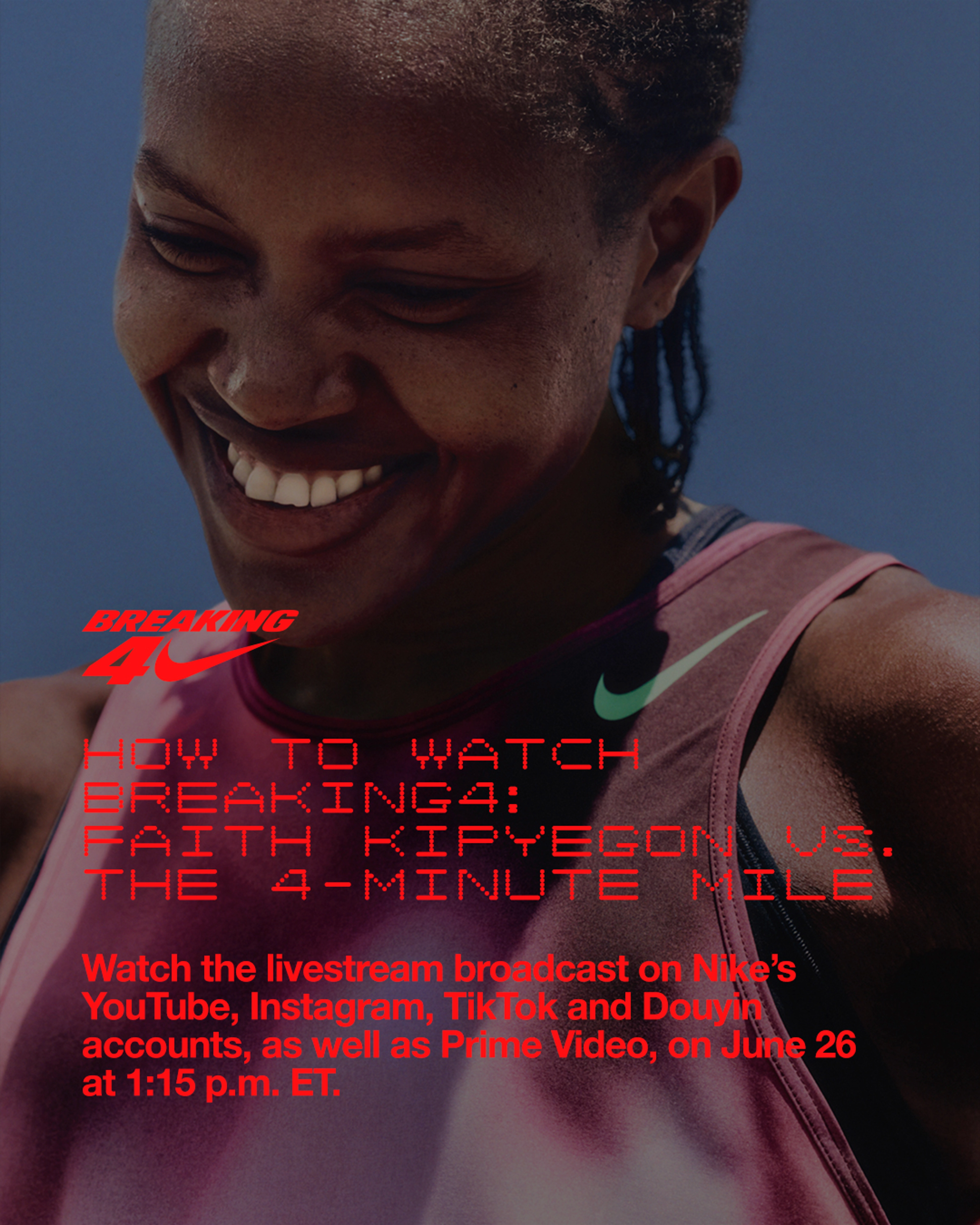 Nike and Box To Box Films will release an initial 50-minute episode of the limited-series documentary Breaking4: Faith Kipyegon vs. the 4-Minute Mile 20 June on Prime Video. The second episode of the limited series will premiere in July.