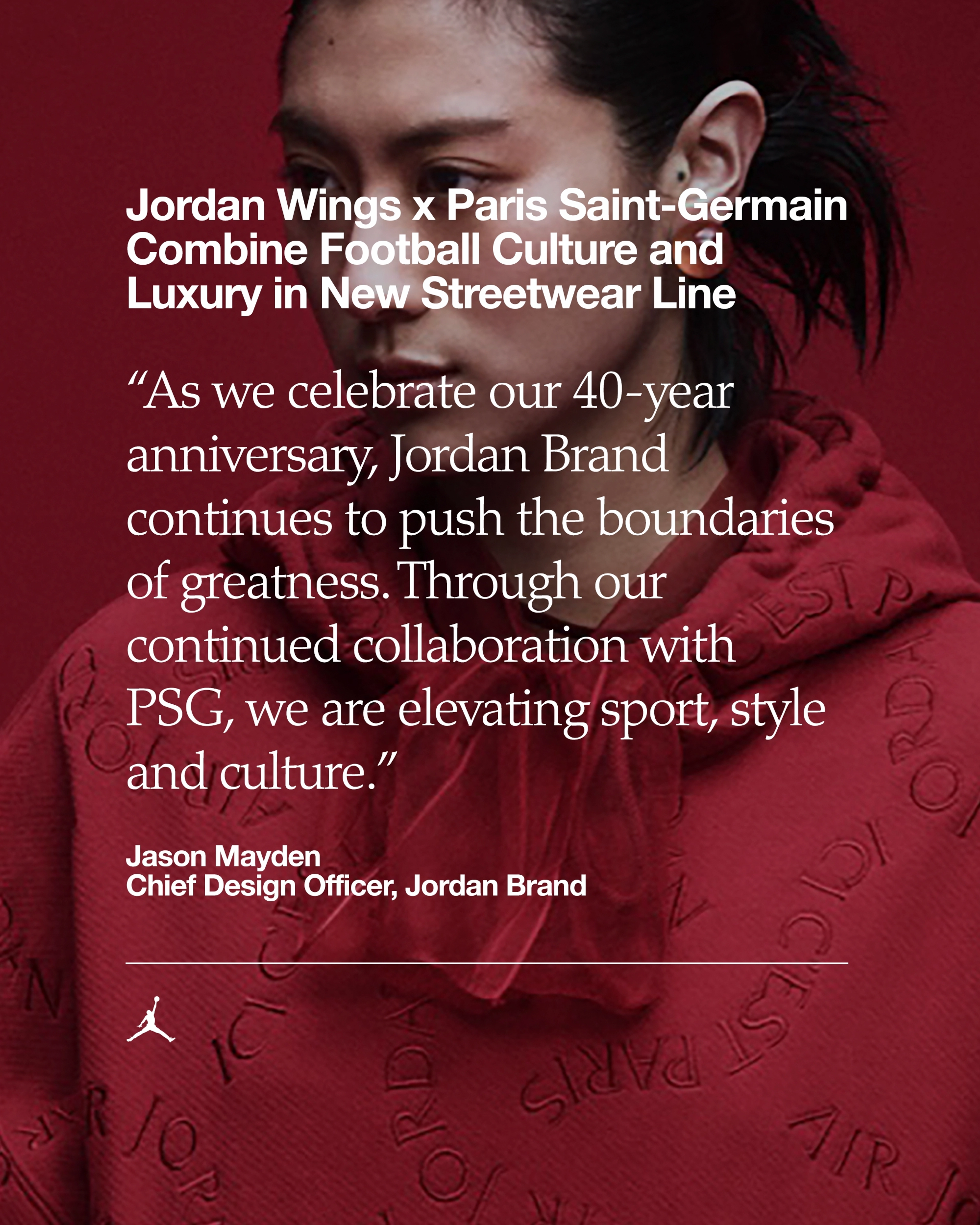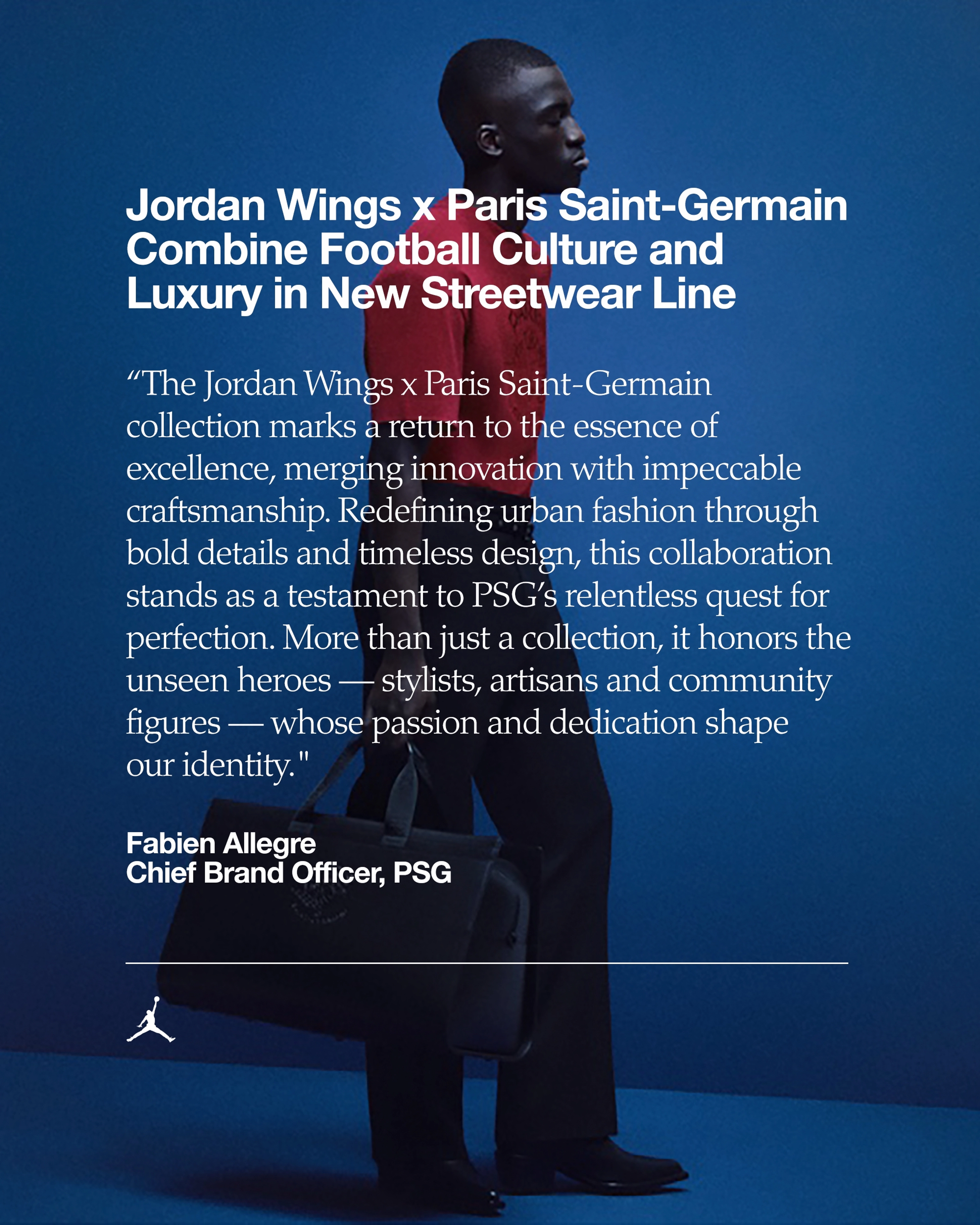 "The Jordan Wings x Paris Saint-Germain Collection marks a return to the essence of excellence, merging innovation with impeccable craftsmanship", says Fabien Allegre, Chief Brand Officer, PSG. "Redefining urban fashion through bold details and timeless design, this collaboration stands as a testament to PSG's relentless quest for perfection. More than just a collection, it honours the unseen heroes—stylists, artisans and community figures—whose passion and dedication shape our identity".