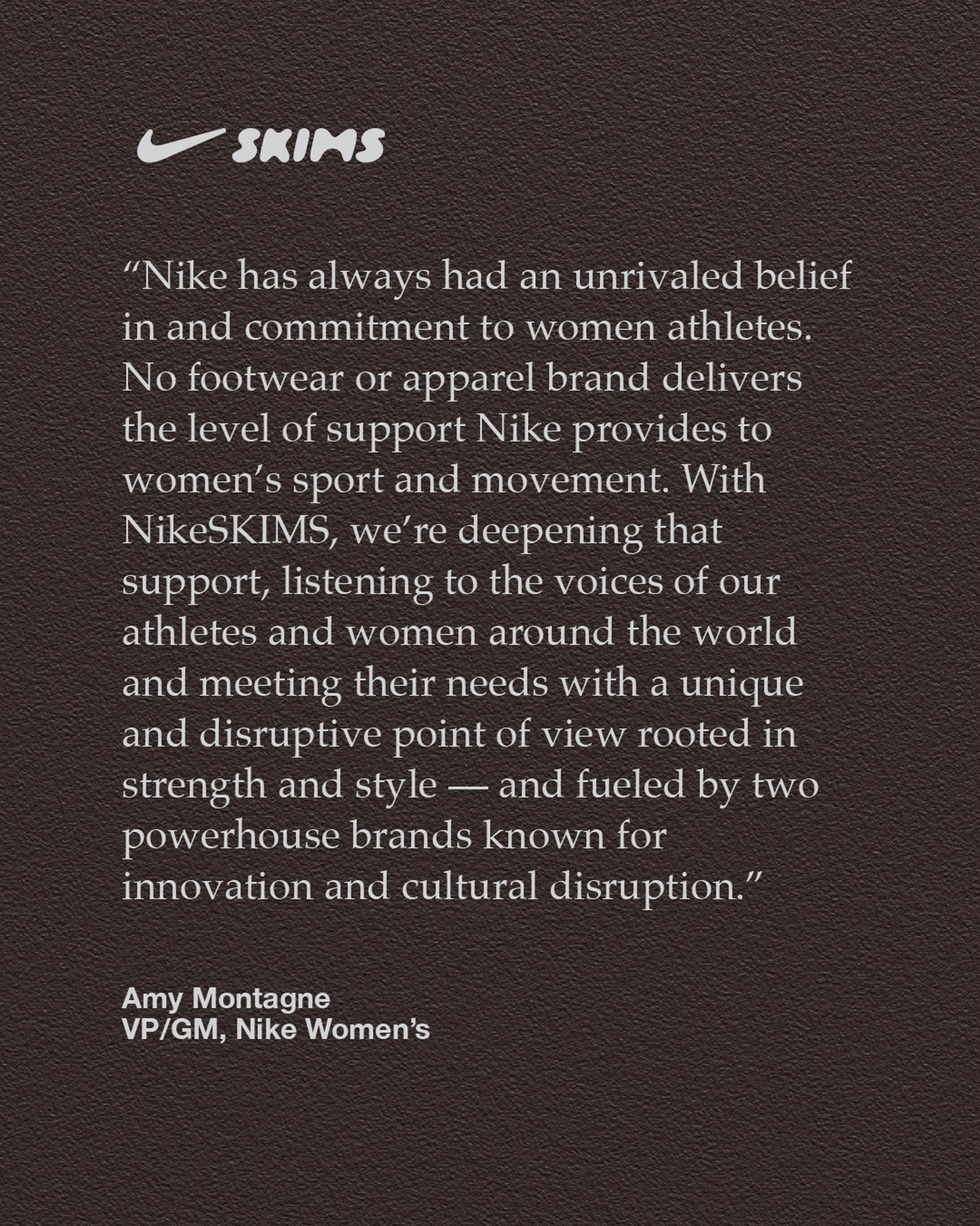 "Nike has always had an unrivalled belief in and commitment to women athletes", says Amy Montagne, VP/GM, Nike Women's. "No footwear or apparel brand delivers the level of support Nike provides to women's sport and movement. With NikeSKIMS, we're deepening that support, listening to the voices of our athletes and women around the world and meeting their needs with a unique and disruptive point of view rooted in strength and style—and fuelled by two powerhouse brands known for innovation and cultural disruption".