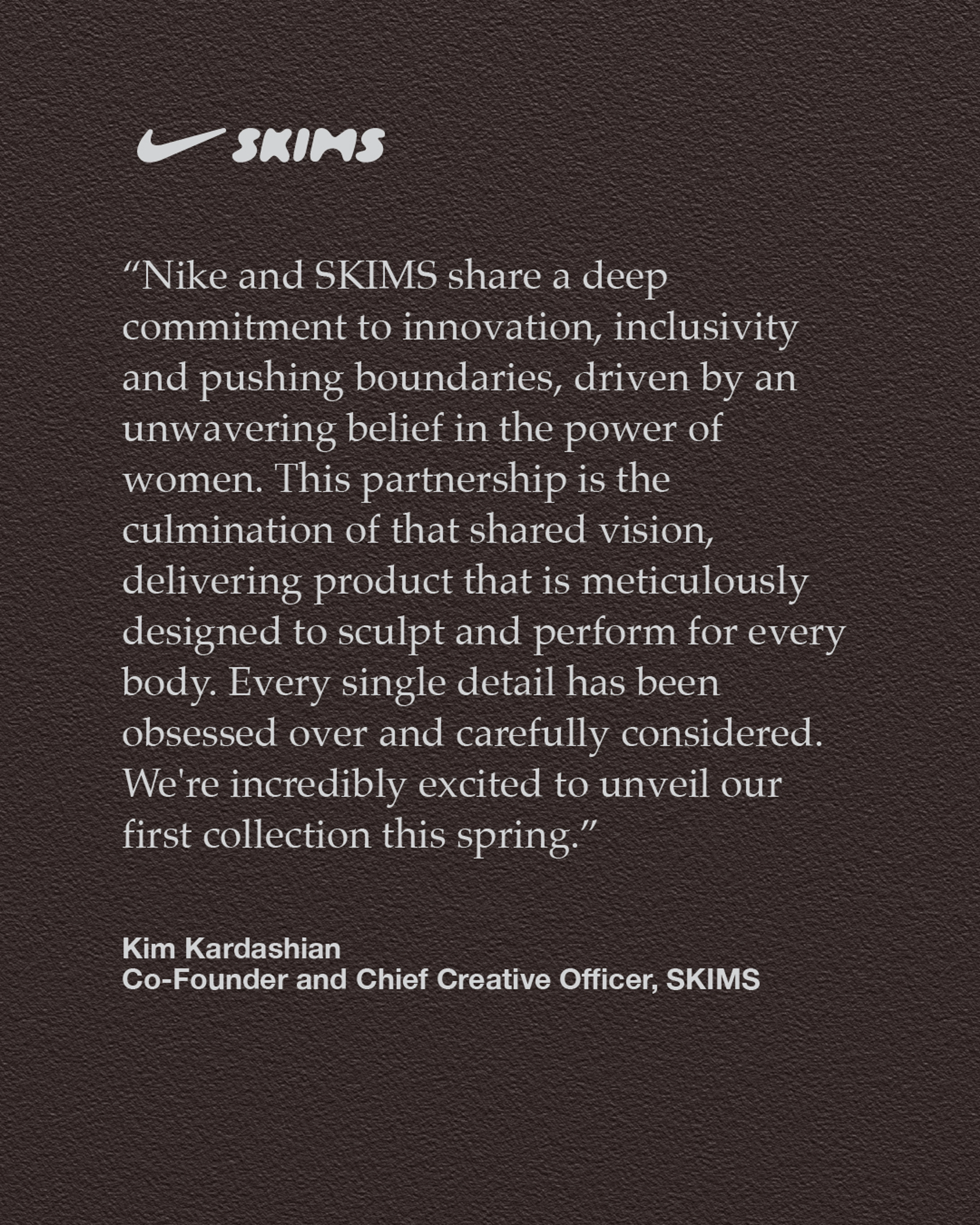 "Nike and SKIMS share a deep commitment to innovation, inclusivity and pushing boundaries, driven by an unwavering belief in the power of women", says Kim Kardashian, co-founder and chief creative officer, SKIMS. "This partnership is the culmination of that shared vision, delivering product that is meticulously designed to sculpt and perform for every body. Every single detail has been obsessed over and carefully considered. We're incredibly excited to unveil our first collection this spring".
