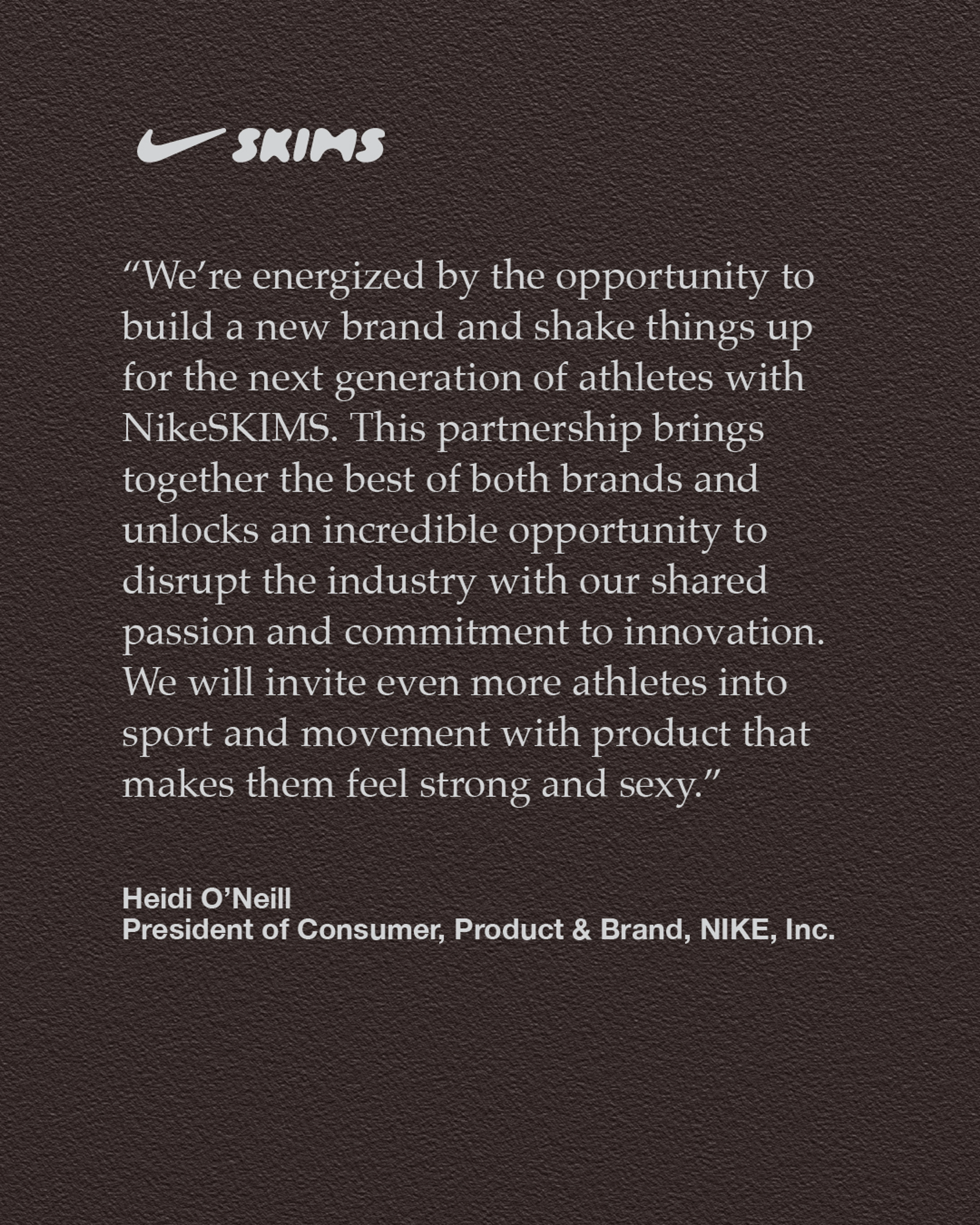 "We're energised by the opportunity to build a new brand and shake things up for the next generation of athletes with NikeSKIMS", says Heidi O'Neill, president of consumer, product and brand, NIKE, Inc. "This partnership brings together the best of both brands and unlocks an incredible opportunity to disrupt the industry with our shared passion and commitment to innovation. We will invite even more athletes into sport and movement with product that makes them feel strong and sexy".