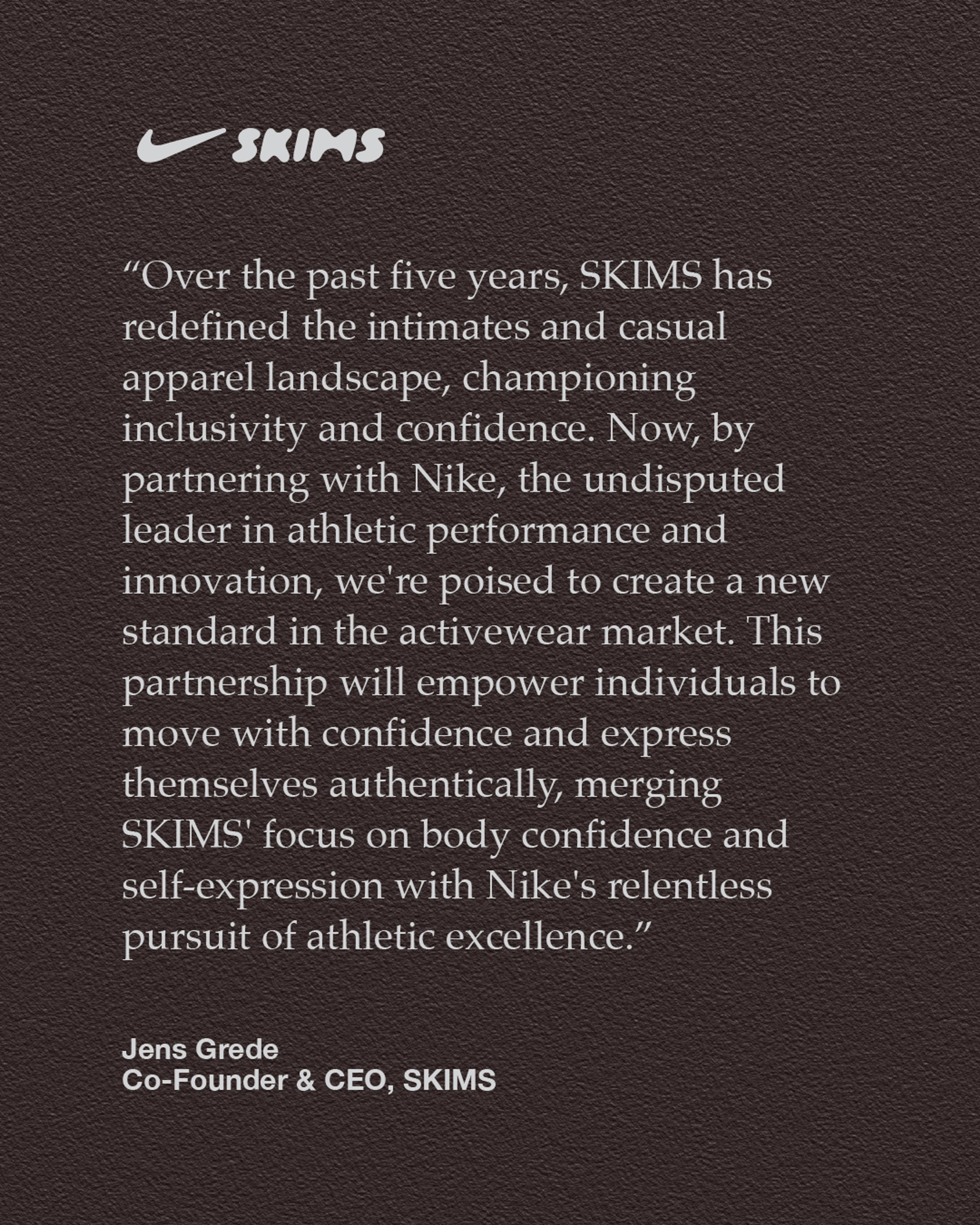 "Over the past five years, SKIMS has redefined the intimates and casual apparel landscape, championing inclusivity and confidence", says Jens Grede, co-founder and CEO, SKIMS. "Now, by partnering with Nike, the undisputed leader in athletic performance and innovation, we're poised to create a new standard in the activewear market. This partnership will empower individuals to move with confidence and express themselves authentically, merging SKIMS's focus on body confidence and self-expression with Nike's relentless pursuit of athletic excellence".