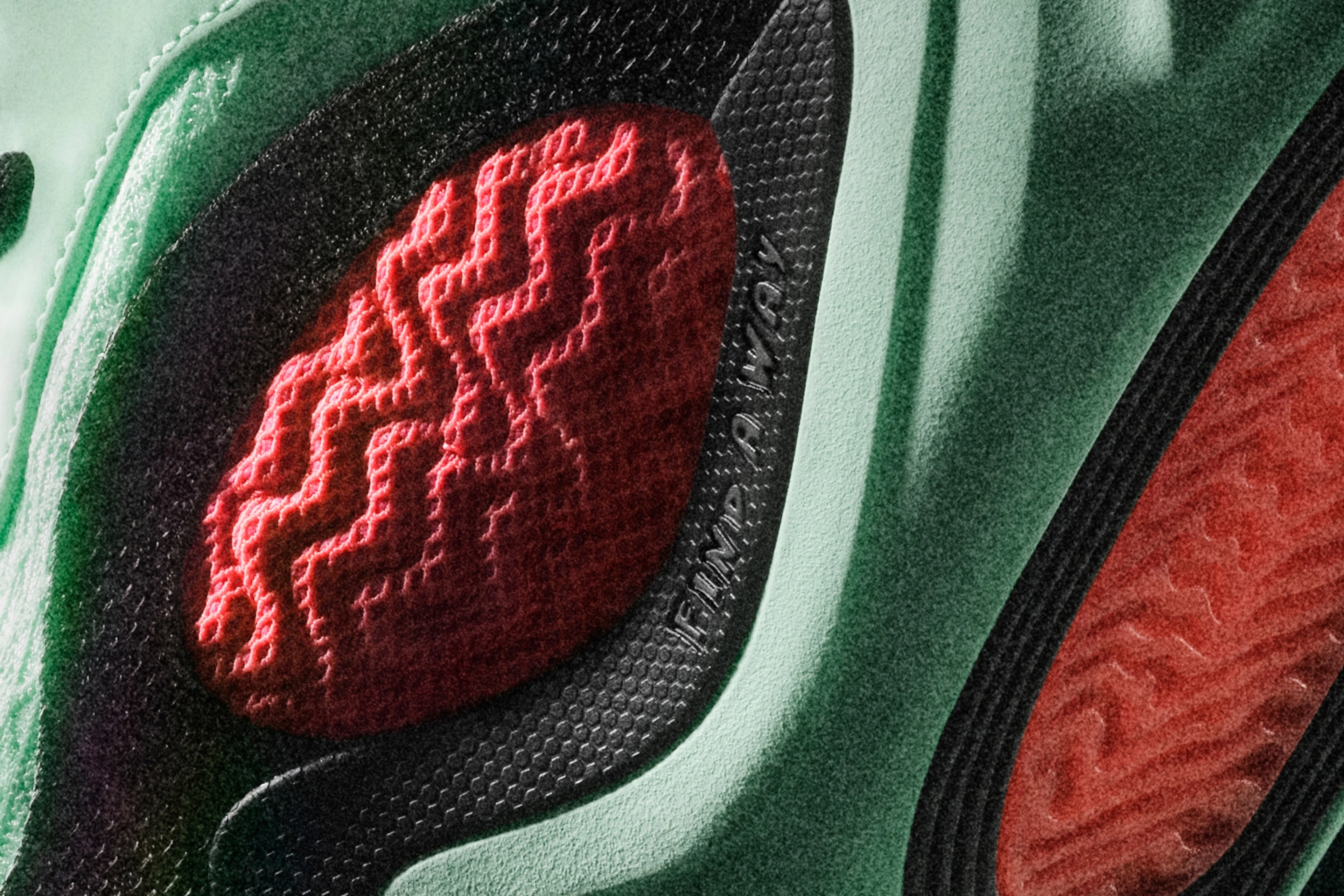 The upper features a series of large foam and textile pods, which are strategically placed around areas of the foot that experience high pressure when playing basketball. The foam frame that surrounds the pods wraps high, helping to stabilise the foot during multi-directional movement without limiting mobility or feel.