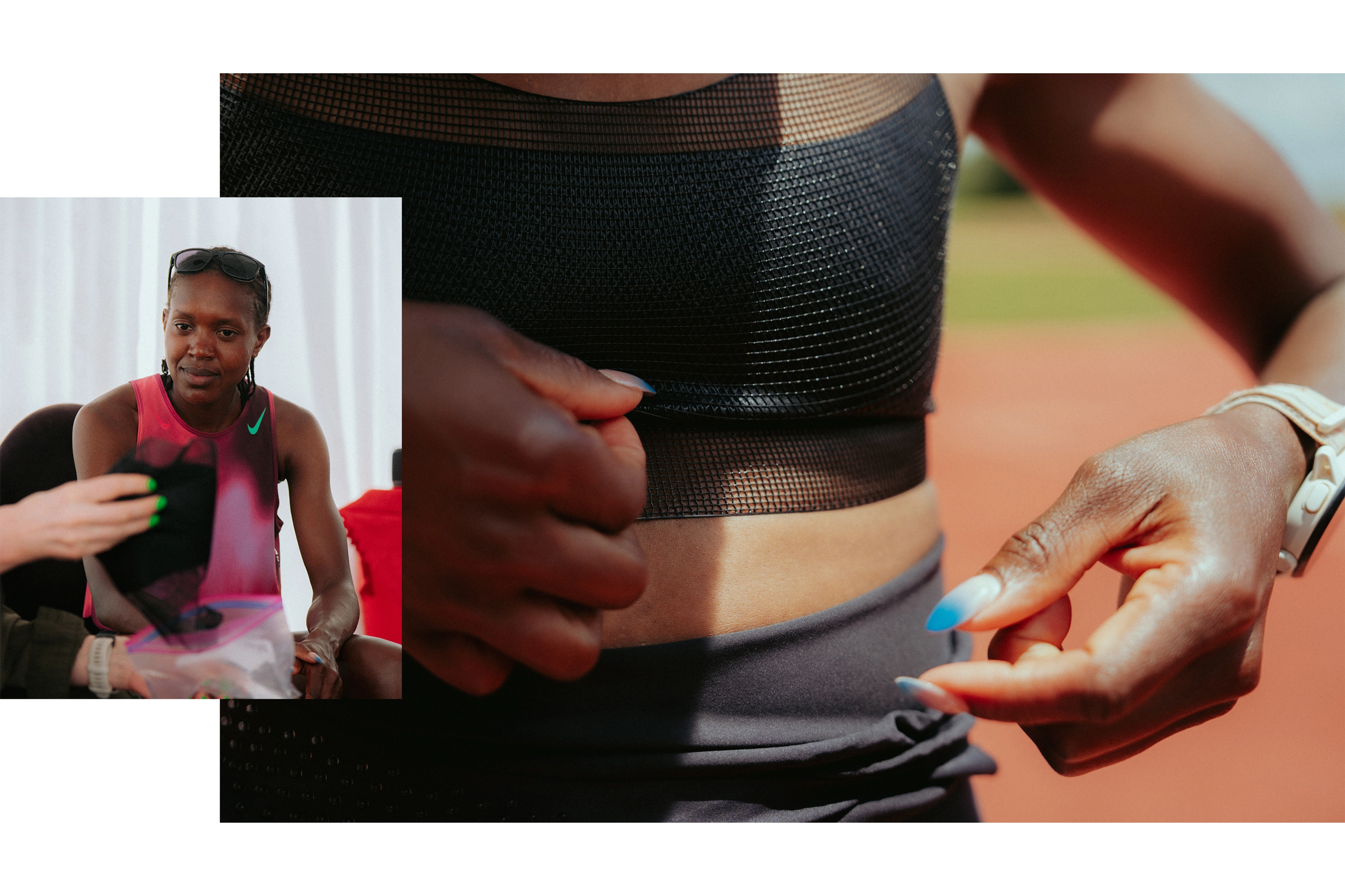 The Innovation team gave Kipyegon the full gamut of Nike tools during her training leading up to the attempt. Some are at the modern edge of athlete recovery methodology, such as Nike’s Hyperice boots, a heat and air-compression massage tool. Others, such as Nike’s new Vomero Premium shoe, were ideal for recovery runs or long mileage. Then there were the innovations that were expedited so Kipyegon could benefit from their advantages before and during the race. Nike FlyWeb, a new 3D-printed material used for Kipyegon’s sports bra, was moved forward in its production cycle for Kipyegon to train in it. “This attempt is the first time Nike FlyWeb will be tested on the world stage, and in a one-of-one bra,” says Janett Nichol, VP of Apparel Innovation. “Faith gave us a rare opportunity: She would not only wear it, she’d help us evolve it.”