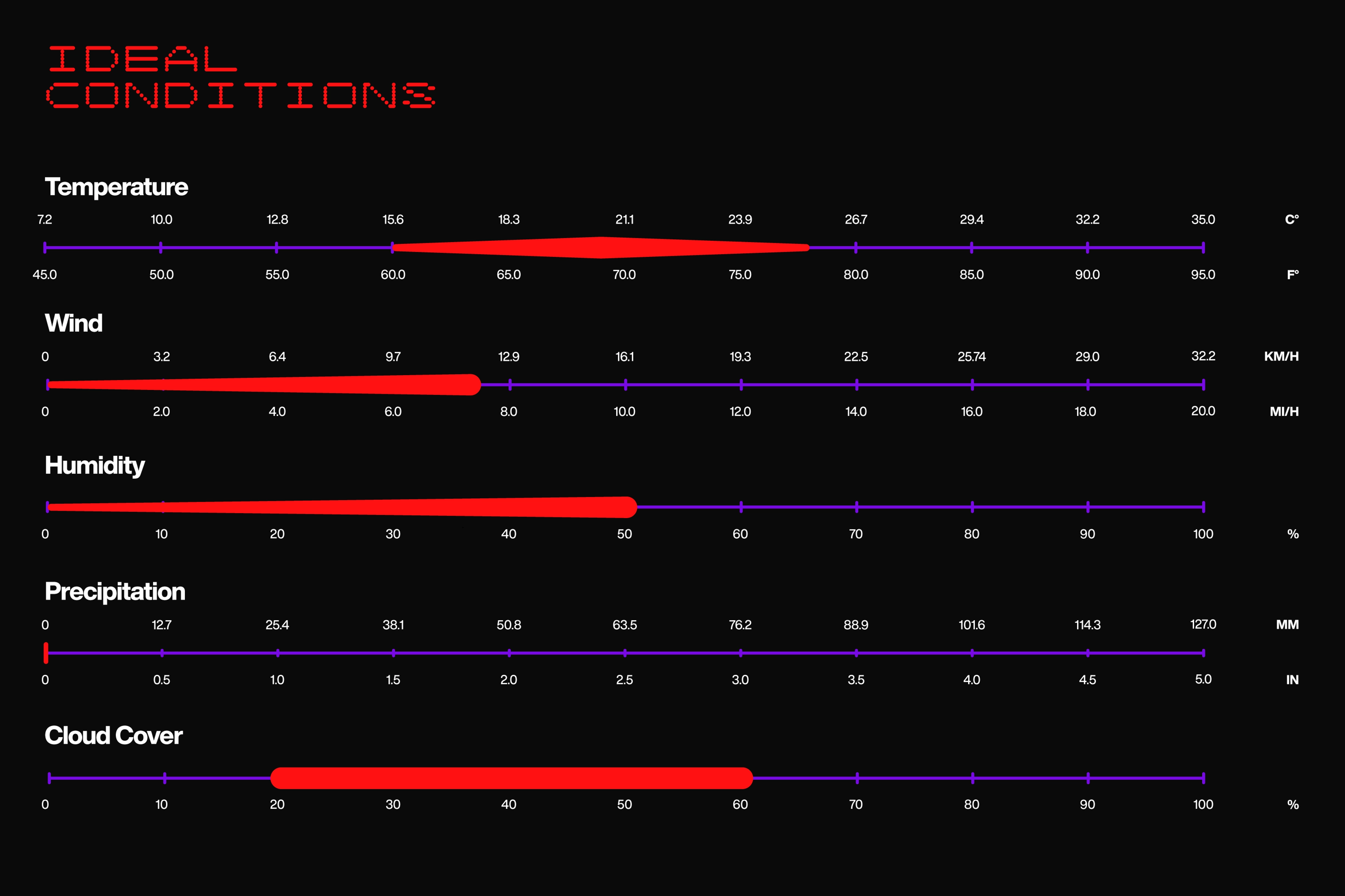 Weather conditions on race day can be the dealbreaker for achieving fast times. Heat, wind and rain can all put an additional load on an athlete. Too much heat is a thermal burden that leads to overexertion. Too much wind — and around a track, there will always be a headwind at a certain point — creates drag forces that slow runners down. Weather doesn’t come on demand, of course, and the Nike team knew the ideal geographic location of the attempt would need to cross off as many criteria as possible: zero rain, less than 12 km/hr wind, moderate temperatures.