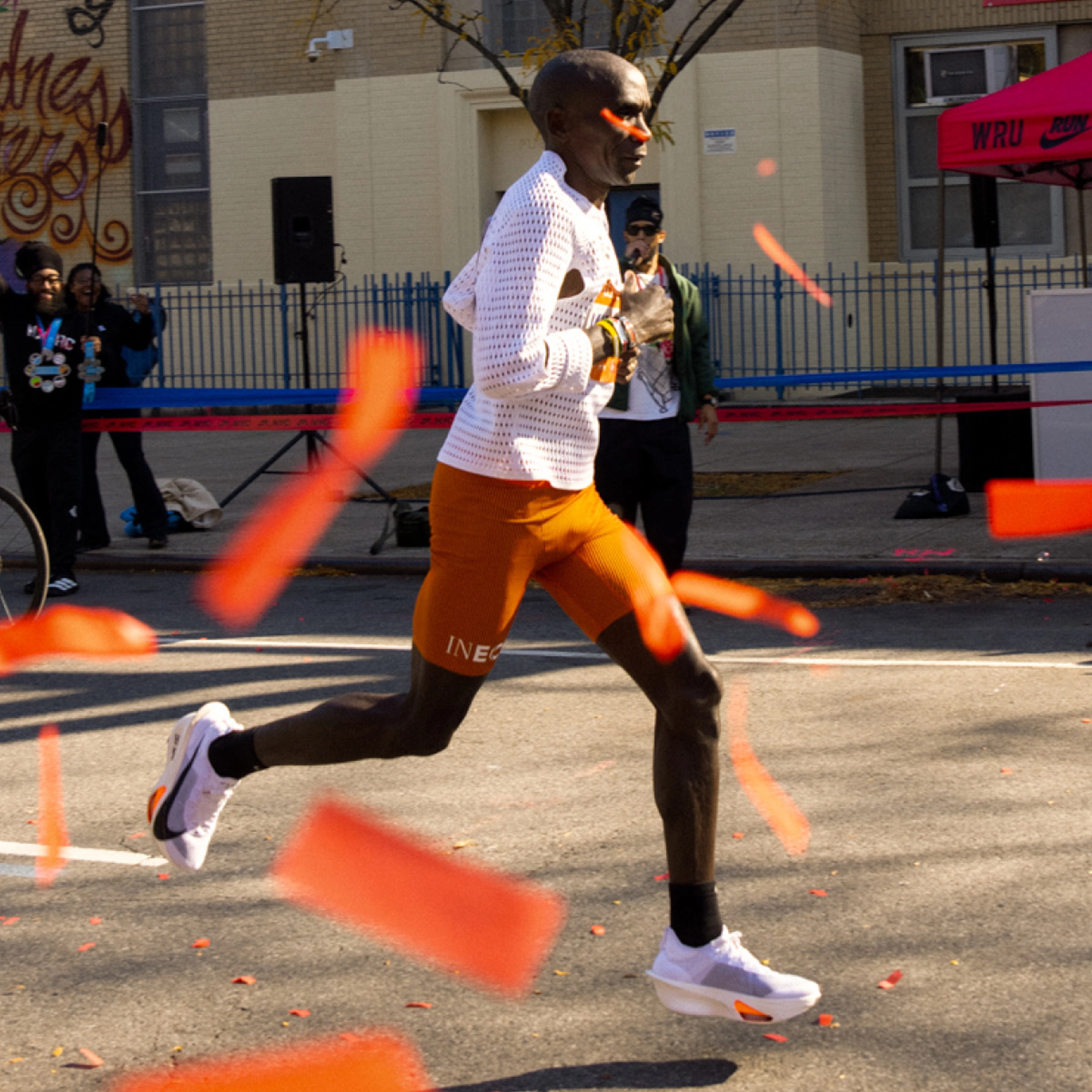Typically a first tester for Nike’s latest footwear innovations, Eliud will take on NYC with a tool borrowed from a different toolbox: a custom Nike Radical AirFlow top, a material innovation introduced in this summer’s trail running season through All Conditions Gear (ACG). The origin for the one-of-one top is simple. In July of 2025, a team of Nike product experts were preparing to fly to Eliud’s training camp in Kenya to show him new product. What if he tried a Radical AirFlow top, they thought? The same kind worn by All Conditions Racing Department athlete Caleb Olson for the 2025 Western States 100-Mile Endurance Run, where he ran the second-fastest course time in the race’s history.