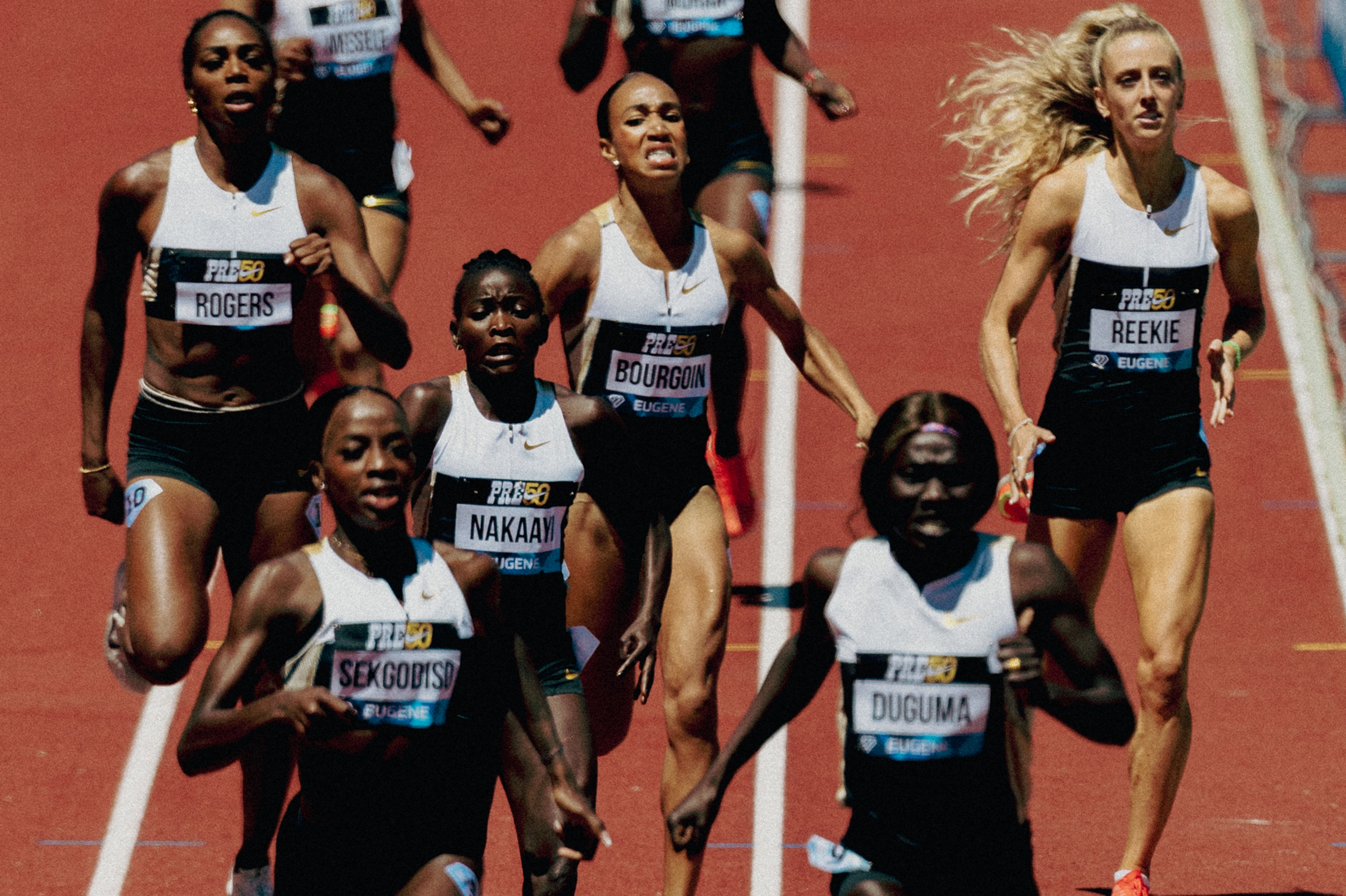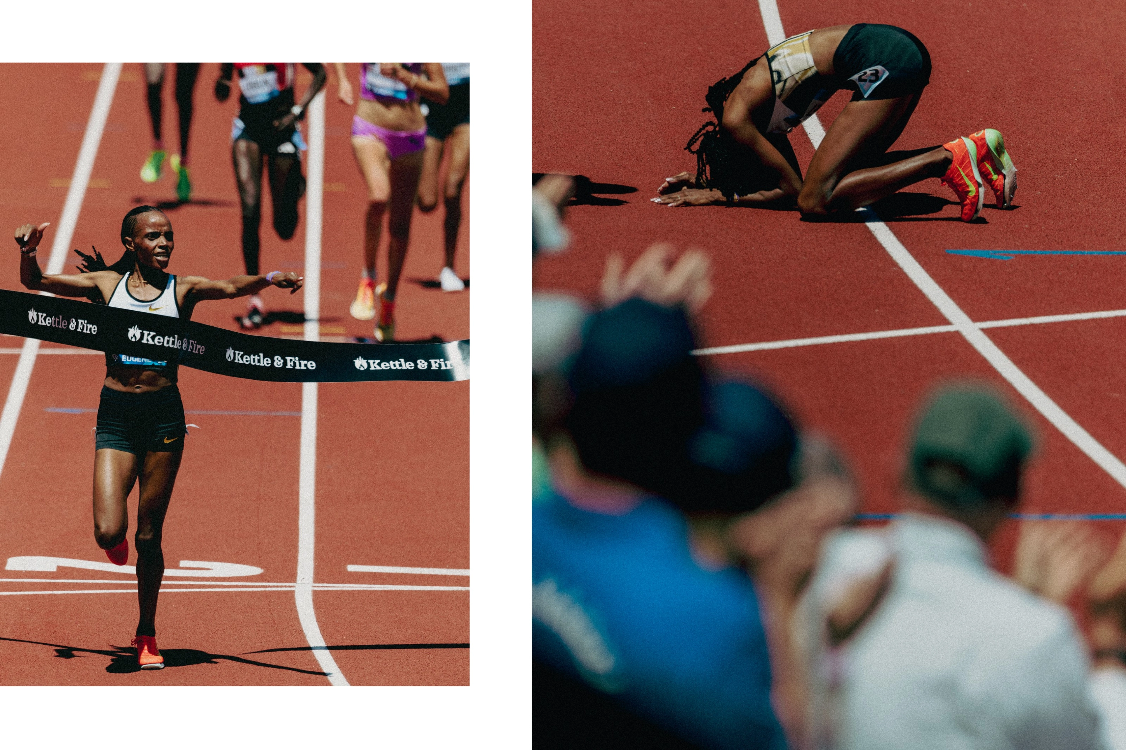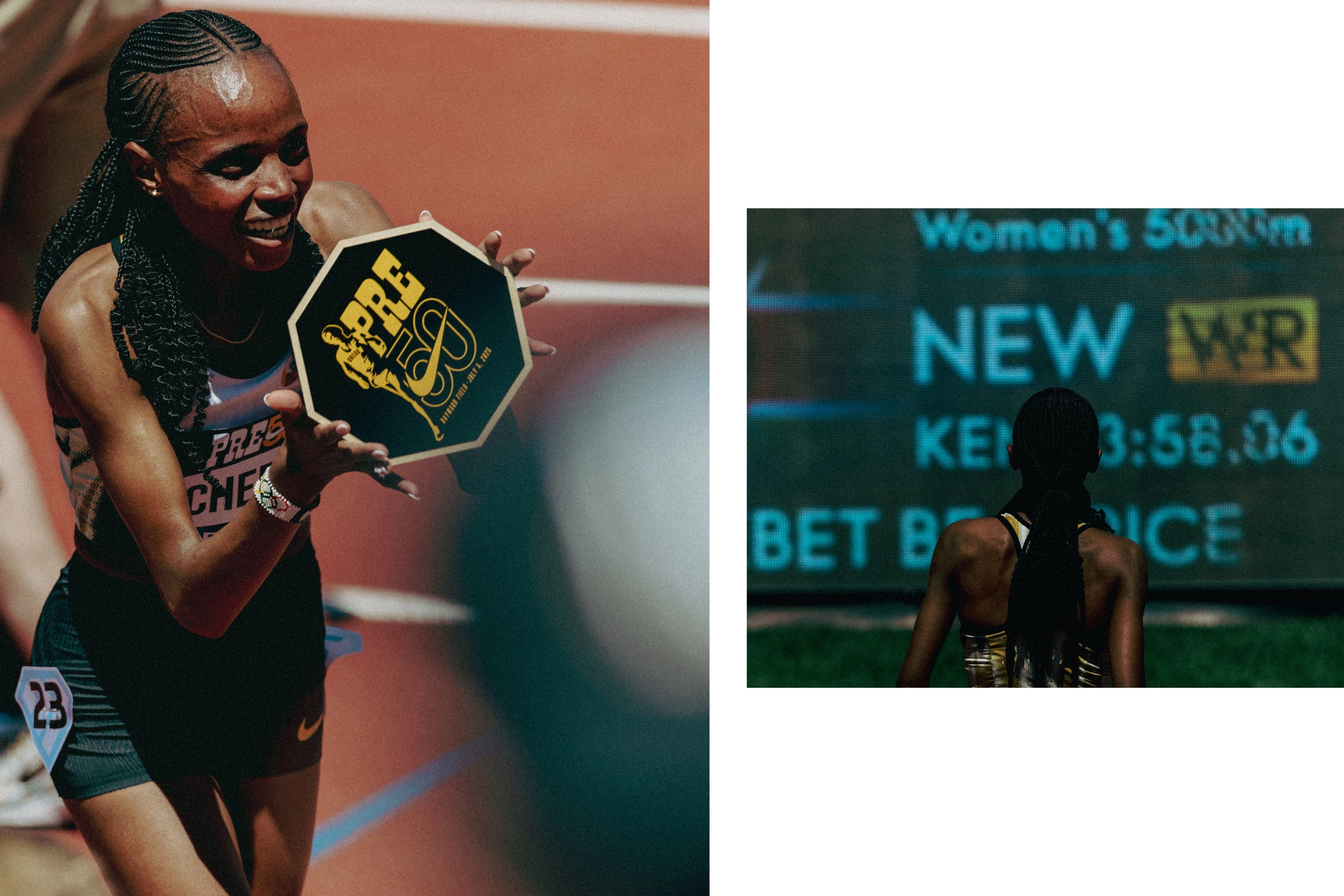 Two world records broken. Nike athlete Faith Kipyegon's 1500m WR, forecast last week during her #Breaking4 attempt, and Beatrice Chebet's 5000m WR. New national records set. Personal bests across the board. All in front of a sold-out crowd at Eugene’s Hayward Field, a venue considered sacred ground in the world of track and field. The 50th anniversary of the Pre Classic was every bit worthy of the meet’s namesake, legendary runner Steve Prefontaine, and the images below show what fans of this sport have always known: For witnessing drama, suspense, electric energy and endless passion, there is nothing better than the athlete magic of track and field.