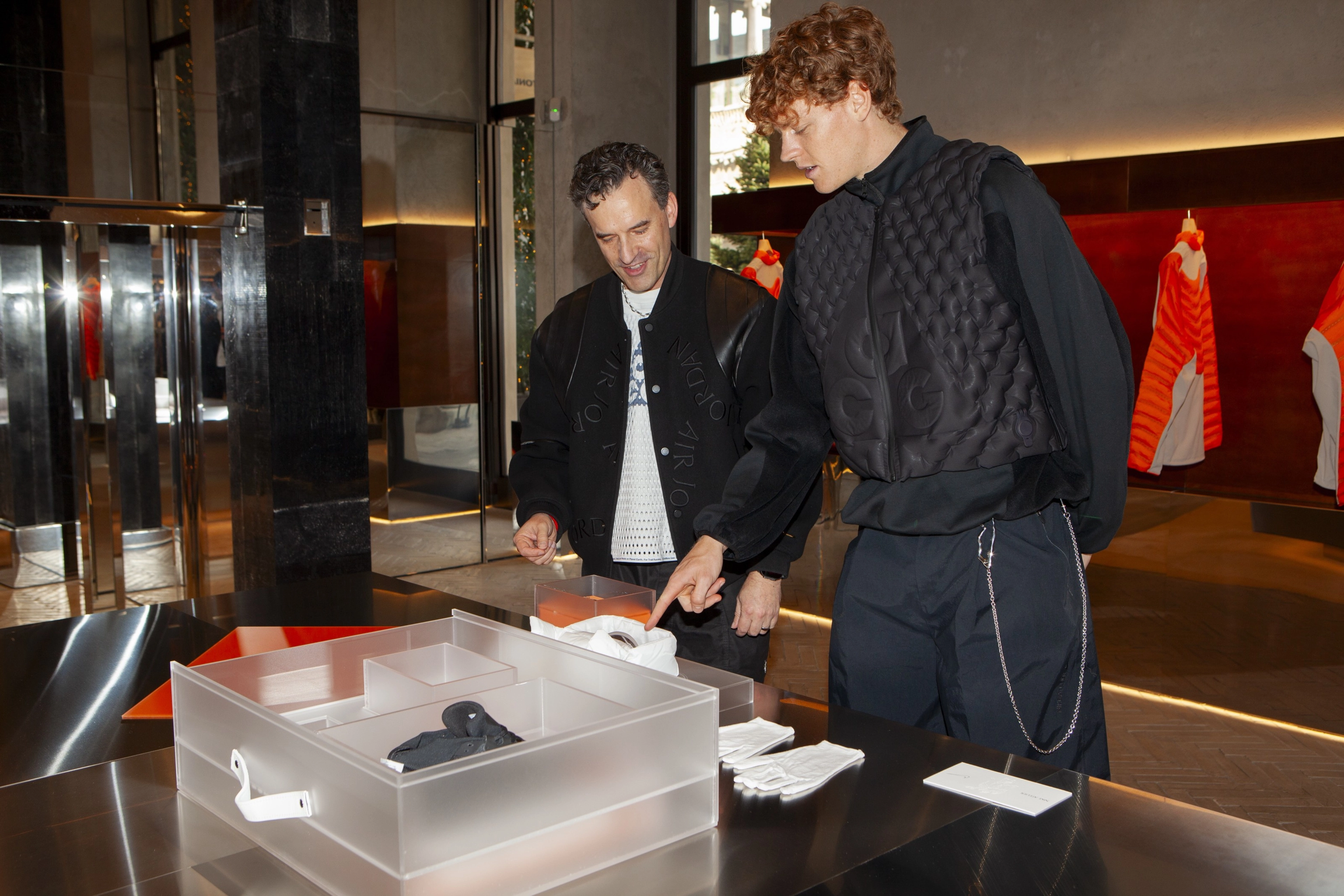 Martin Lotti shows Sinner the final Nike Atelier accessories, including performance sunglasses with a light, stainless steel frame and unobstructed peripheral view — perfect for mountain sports.