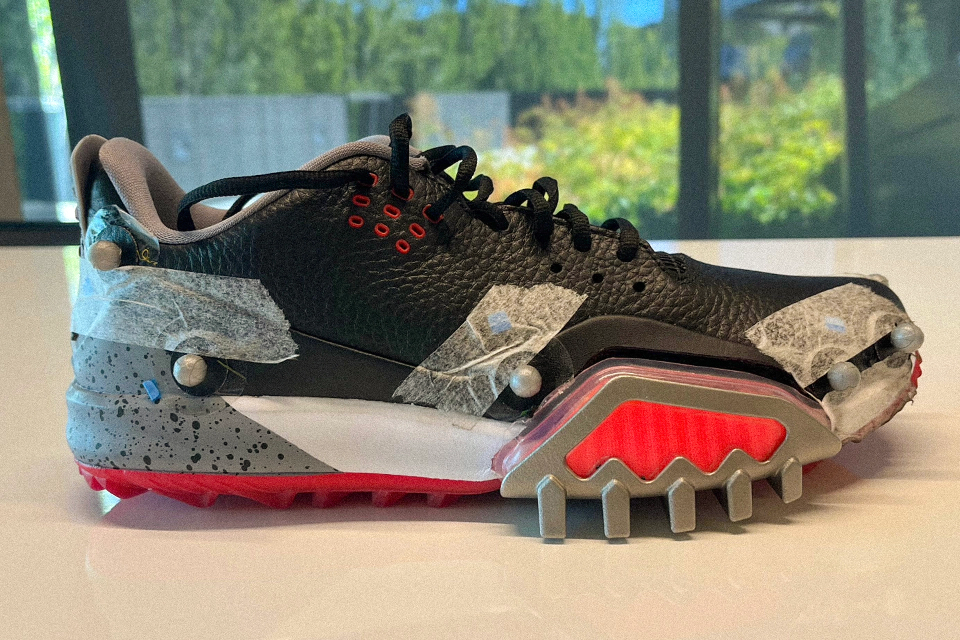 The team began stripping away, one by one, the spring-loaded components of the turntable and replacing them with Zoom units adhered to the lateral sidewall. Around the same time, the NXT Kitchen began creating a range of shoe prototypes that experimented with laterally placed Zoom Air. Some of the results were borderline unbelievable. One of them, modified from a Jordan ADG 3 Golf, had two Zoom units bolted onto the shoe and was overlayed with fang-like traction spikes.