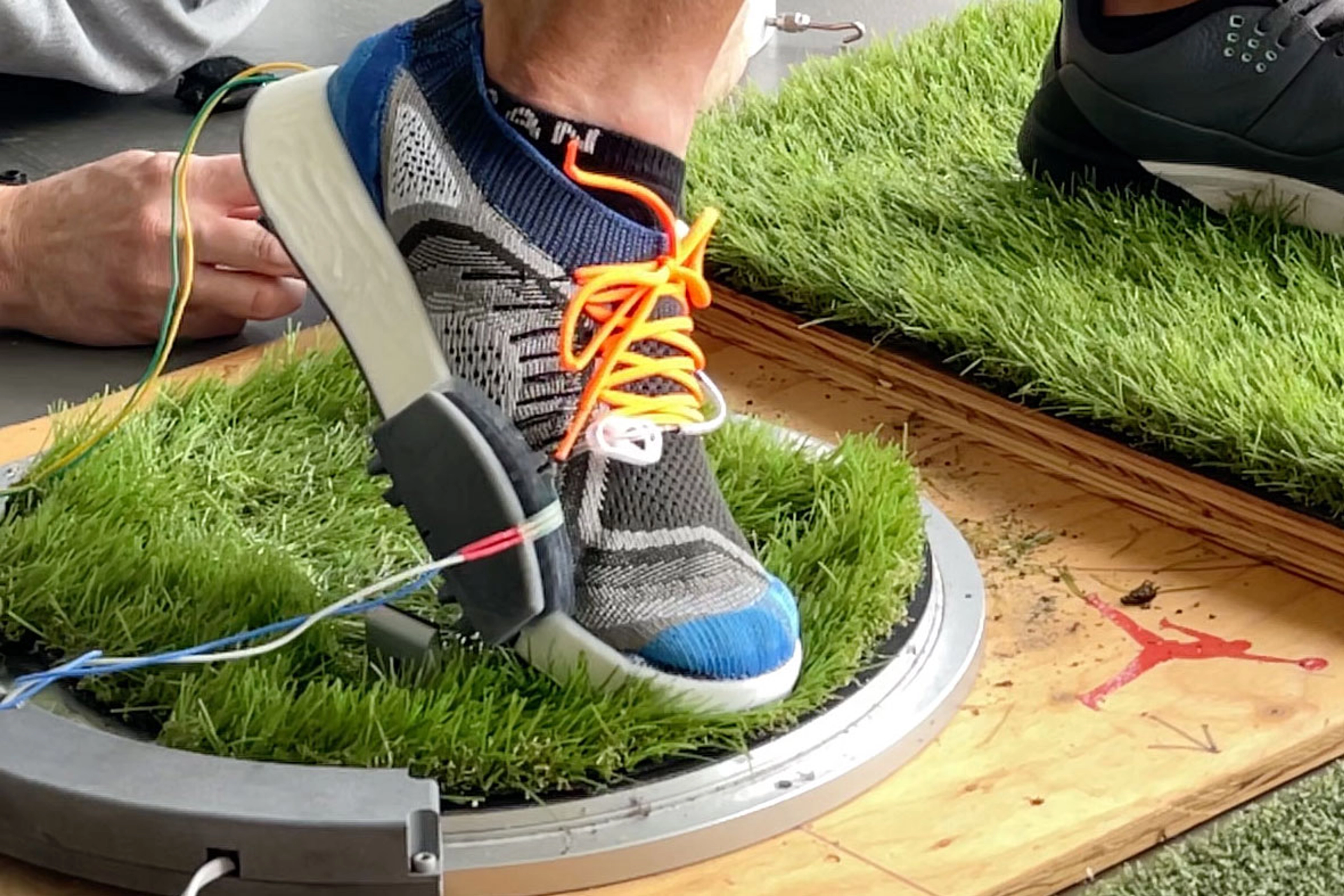 True to form, the NXT team improvised, creating a turntable gauge to spin from a radial point. They backed the trail foot against a spring-loaded sidewall where the lateral forefoot and the back quarter panel were both secured. As a golfer swung, they’d drive off their back foot, registering the force via a gauge fixed to the ankle.