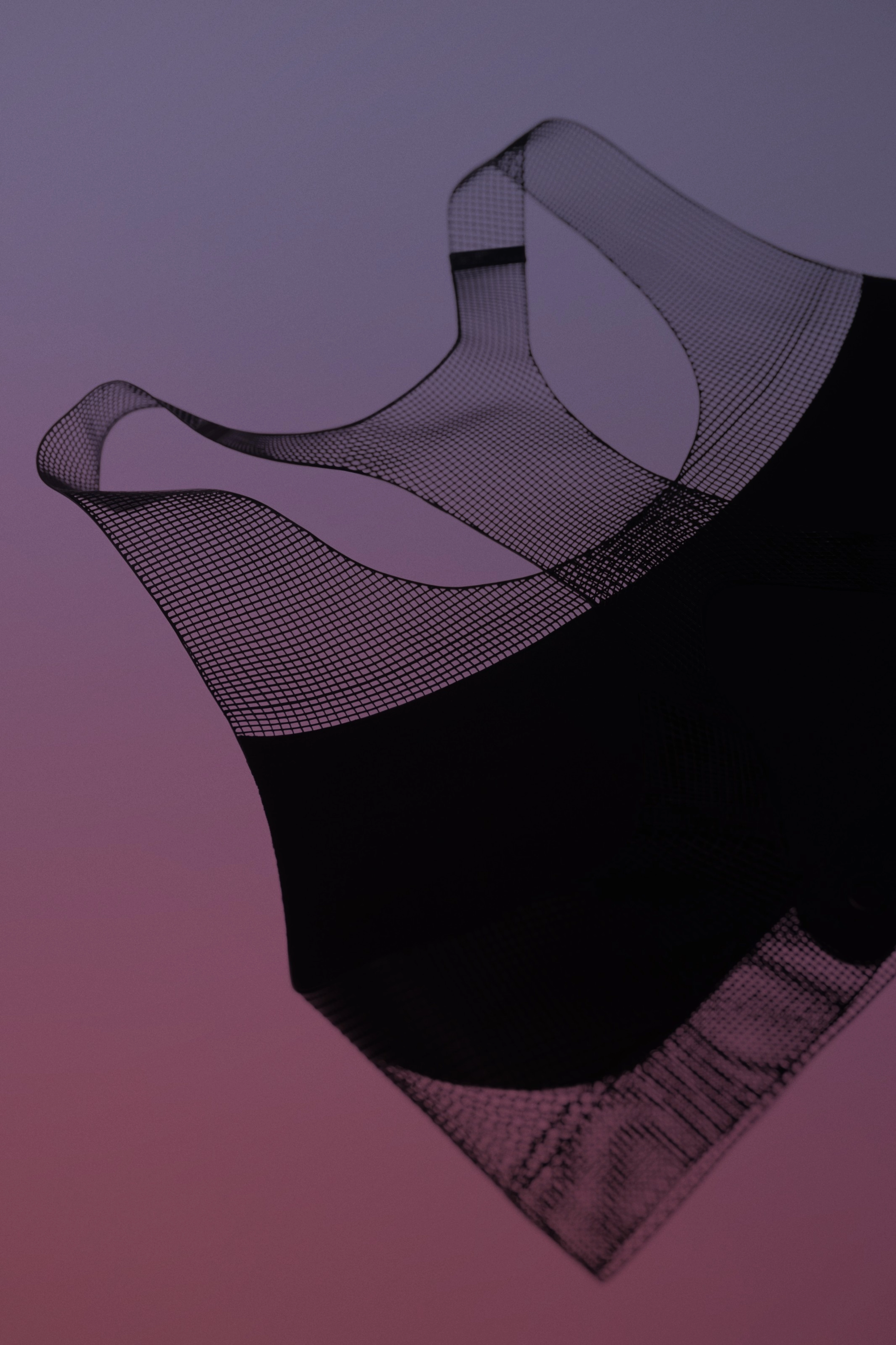 The Nike FlyWeb bra is an ode to minimalism. The FlyWeb material is one single, seamless layer, built through computational design so that Nike designers could control the fit and support down to the millimeter, adjusting density, airflow and stretch across different zones of the garment.
