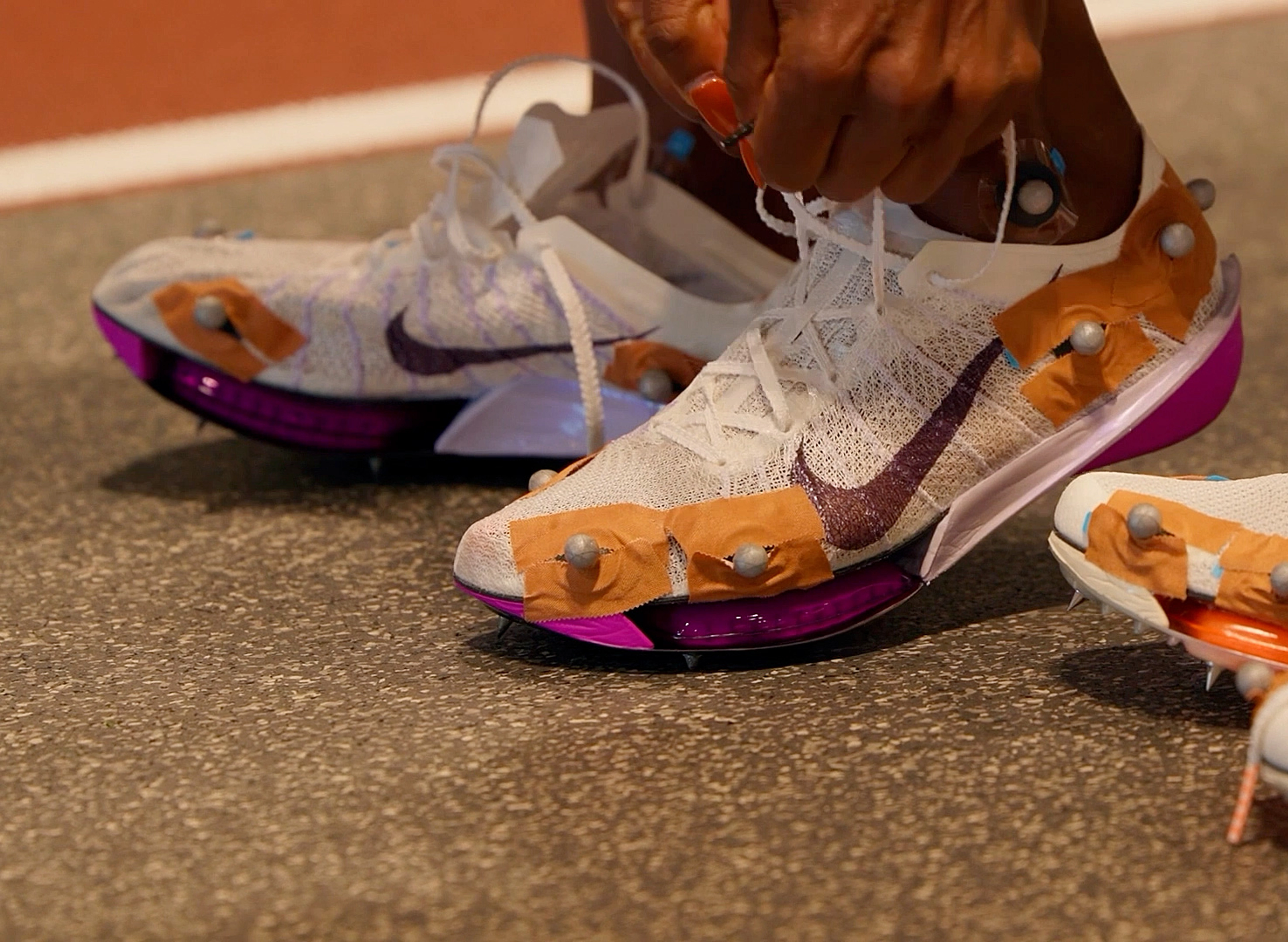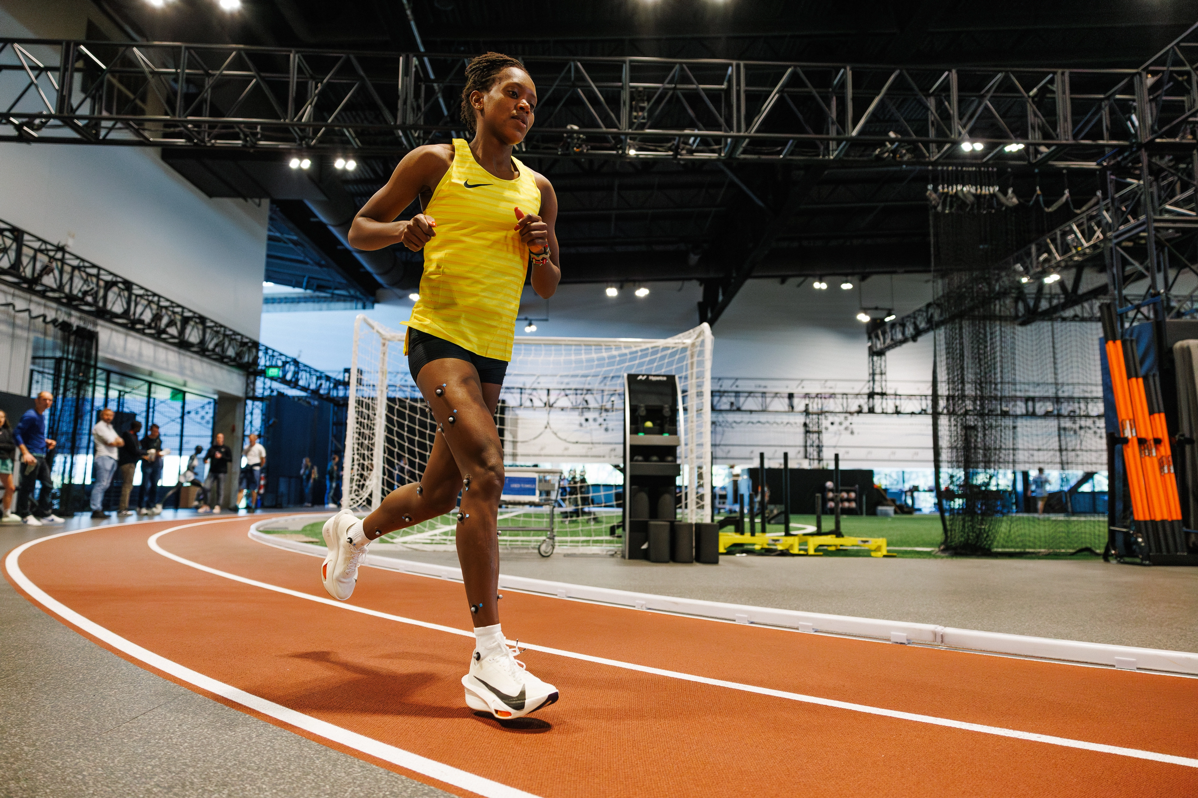 An athlete like Faith Kipyegon makes running look effortless. The NSRL track's capabilities help scientists quantify the poetry of her elite athleticism. Last year, in preparation for her attempt to break the four-minute mile, Kipyegon visited the NSRL, undergoing multiple tests on the track. Scientists placed mo-cap sensors over her body to analyze how a range of Nike spike prototypes influenced her gait pattern. In another test, a 1080 Sprint machine, a data-informed resistance device, was attached to Kipyegon to measure her power output at full speed. Near the track, Nike researchers tapped into an array of testing tools to measure Kipyegon's aerobic and anaerobic profile, such as her V02 max.
