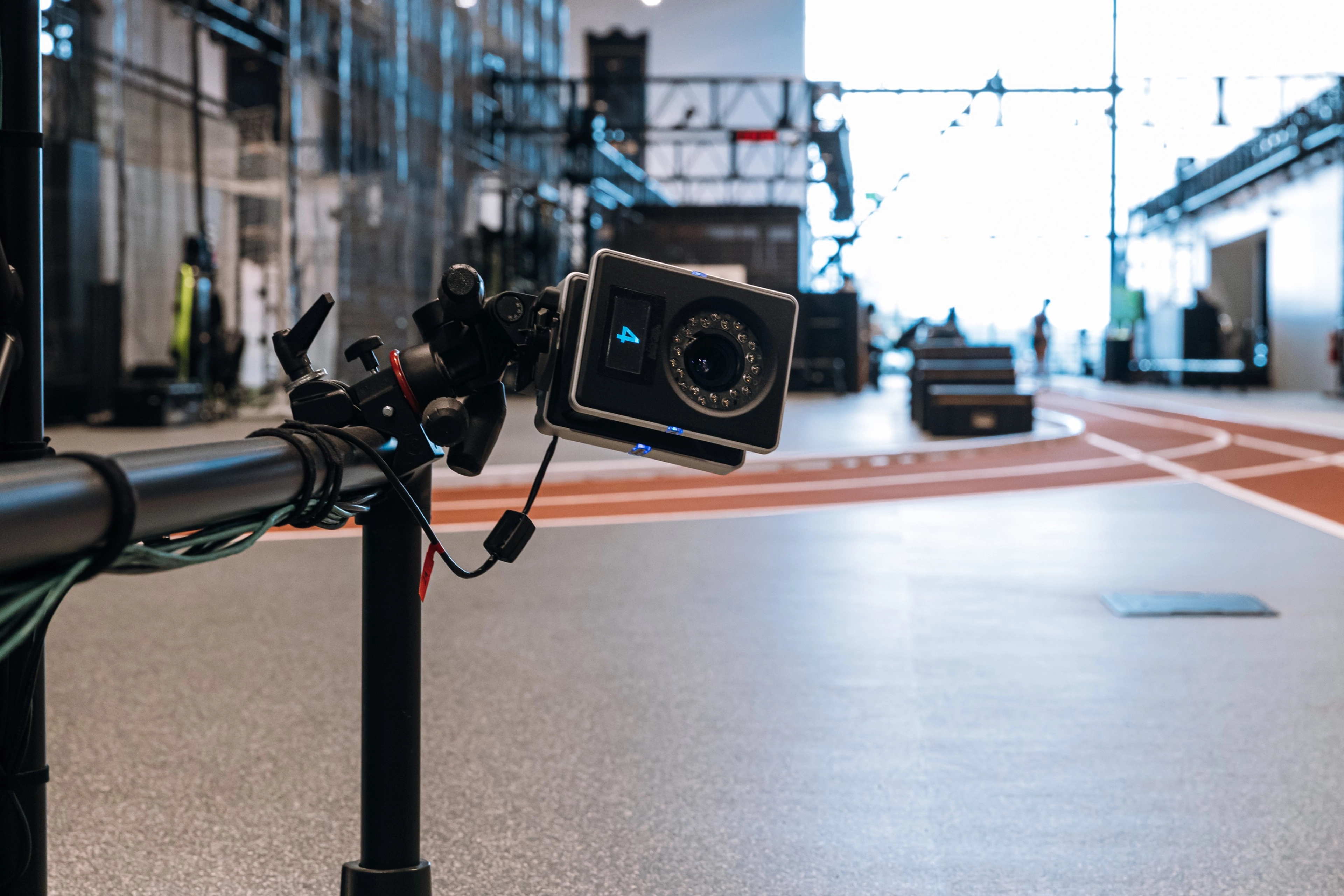 Look up, and you’ll see one example of the track’s capabilities: Above the two lanes and rigged onto steel erectors is a collection of high-res motion-capture (“mo-cap”) cameras that can collect 250 snapshots of reflective marker data per second as an athlete moves around the track. Look down: Force plates situated beneath the track’s rubber surface collect up to 2,500 contact-force data points per second as an athlete hits the ground.