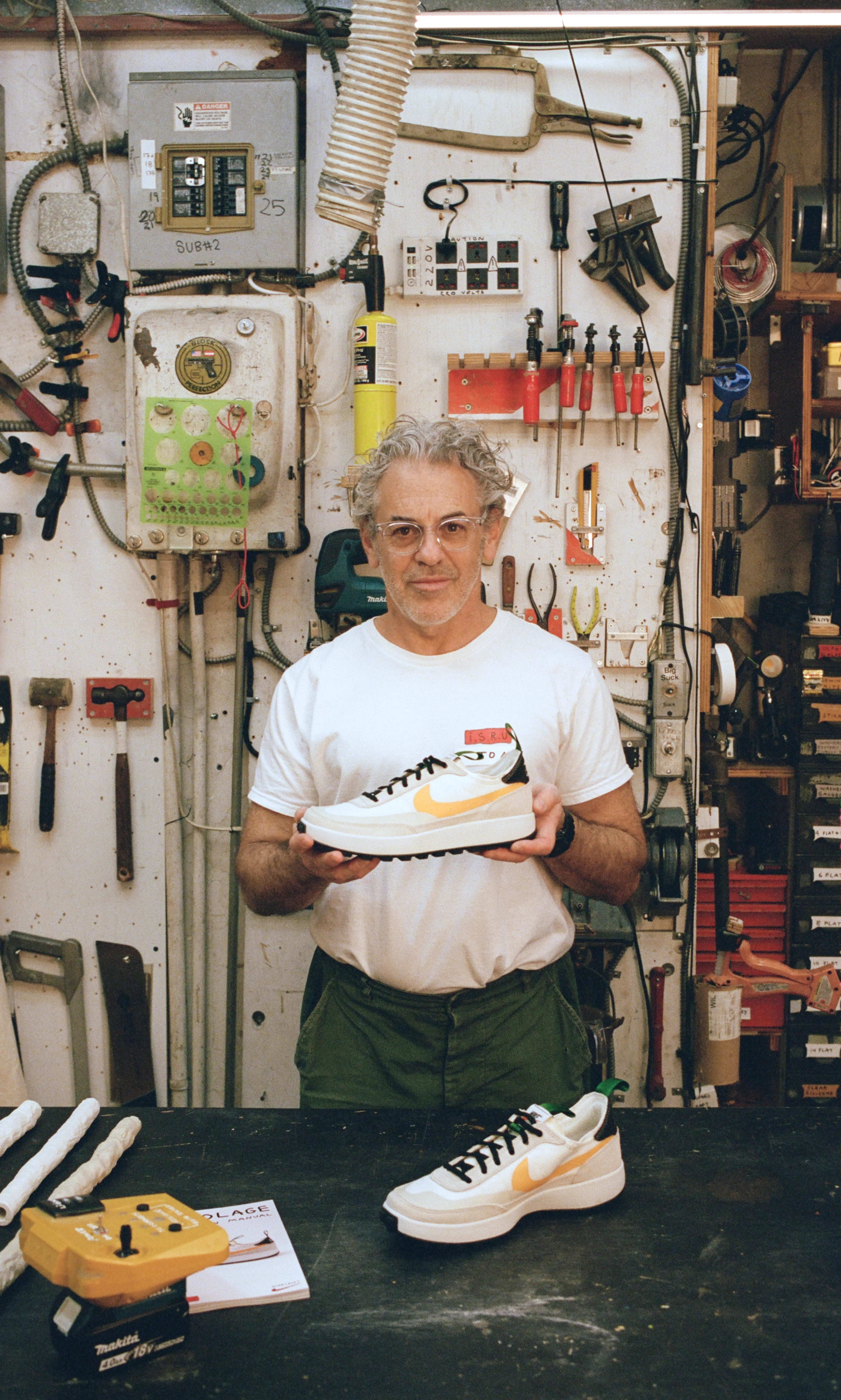 Sachs’ bricolage practice has been the basis of his work as an artist for four decades, and it is a driving force behind his newest collaboration, the NikeCraft General Purpose Shoe “Bricolage.” His studio houses his massive stock of accumulated materials, from found extension cords and Con Edison barriers to dozens of varieties of duct tape gathered across multiple continents.