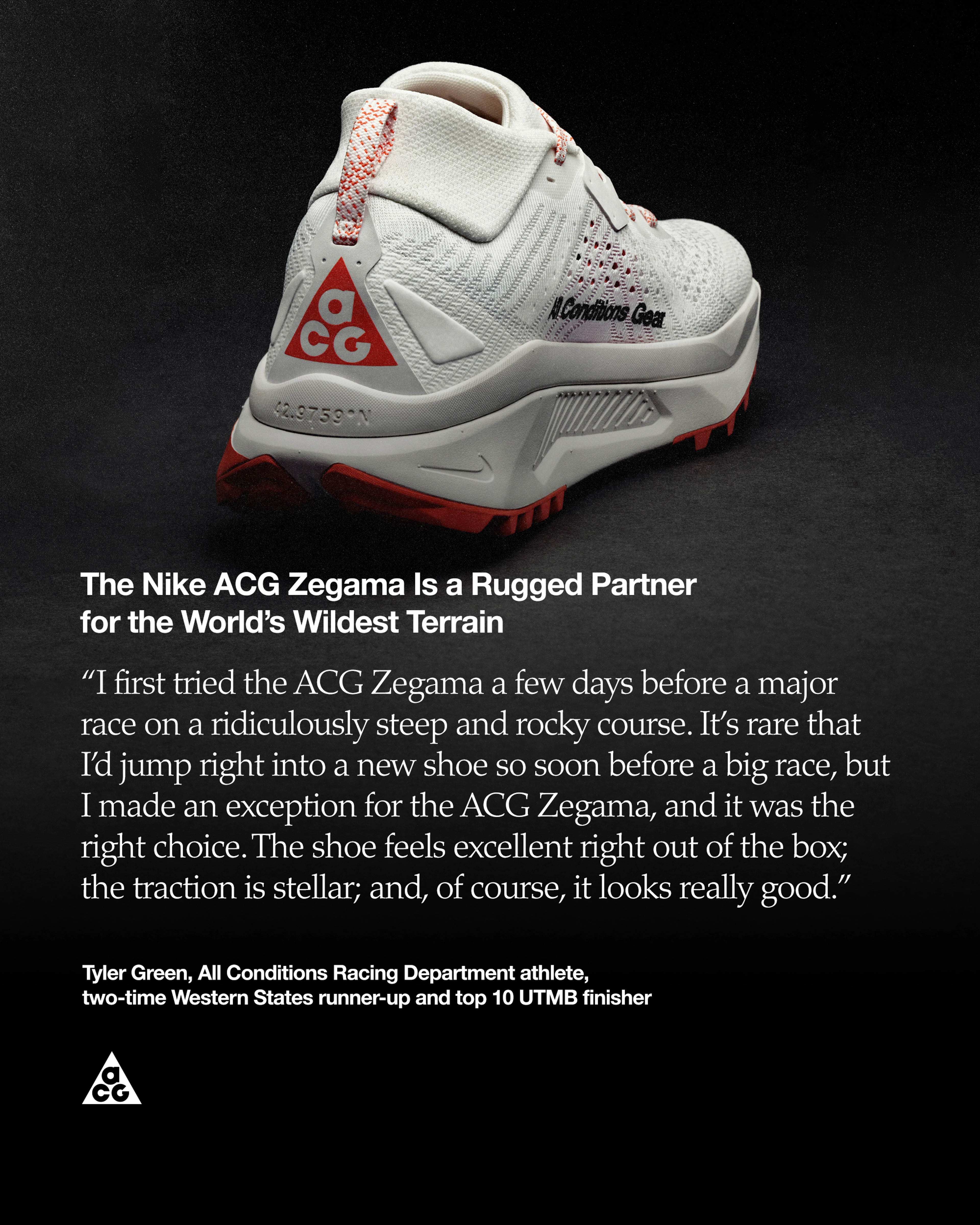 “I first tried the ACG Zegama a few days before a major race on a ridiculously steep and rocky course,” says Tyler Green, All Conditions Racing Department athlete, two-time Western States runner-up and top 10 UTMB finisher. “It’s rare that I’d jump right into a new shoe so soon before a big race, but I made an exception for the ACG Zegama, and it was the right choice. The shoe feels excellent right out of the box; the traction is stellar; and, of course, it looks really good.”