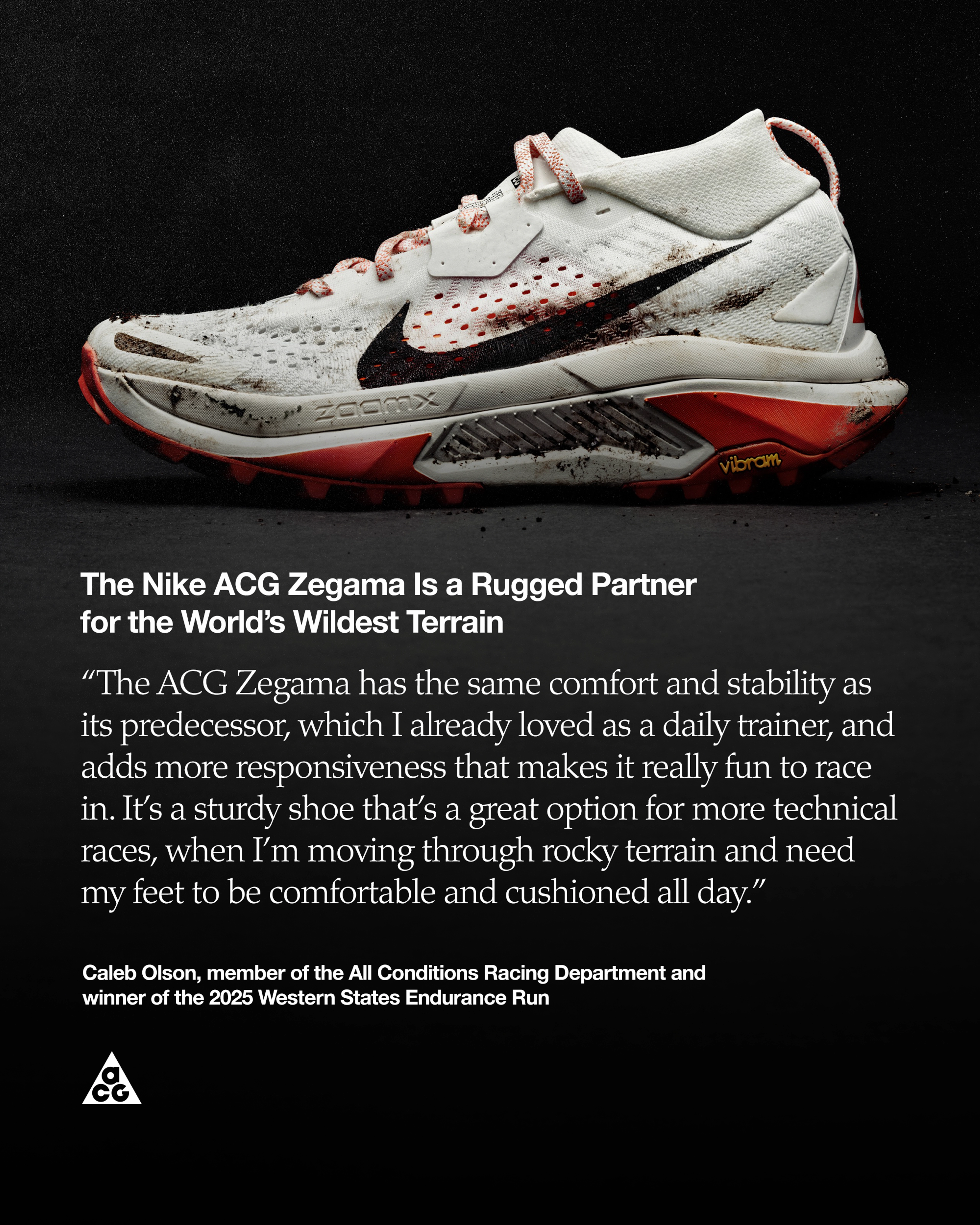 “The ACG Zegama has the same comfort and stability as its predecessor, which I already loved as a daily trainer, and adds more responsiveness that makes it really fun to race in,” says Caleb Olson, a member of the All Conditions Racing Department and winner of the 2025 Western States Endurance Run. “It’s a sturdy shoe that’s a great option for more technical races, when I’m moving through rocky terrain and need my feet to be comfortable and cushioned all day.”