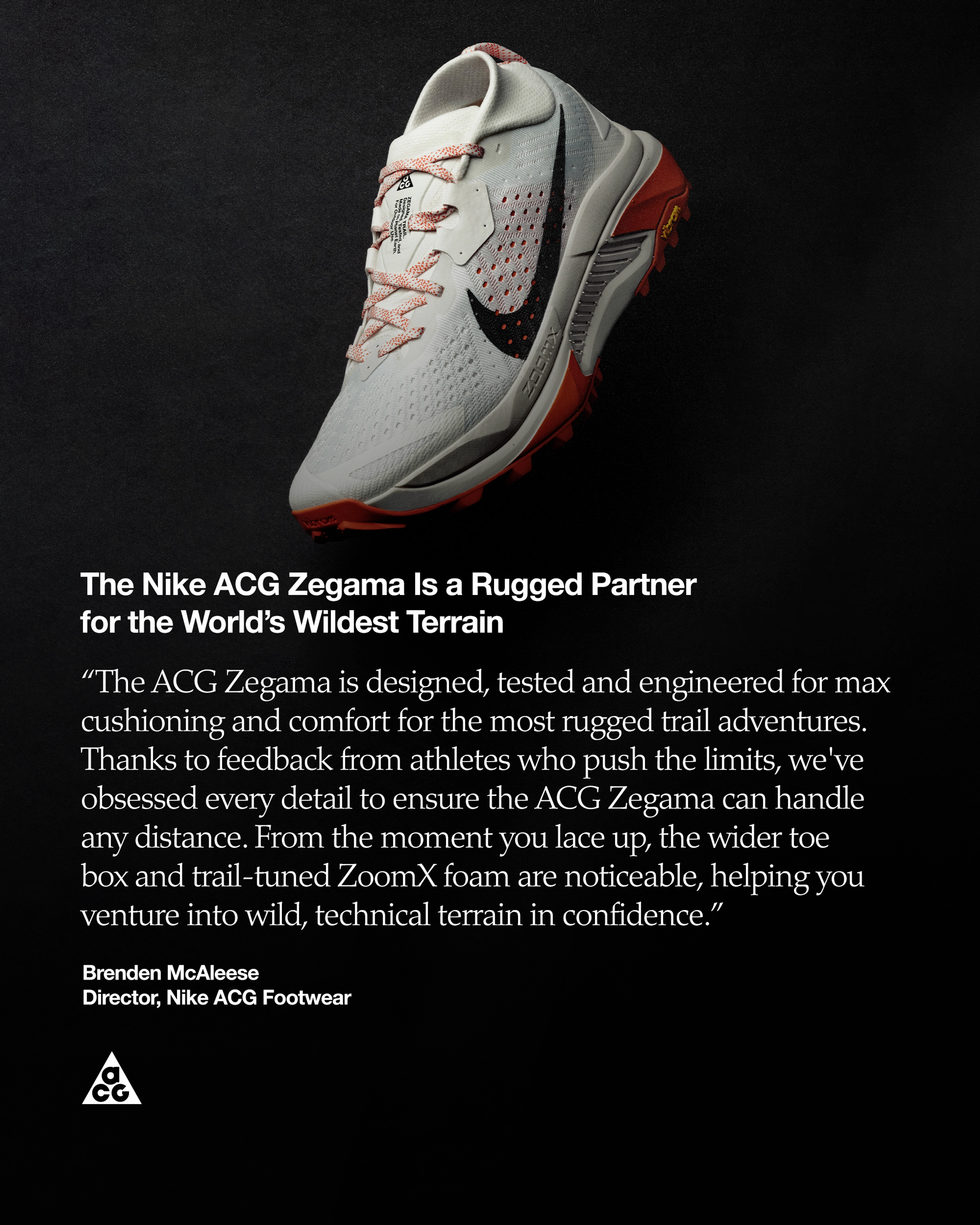 “The ACG Zegama is designed, tested and engineered for max cushioning and comfort for the most rugged trail adventures,” says Brenden McAleese, Director, Nike ACG Footwear. “Thanks to feedback from athletes who push the limits, we've obsessed every detail to ensure the ACG Zegama can handle any distance. From the moment you lace up, the wider toe box and trail-tuned ZoomX foam are noticeable, helping you venture into wild, technical terrain in confidence.”