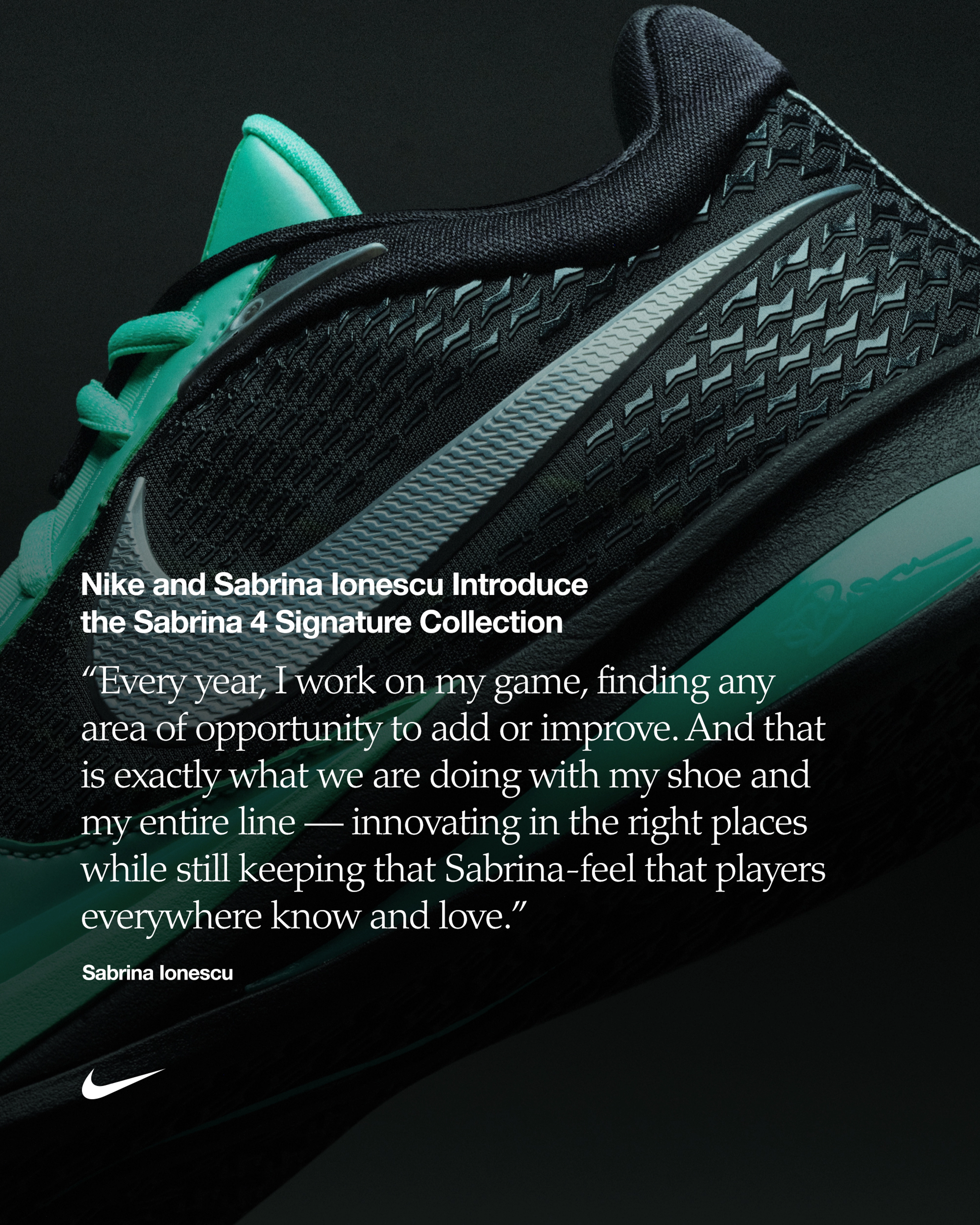 - Nike Basketball and Sabrina Ionescu unveil the Sabrina 4 signature footwear and apparel collection, adding to a line already beloved by hoopers.