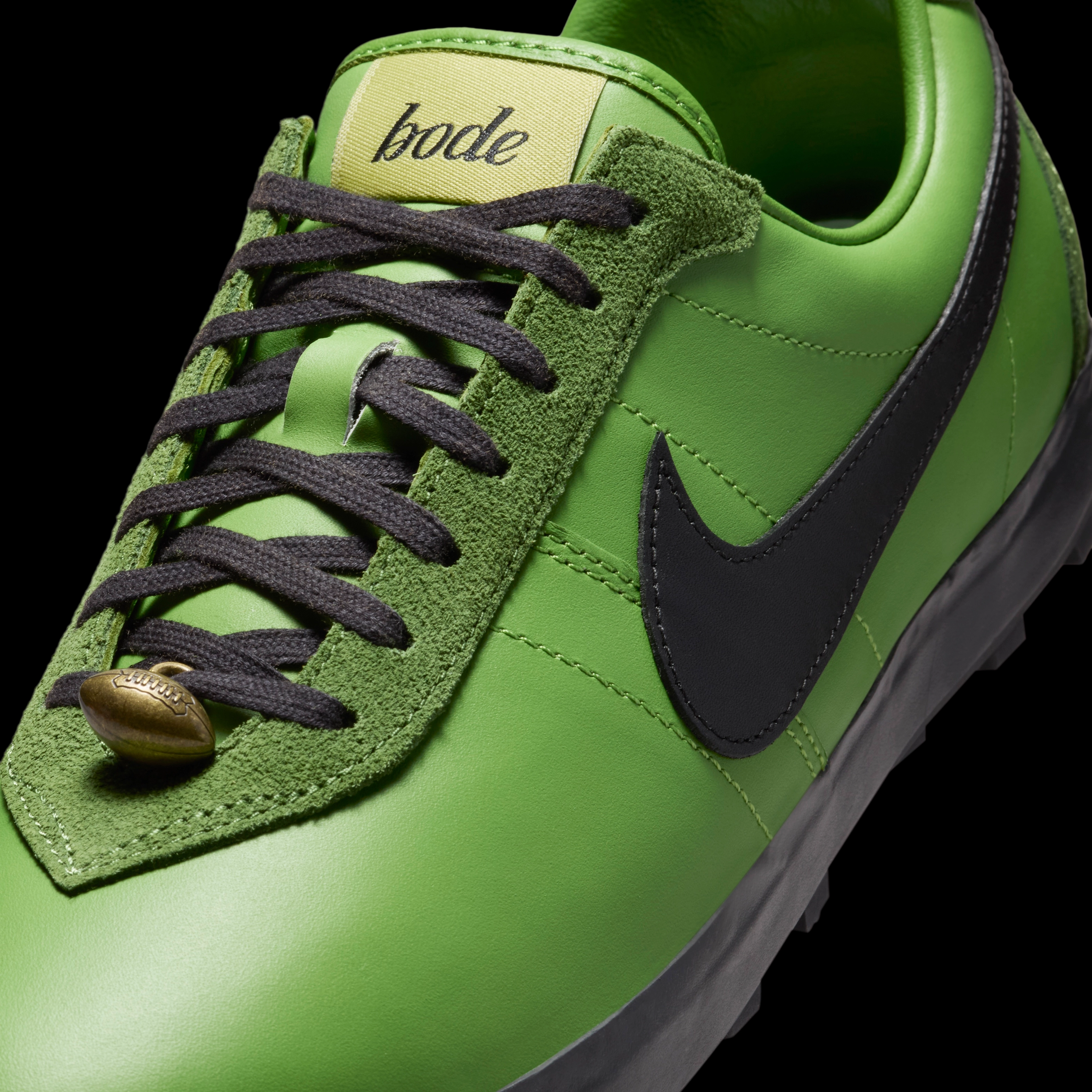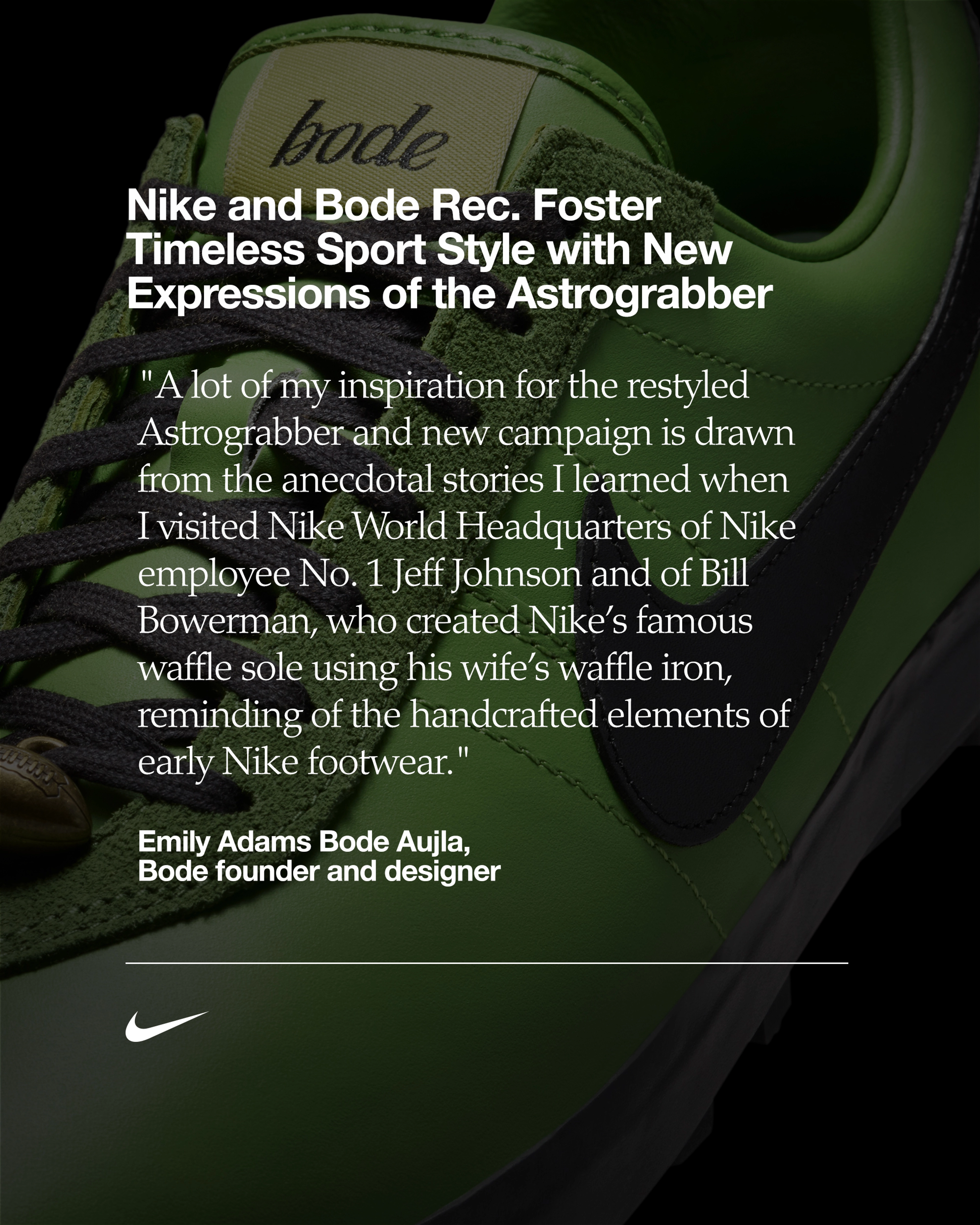 • An exclusive green expression of the Astrograbber will be available alongside the leading black colorway March 14 at bode.com, Bode retail locations in Los Angeles and New York City, and a new Bode boutique in Paris. The black colorway will be available on SNKRS and at select Nike and Bode Rec. retail partners March 21.
