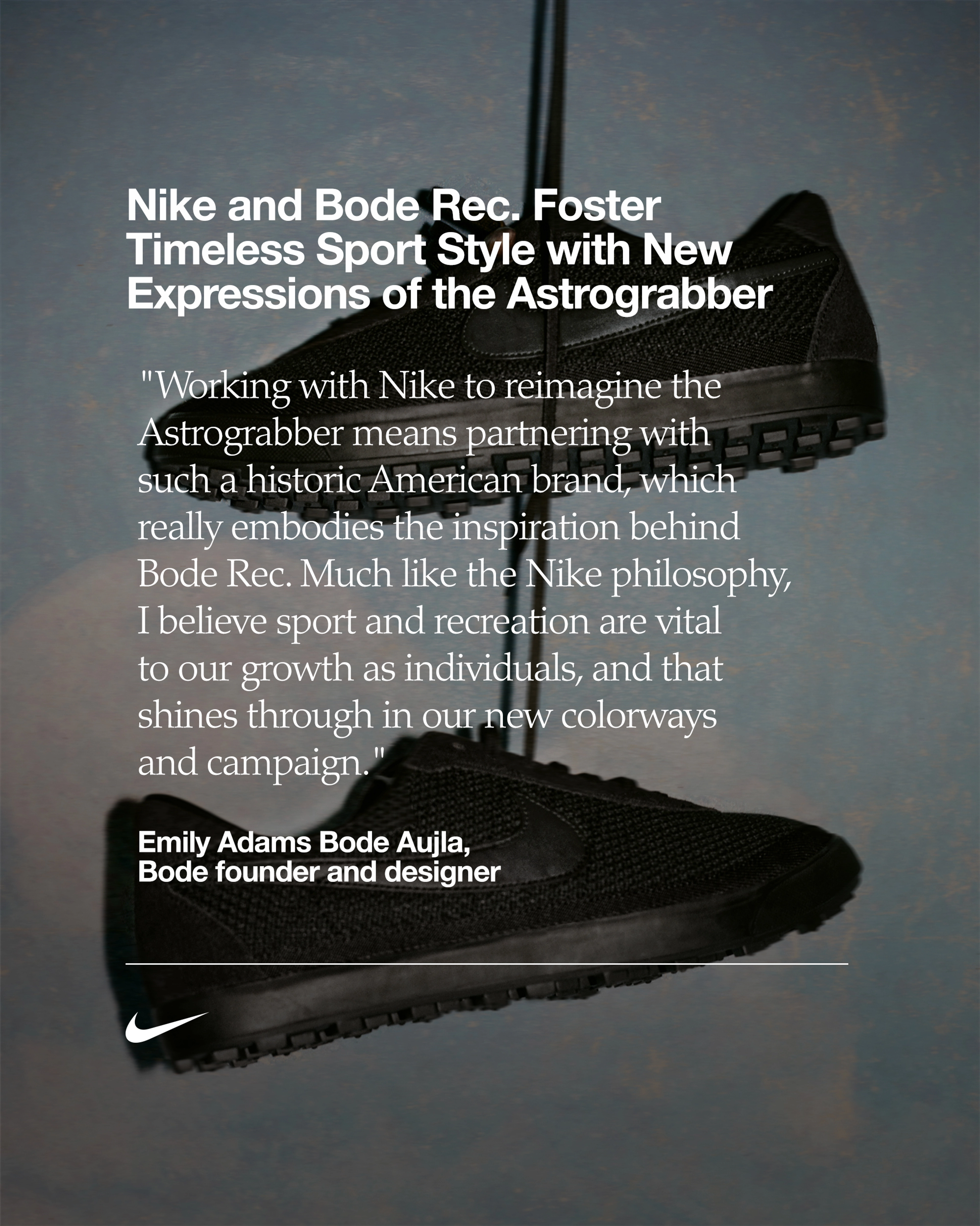 “Working with Nike to reimagine the Astrograbber means partnering with such a historic American brand, which really embodies the inspiration behind Bode Rec.,” says Bode Aujla. “Much like the Nike philosophy, I believe sport and recreation are vital to our growth as individuals, and that shines through in our new colorways and campaign.”