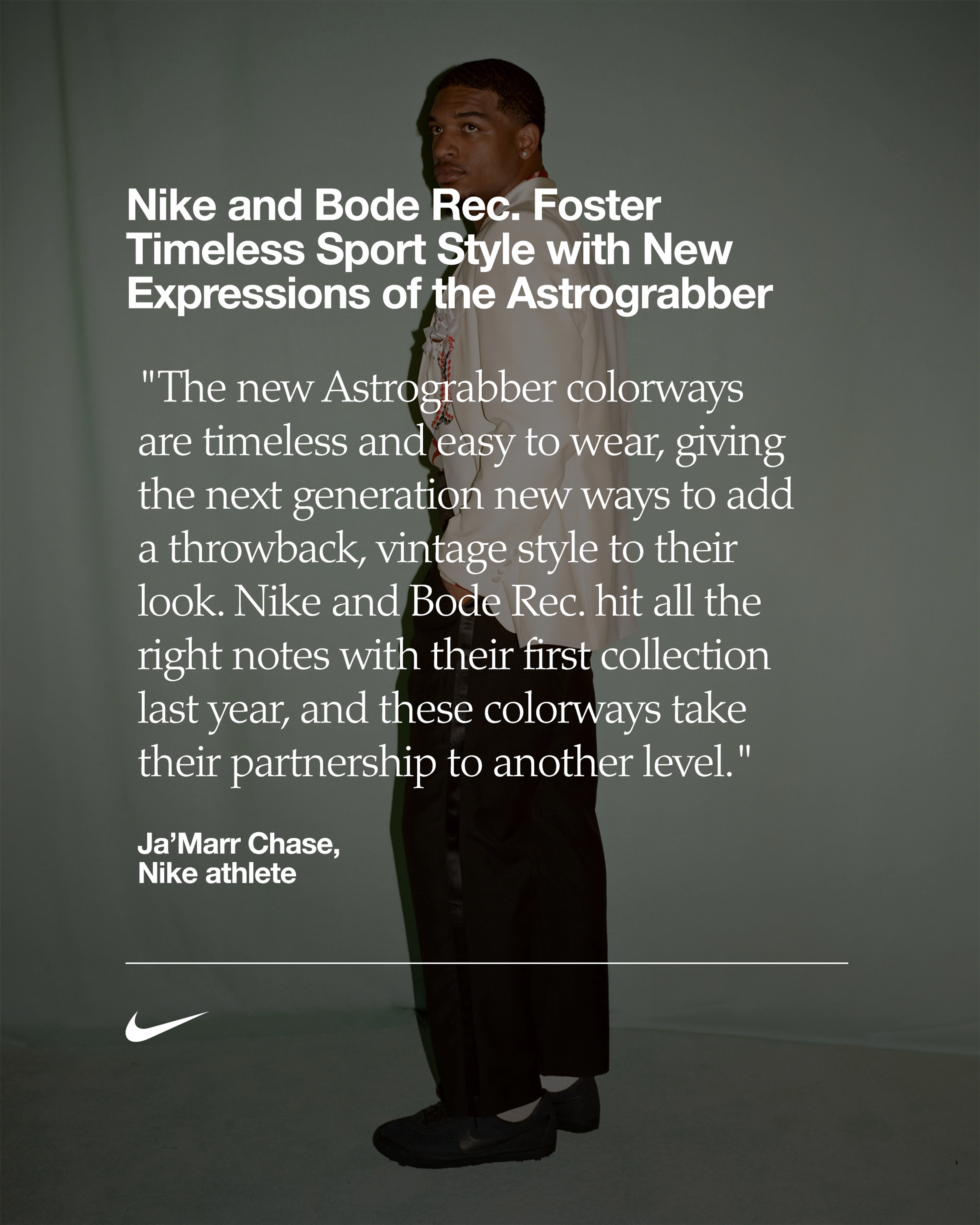 • At the center of the campaign is Nike athlete Ja’Marr Chase, who sports two new colorways of the iconic Nike Astrograbber, cementing the classic gridiron look as a contemporary sportswear staple.