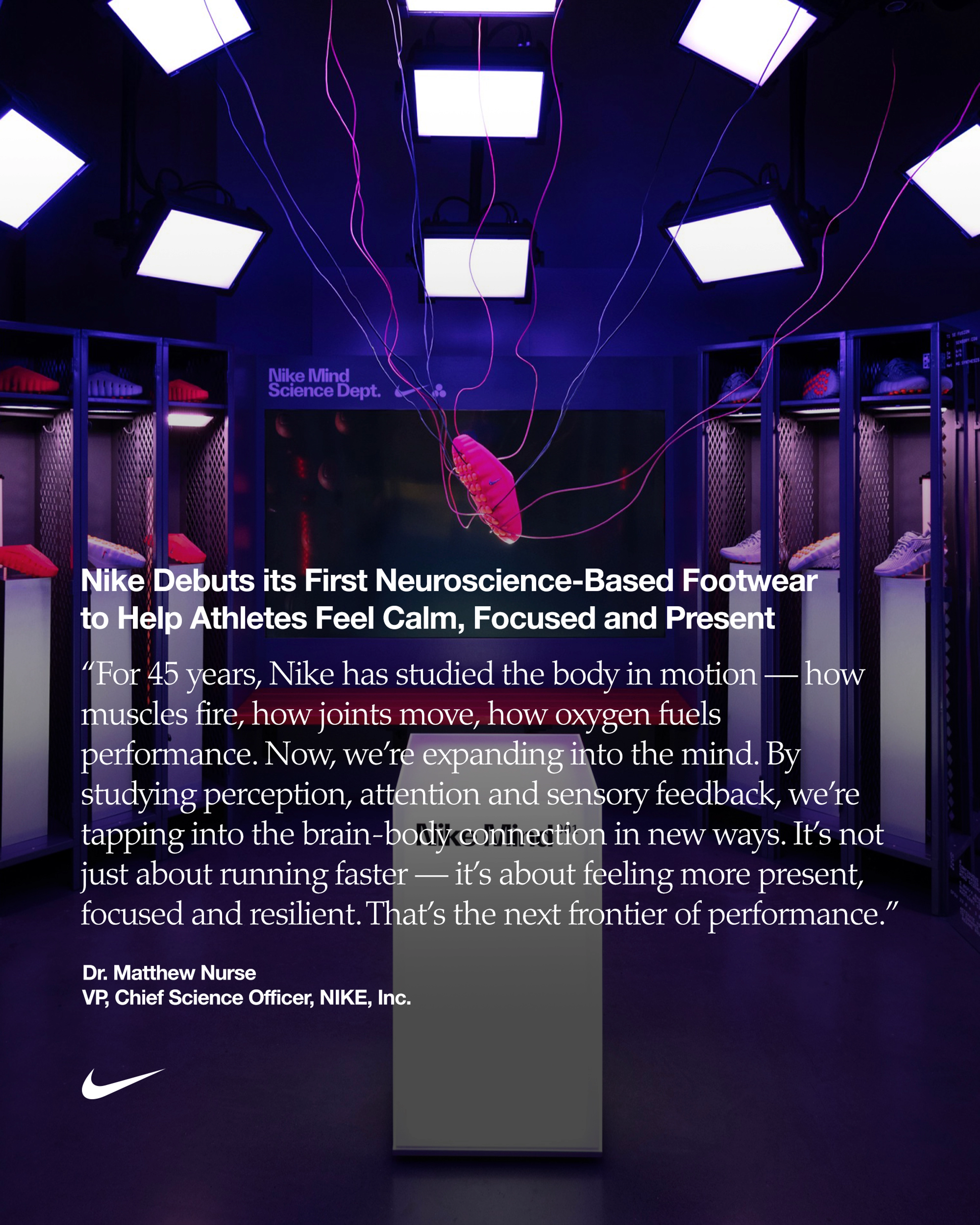 “For 45 years, Nike has studied the body in motion — how muscles fire, how joints move, how oxygen fuels performance,” says Dr. Matthew Nurse, VP, Chief Science Officer, NIKE, Inc. “Now, we’re expanding into the mind. By studying perception, attention and sensory feedback, we’re tapping into the brain-body connection in new ways. It’s not just about running faster — it’s about feeling more present, focused and resilient. That’s the next frontier of performance.”