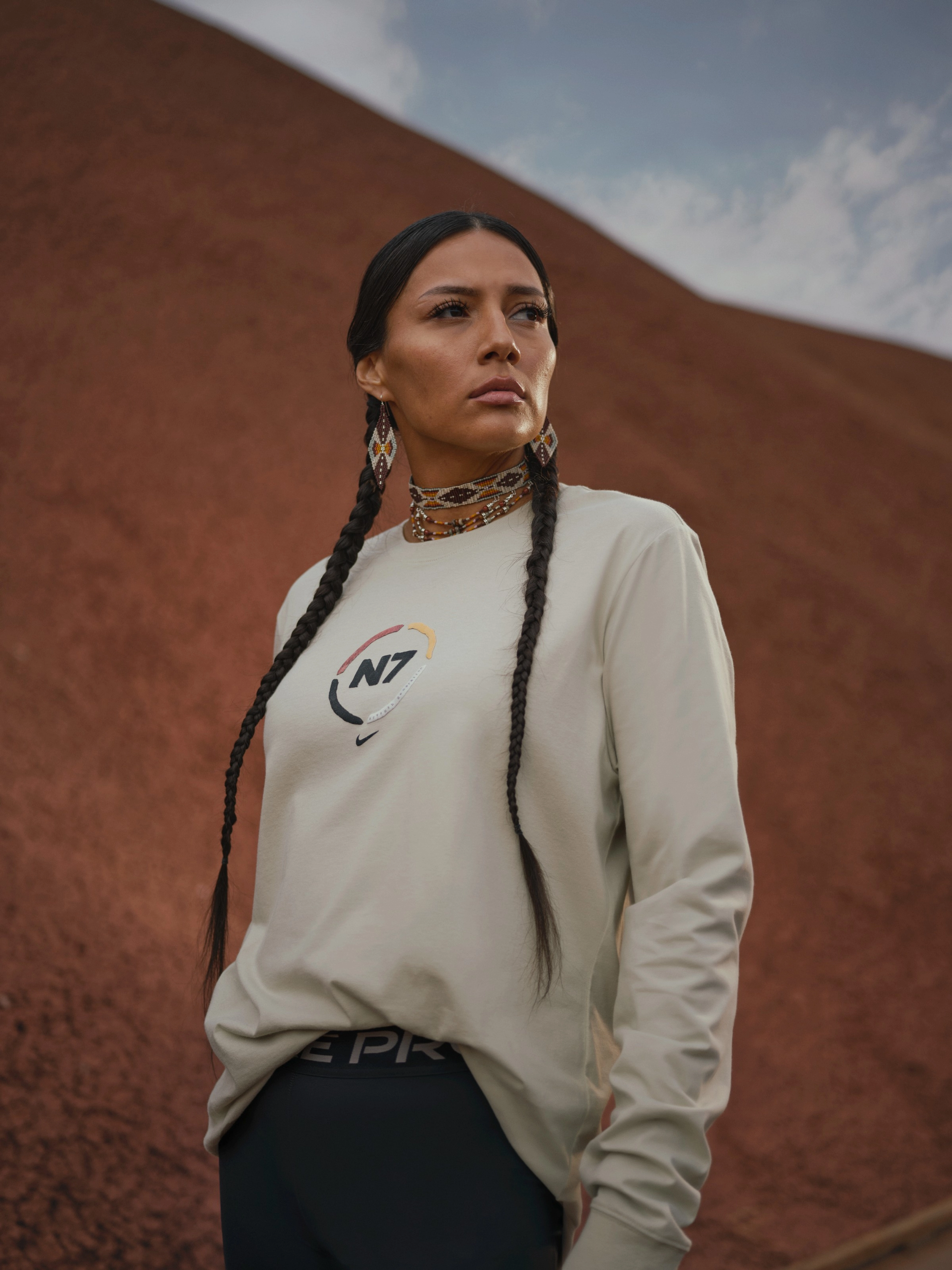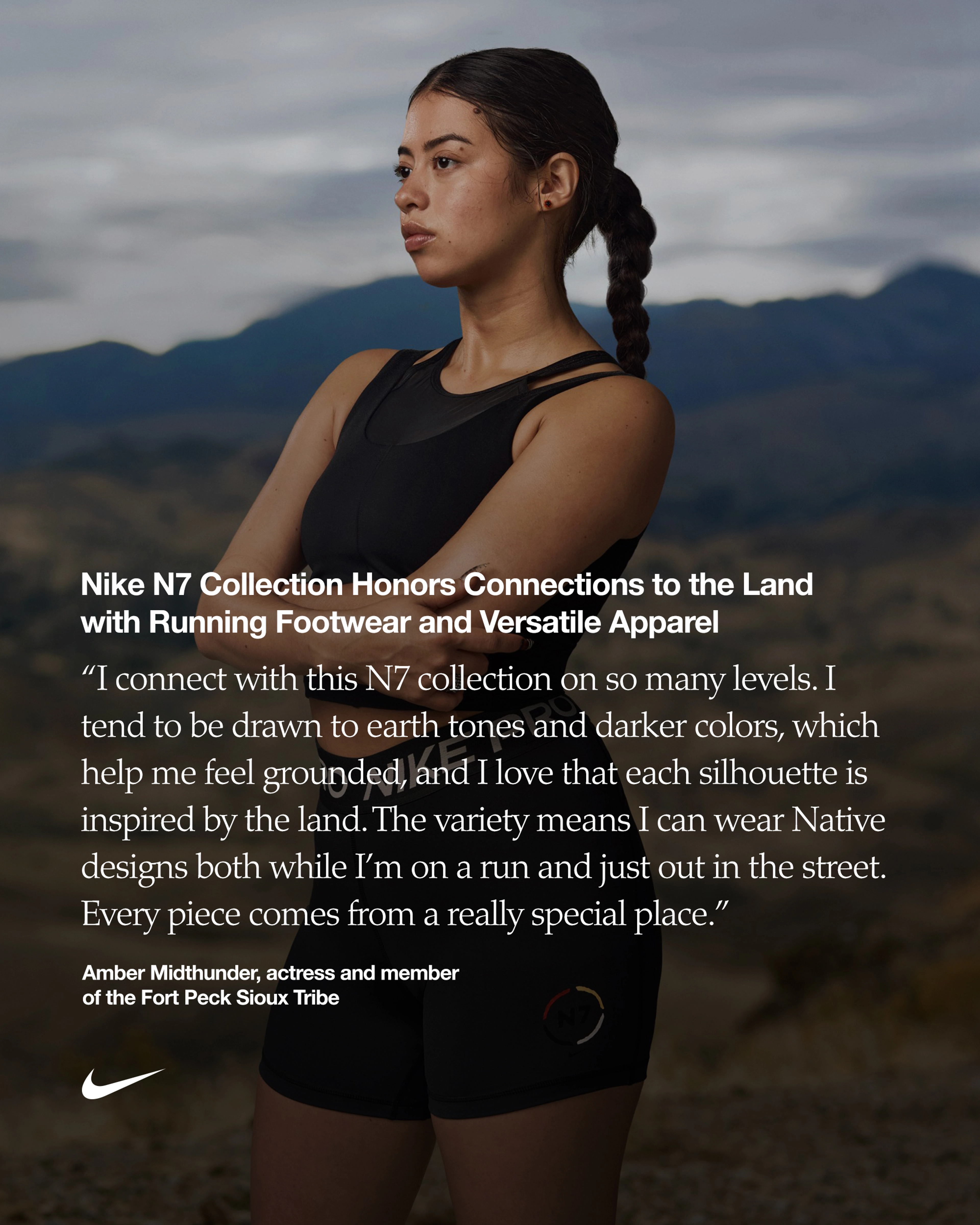 “I connect with this N7 collection on so many levels,” says Amber Midthunder, an actress and member of the Fort Peck Sioux Tribe, who features in the campaign. “I tend to be drawn to earth tones and darker colors, which help me feel grounded, and I love that each silhouette is inspired by the land. The variety means I can wear Native designs both while I’m on a run and just out in the street. Every piece comes from a really special place.”