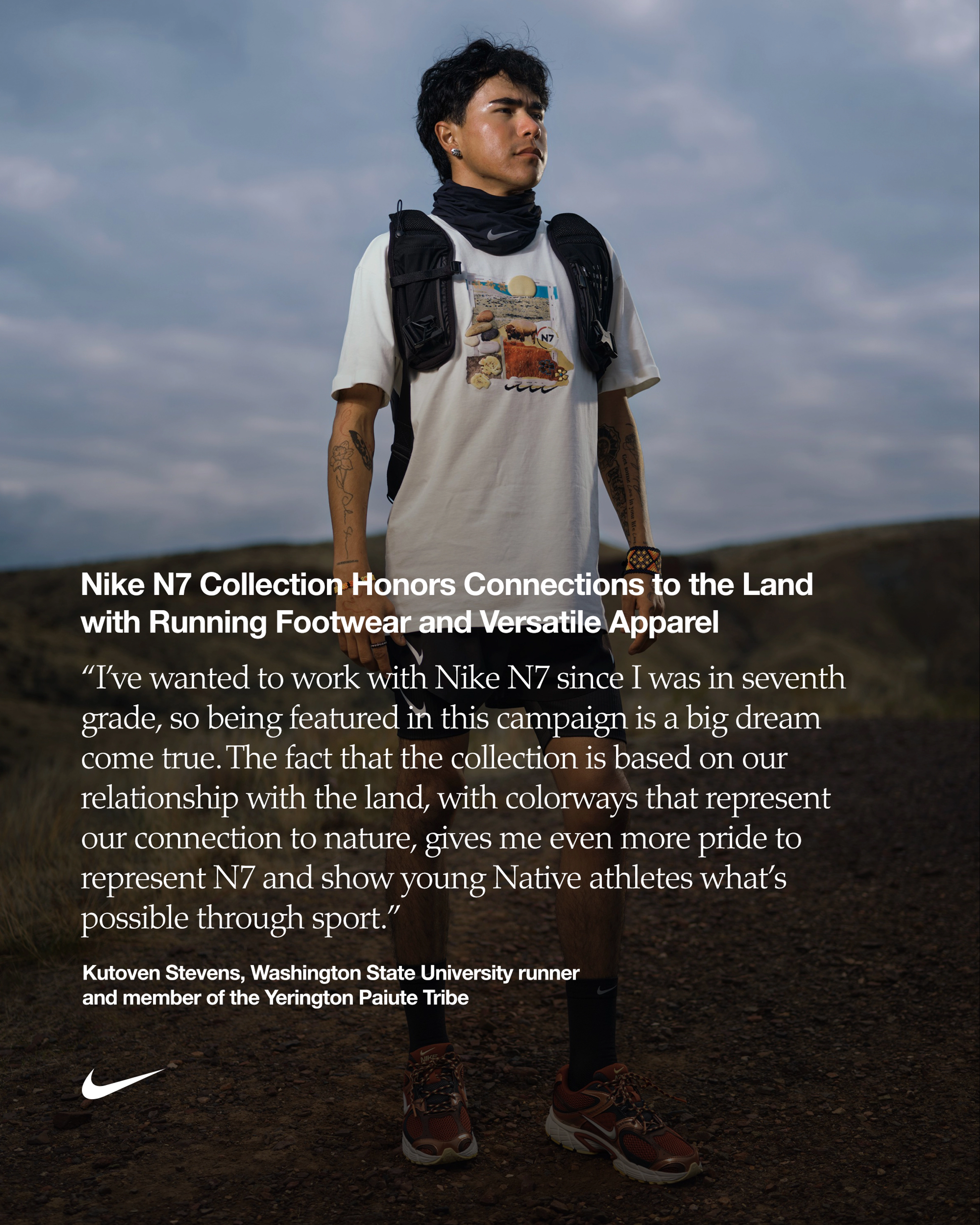 “I’ve wanted to work with Nike N7 since I was in seventh grade, so being featured in this campaign is a big dream come true,” says Kutoven, a Washington State University runner and member of the Yerington Paiute Tribe. “The fact that the collection is based on our relationship with the land, with colorways that represent our connection to nature, gives me even more pride to represent N7 and show young Native athletes what’s possible through sport.”