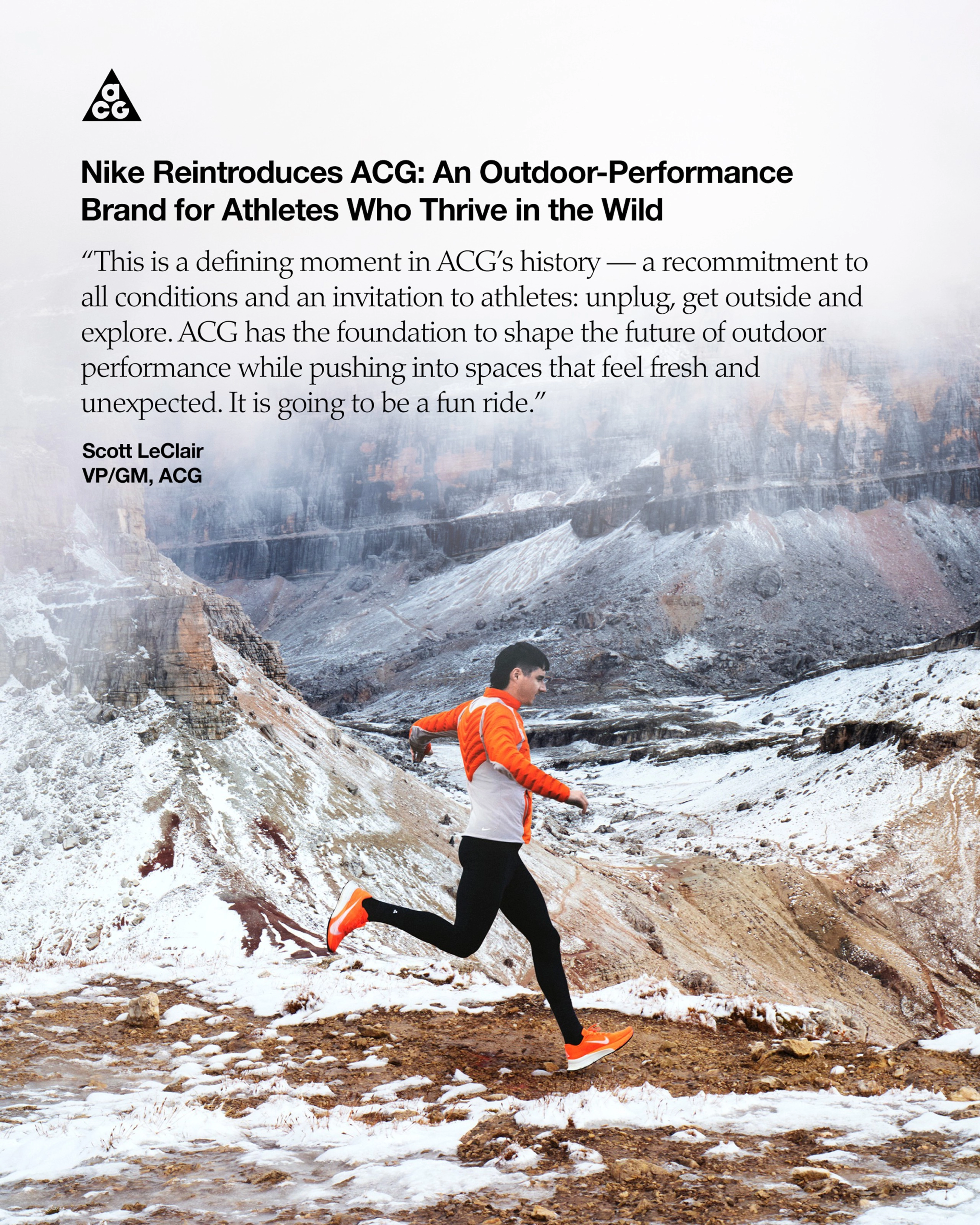 • With a sharp focus on trail running, hiking and exploration, ACG will lead performance innovation for outdoor athletes around the world.