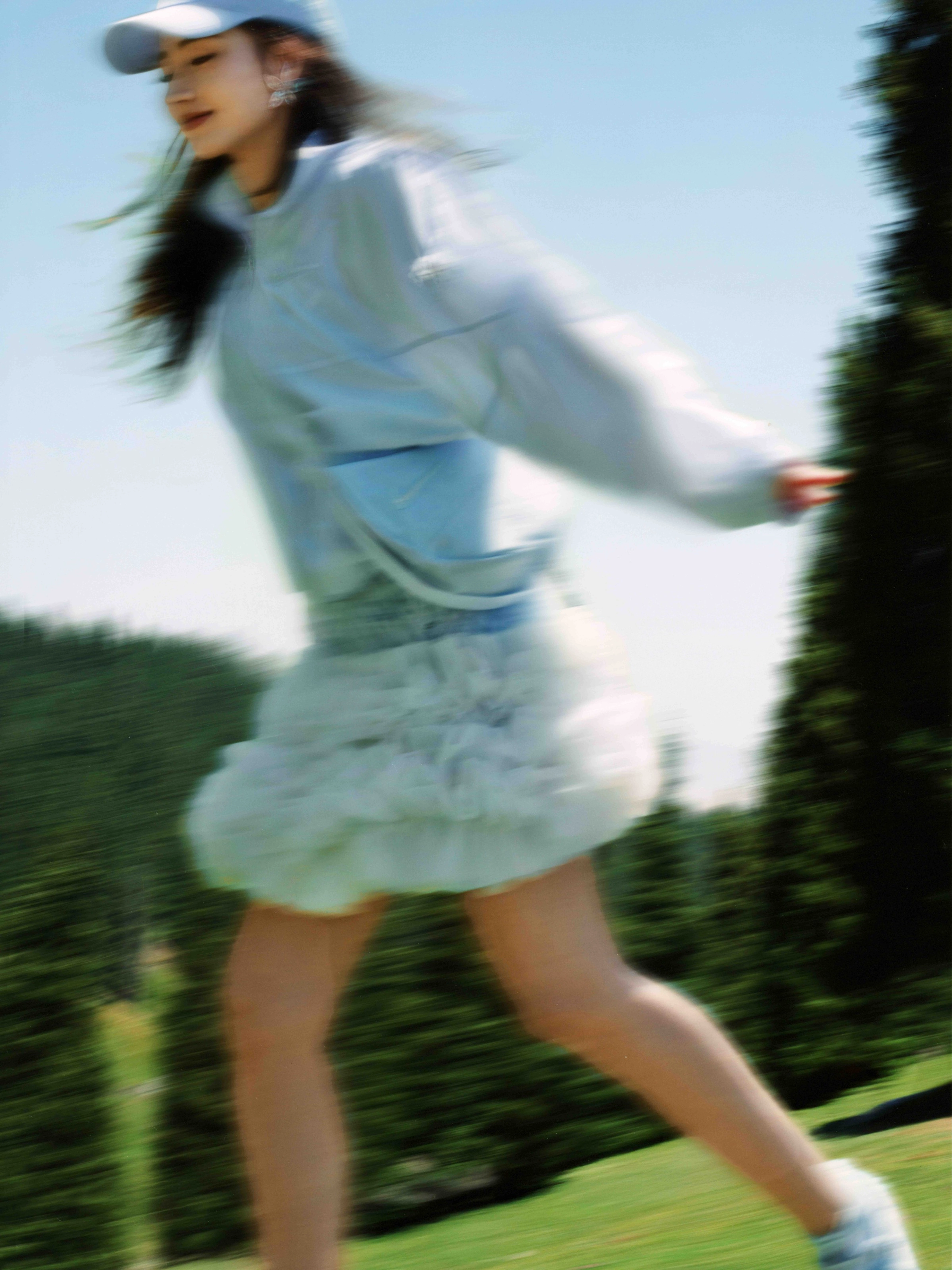 Susan’s inspiration for the collection began with a dive, and she sought to capture the fleeting yet powerful moment when sunlight cut through the water and met the bubbles rising to the surface. Water droplets became a recurring motif, brought to life through Susan’s signature hand-beaded details: Swooshes that ripple like streams and airy, three-dimensional flowers that seem to float in midair. These fluid forms, both soft and strong, symbolize women’s resilience and elevate sport performance into a statement of style and emotion.