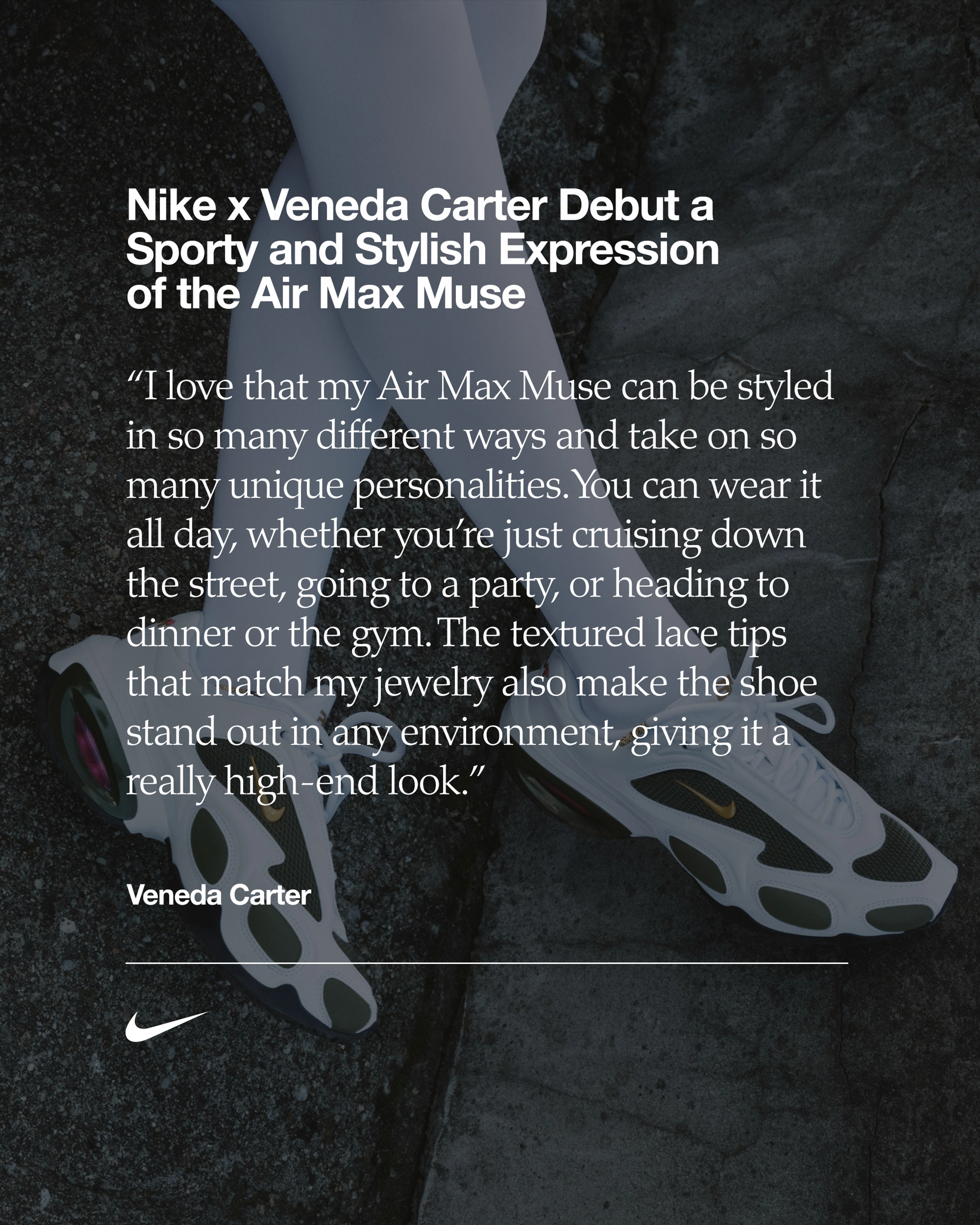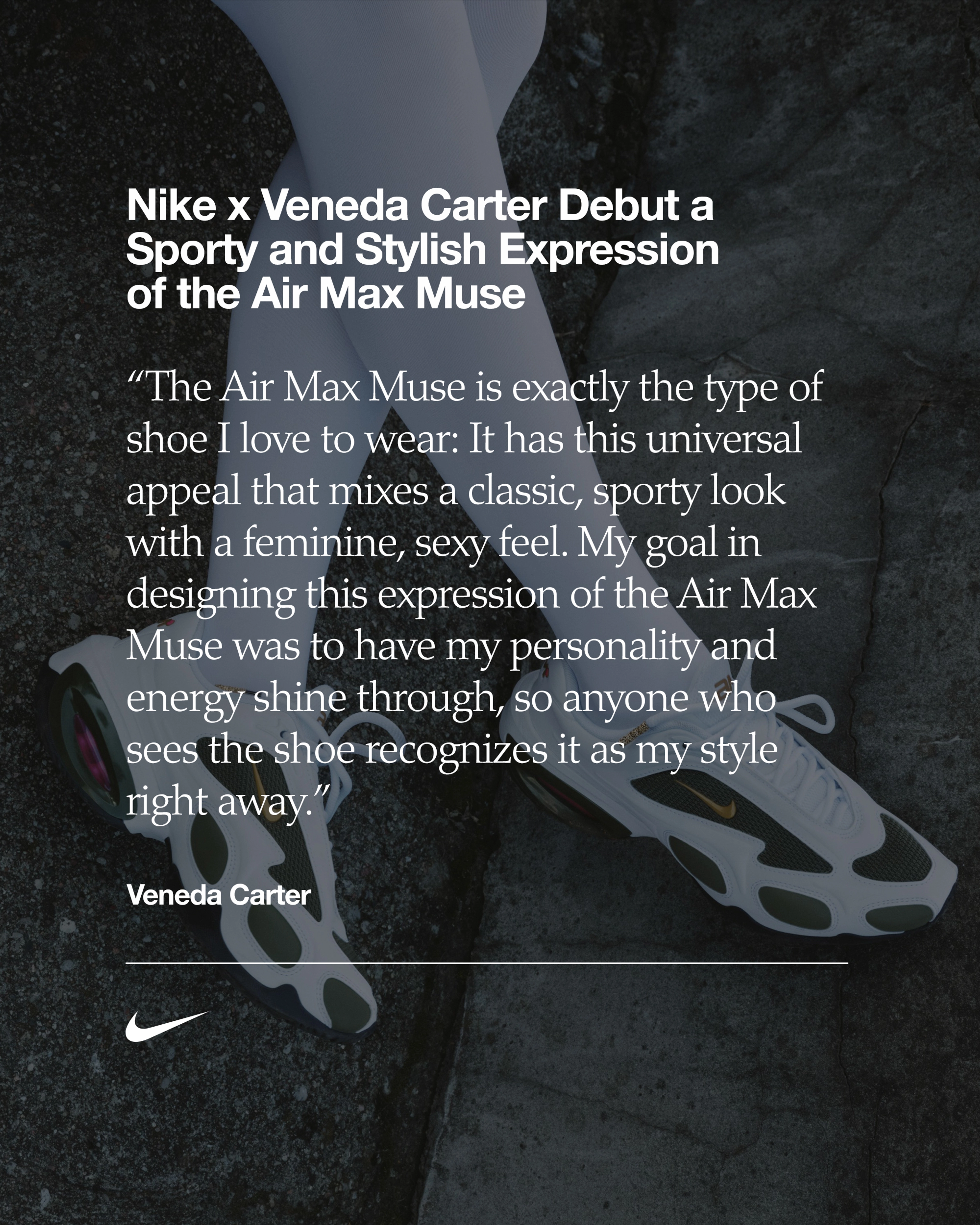• Nike and Veneda Carter are unveiling a timely, sporty and stylish expression of the Air Max Muse: a striking silhouette for women that reaffirms Nike’s leading position and versatility at the intersection of sport and style.