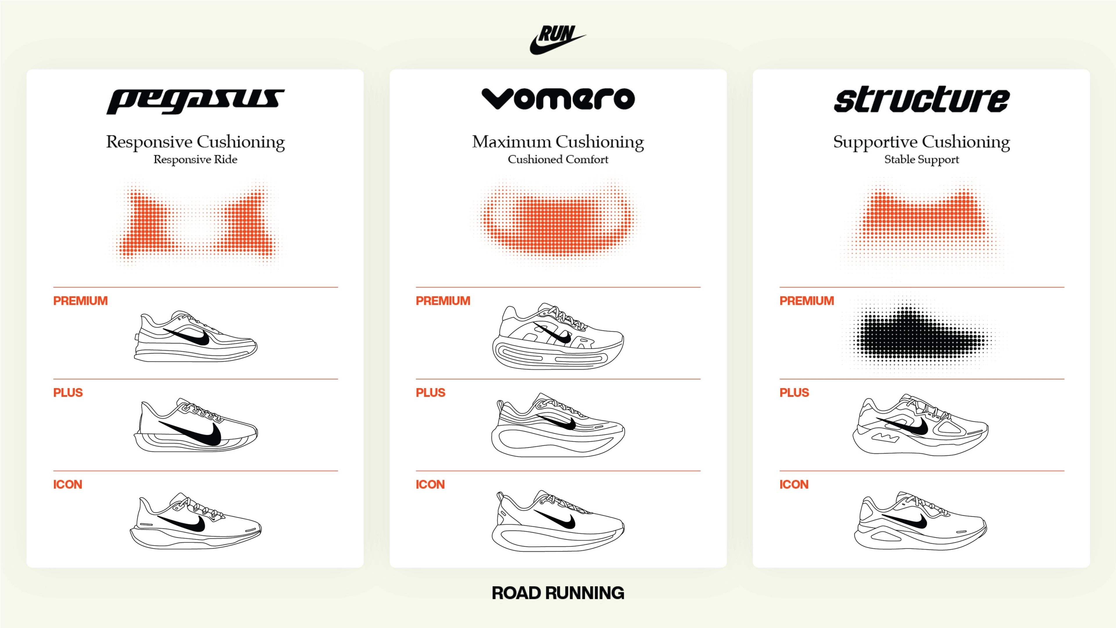 The Vomero franchise reflects a new era of maximum cushioning for ultimate comfort, while Structure delivers supportive cushioning for a stable ride and Pegasus provides responsive cushioning for all-day energy return.