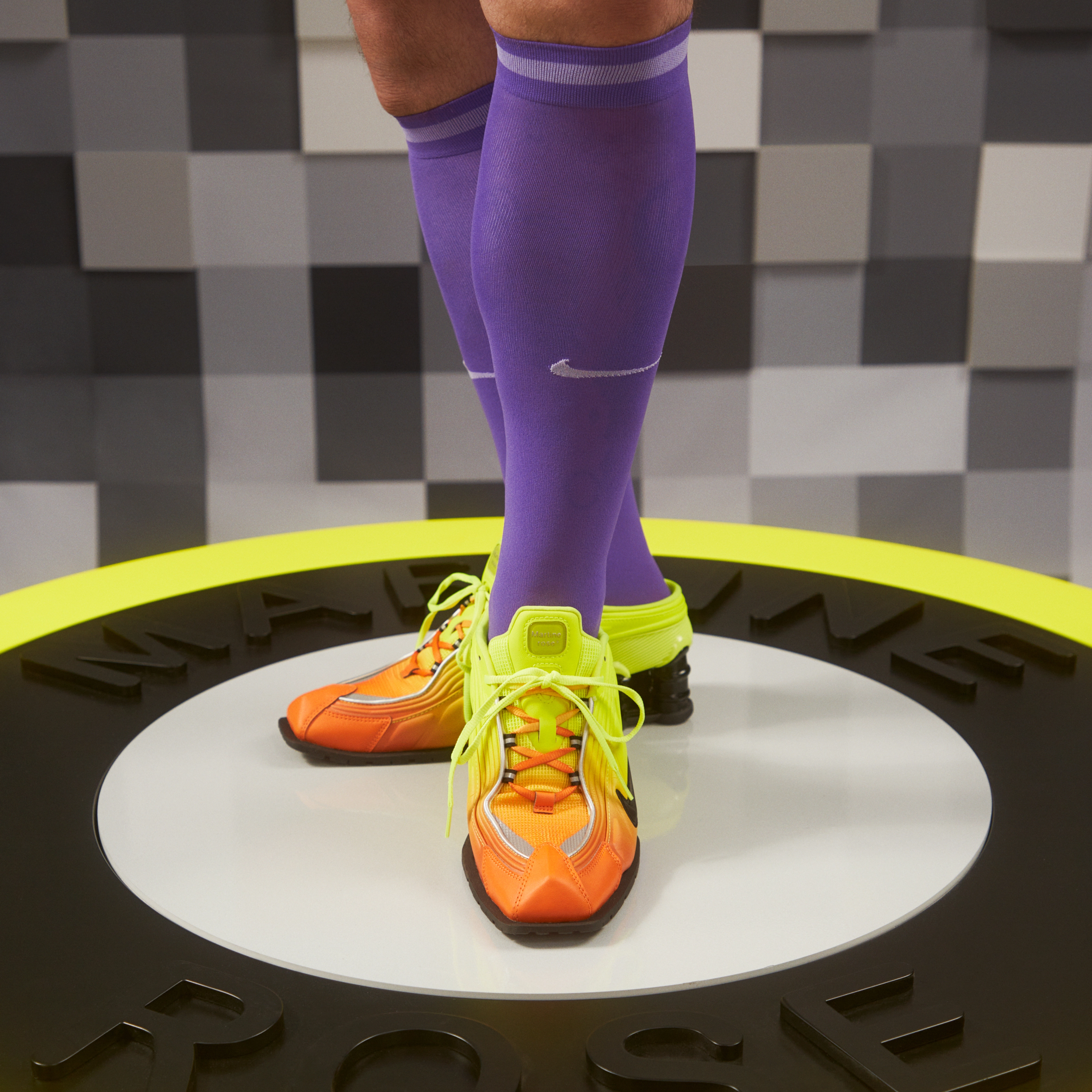 The Nike x Martine Rose Collection features a player’s suit jacket, trouser, trench and shirt; accessories, including stockings, gloves and sunglasses; and the latest iteration of the Nike x Martine Rose Shox Mule MR 4. The shoe’s eye-catching blue and purple colorway nods to the famously vibrant goalkeeper jerseys of the 1990s, while the silhouette acts as a talisman for equity in football, the ever-expanding culture of sport and a signal of what’s to come from Nike and Martine later in the year.