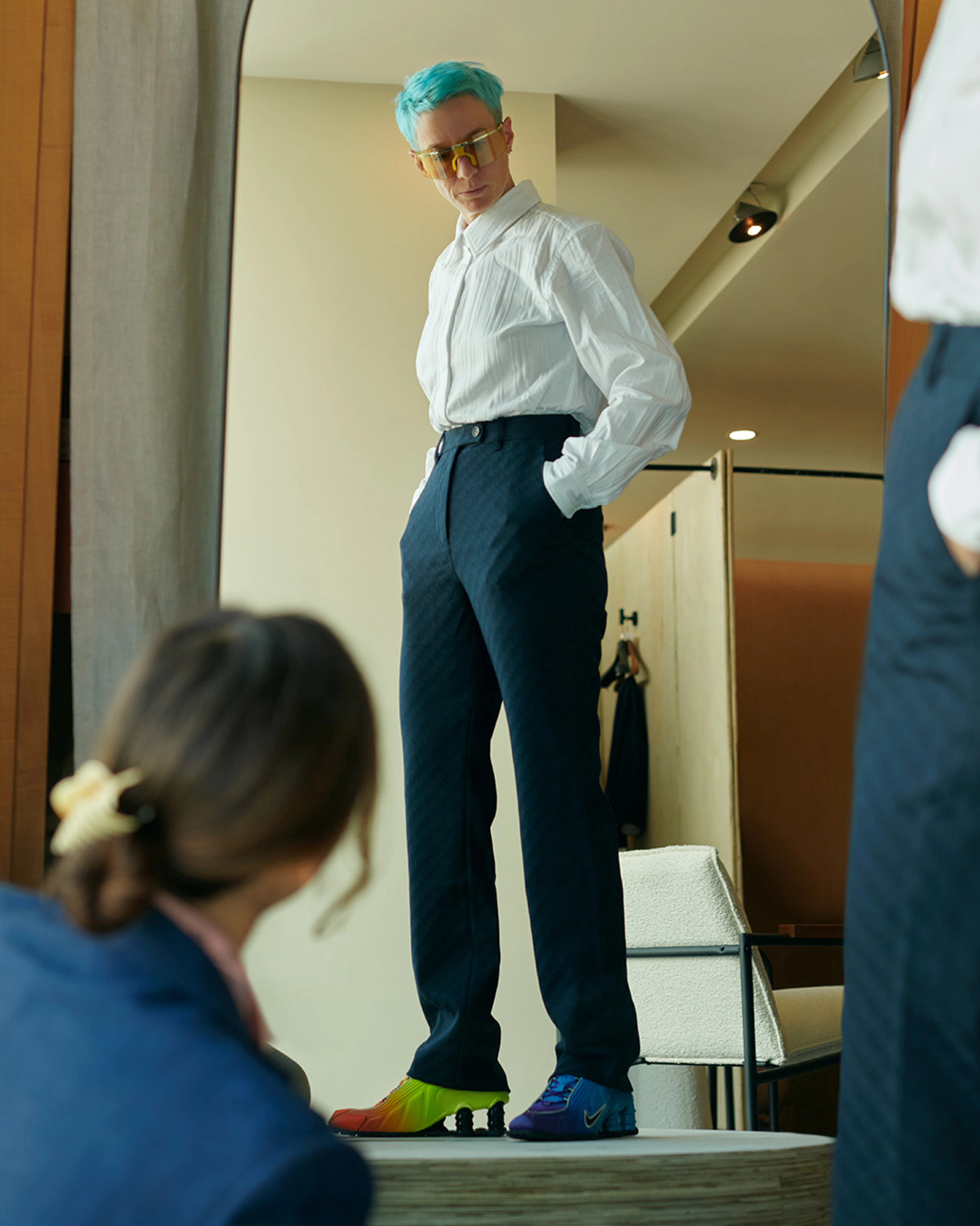 “Wearing this suit to walk out on the field feels like the culmination of my whole career — to elevate the women’s team look, to show something unexpected, and to continue to push boundaries in what it means to be an elite female athlete,” says four-time USWNT player Megan Rapinoe, and muse for the Nike x Martine Rose Collection. “It’s also just fun to be able to show up rocking something that’s unique and popping. And to have one of the best designers in the world create for the best team in the world is incredible.”