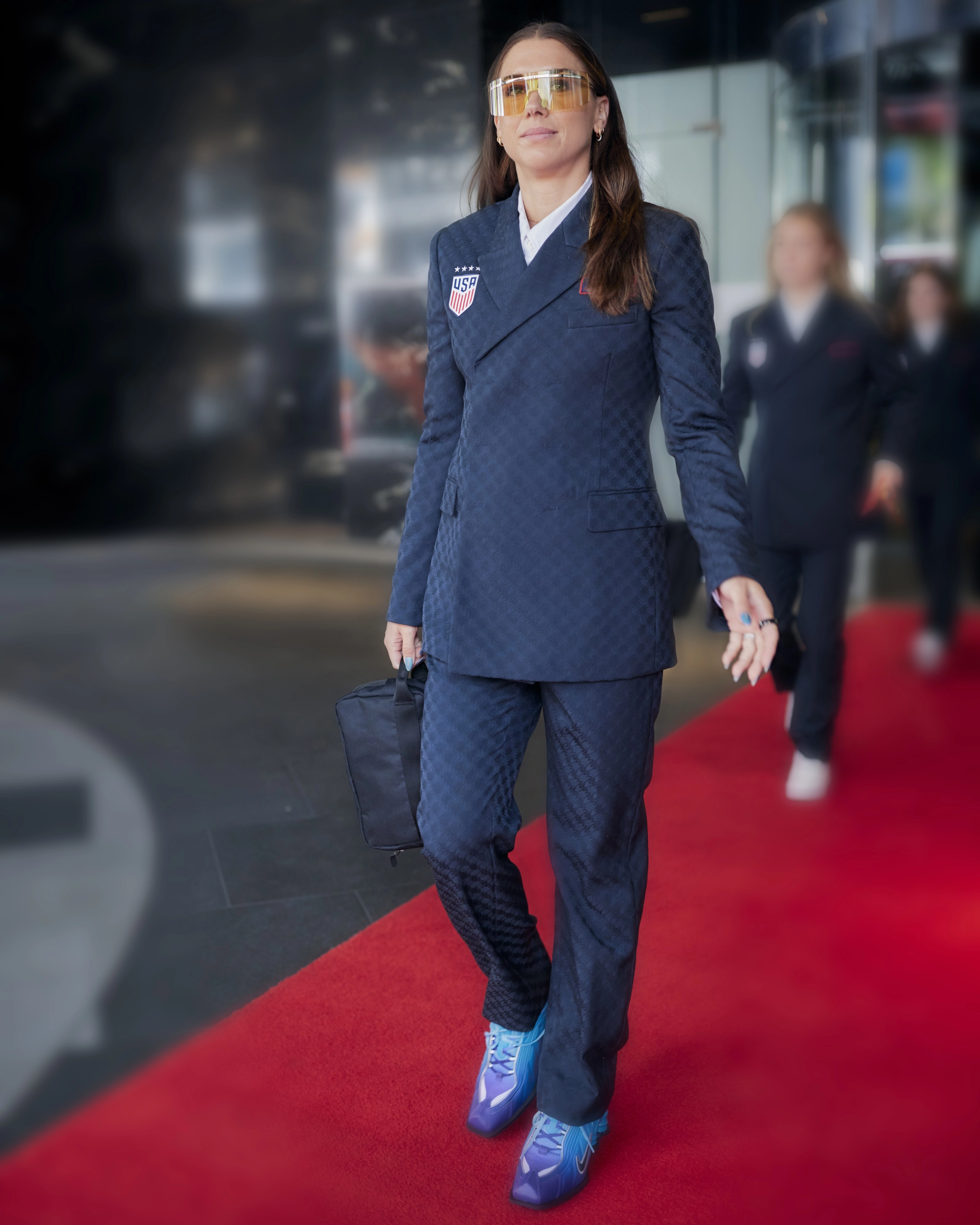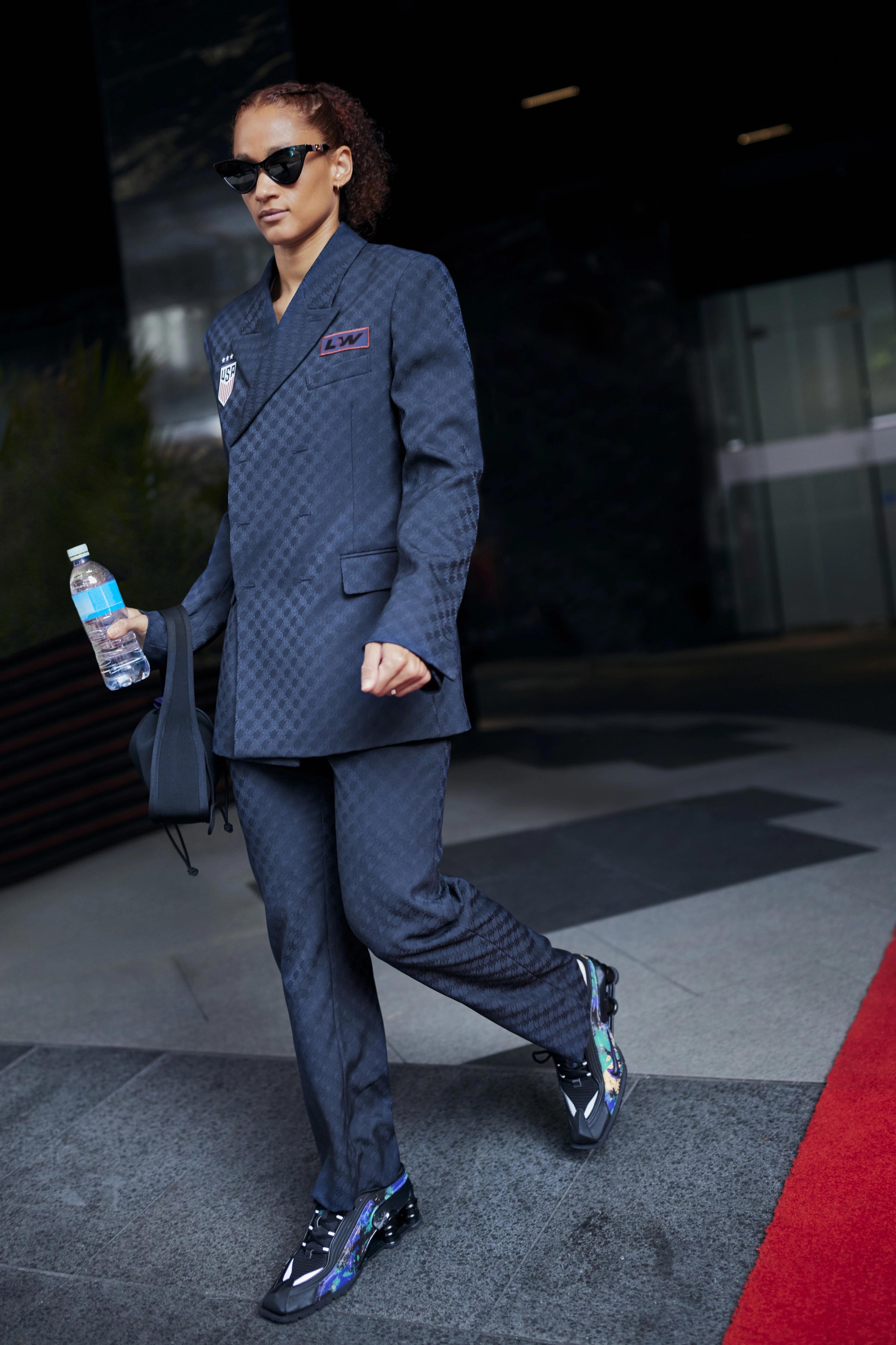 Click through the gallery below to see and download images of USWNT players being fitted for their custom Nike x Martine Rose Collection suits and the team’s arrival to their opening match.