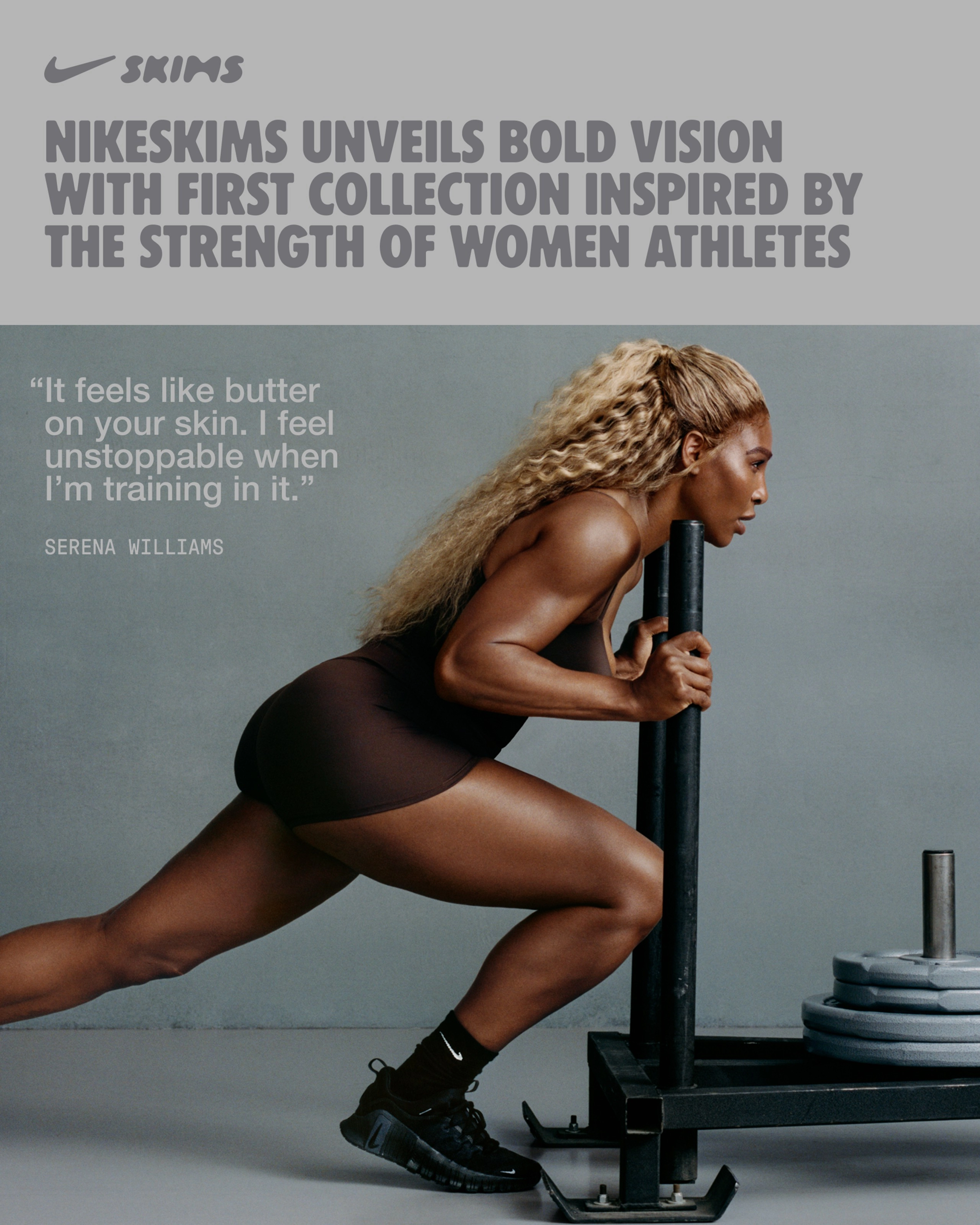 “It feels like butter on your skin,” says Serena Williams, winner of 23 Grand Slam singles titles and four Olympic gold medals, of the first NikeSKIMS collection. “I feel unstoppable when I’m training in it.”