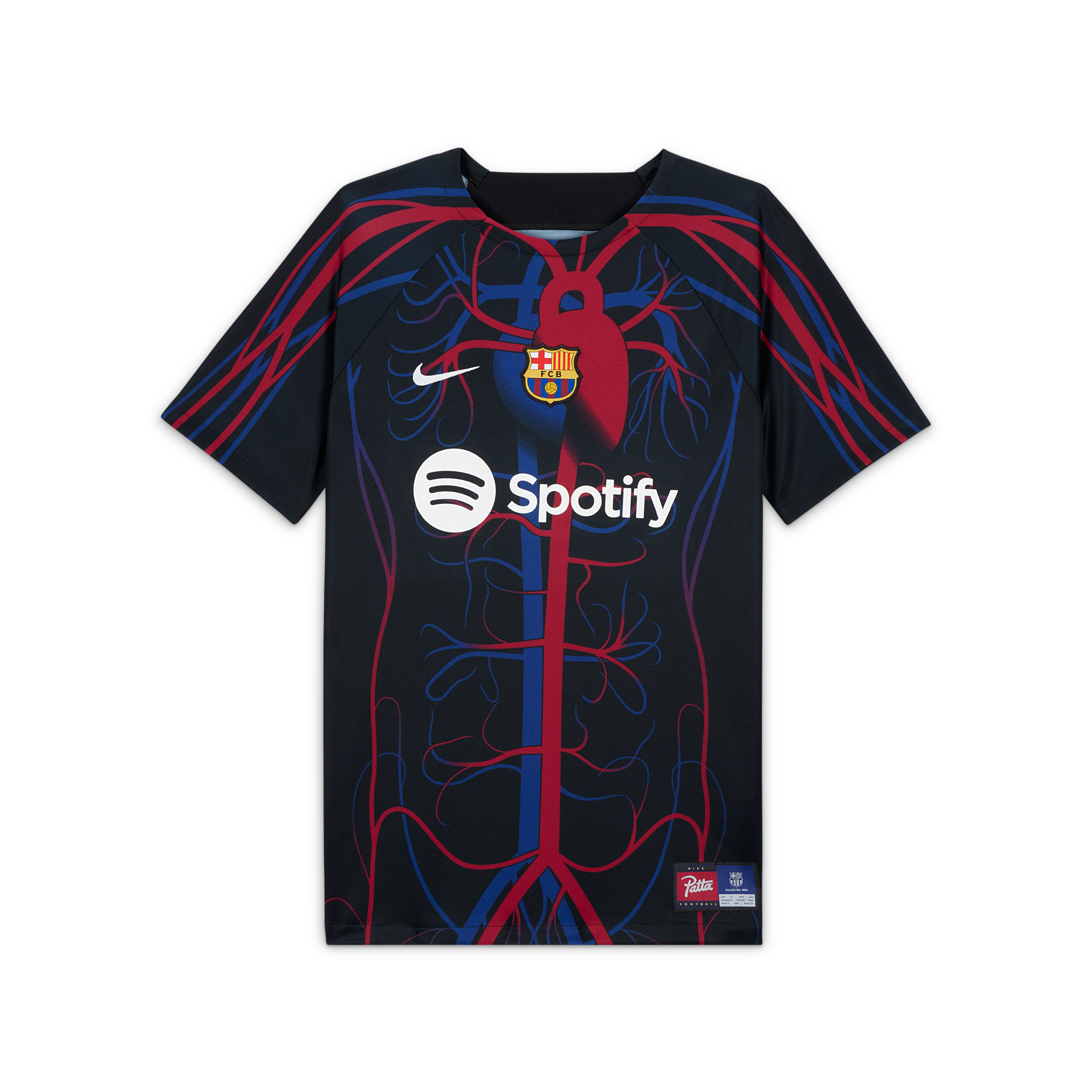 The ultimate expression of FC Barcelona passion is the idea of shared Barça blood — no matter where you’re from, being a Culer runs through your veins. To capture and visualize this visceral idea, Patta creative director Vincent van de Waal says the label worked with Nike and FCB on an inspired creative filter: the human heart and circulatory system pumping that blood through veins (blau) and arteries (grana), representing the Blaugrana pulse of Culers everywhere.