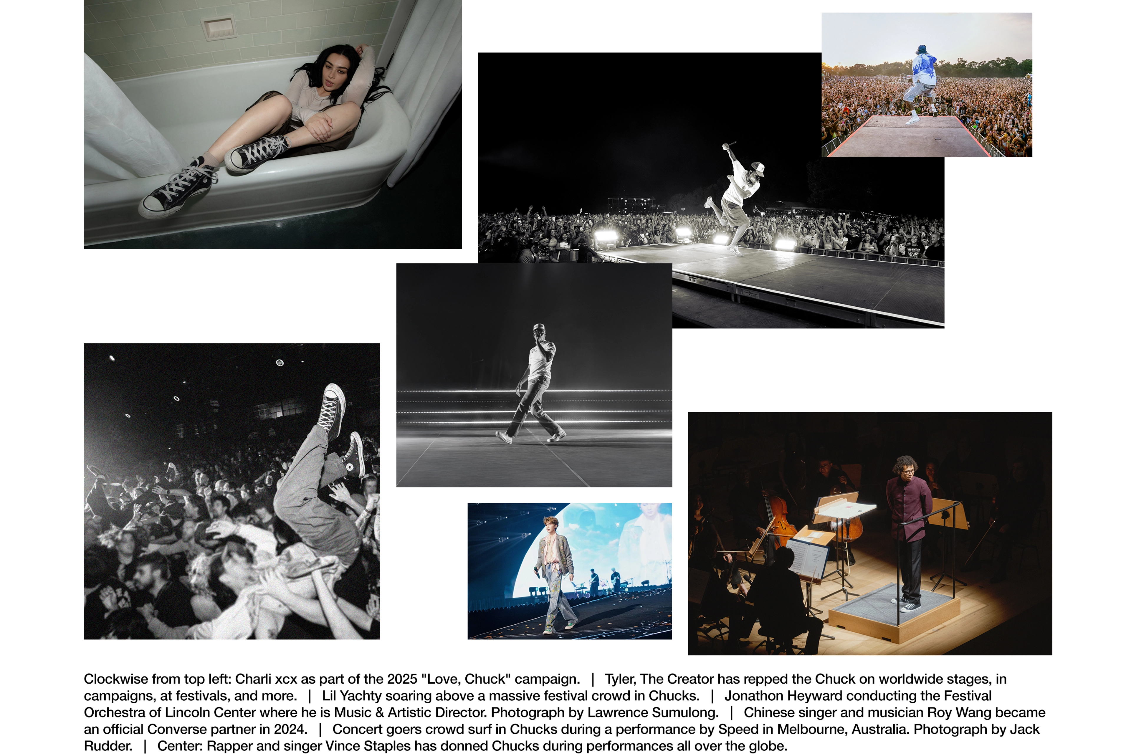 Over the decades, the Chuck has collected a roster of musical artists that rivals a legacy record label’s list and spans all genres, from punk, alternative and grunge to hip-hop, indie rock and pop. It has also cemented its place in recording studios, on album covers and at global music festivals, even infiltrating classical music halls. In 2018, when the conductor Jonathon Heyward forgot his formal shoes for an orchestra performance, he wore his red Chucks onstage, nearly upstaging the concert. “Being able to find a sense of relatability within classical music is something that I am really passionate about, and Chuck Taylors are incredible barrier breakers,” explains Heyward, who is Music & Artistic Director of the Festival Orchestra of Lincoln Center, and Music Director at the Baltimore Symphony Orchestra. “By simply wearing a pair of Chuck Taylors to my concert, I become more relatable — and people’s openness becomes greater when there is that sense of relatability. The walls go down and I can take them on a journey, which is what classical music is and what a live classical music performance is about.”