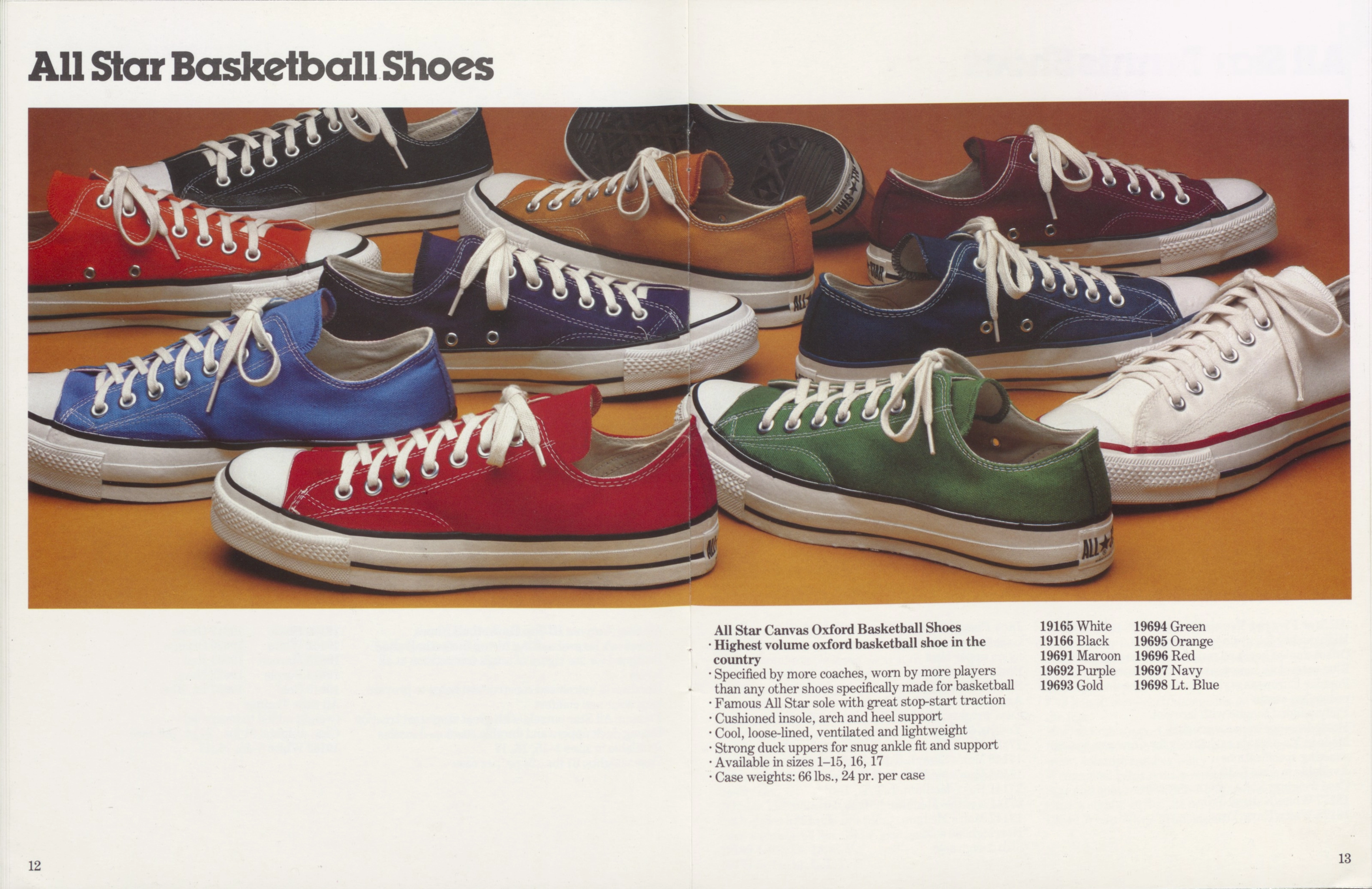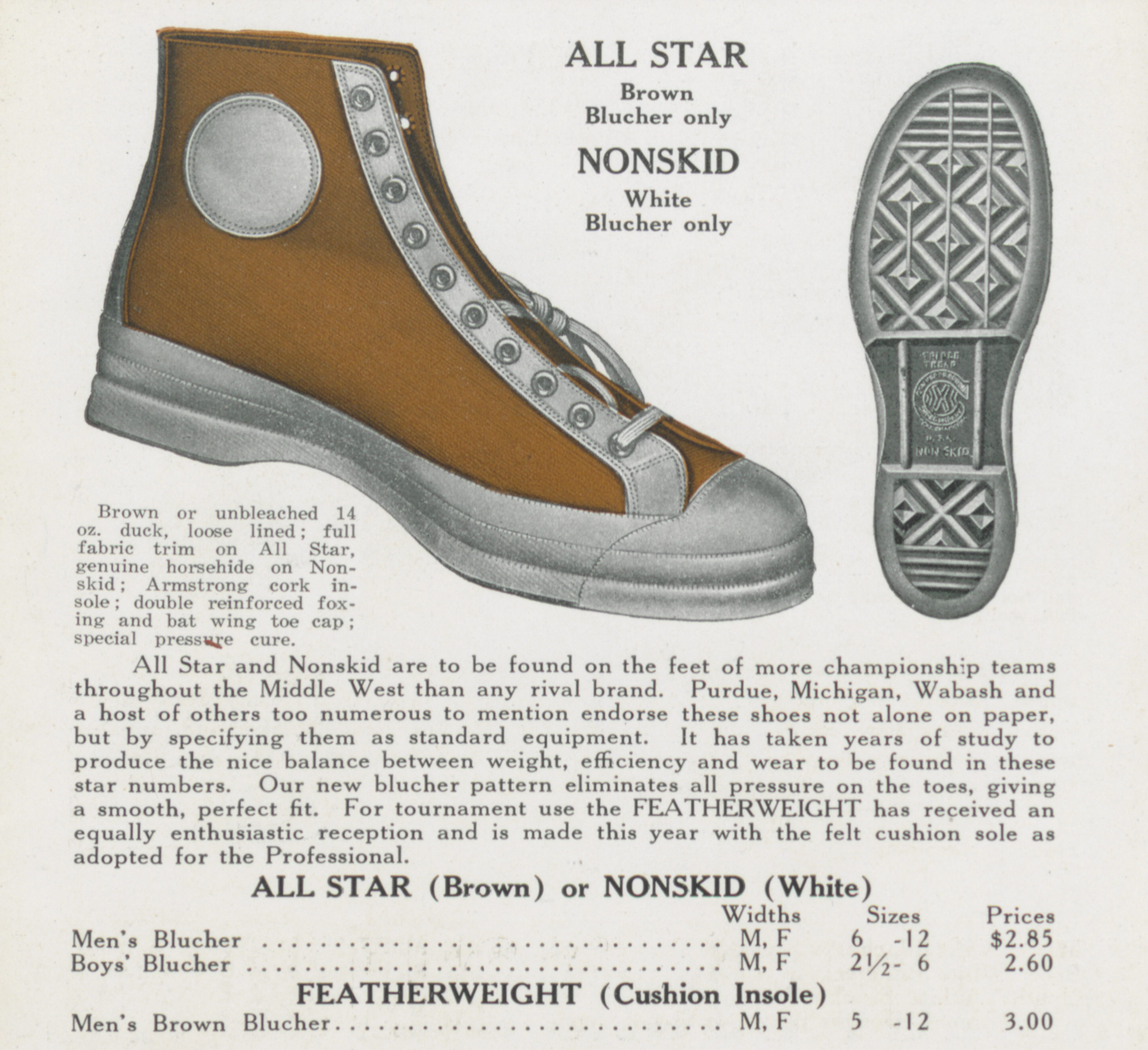 The sneaker was first marketed to the area’s coaches, who provided Converse with constructive feedback, including noting that they’d prefer a darker canvas upper because the light tan hue revealed too many scuffs and dings. In response, the company created a dark brown version of the Non-Skid, featuring black trim up the eye row. The iteration was officially branded the “All Star” in 1919, kicking off a new round of basketball-specific innovations that came to characterize the silhouette as the leading performance basketball shoe of the next half-century.