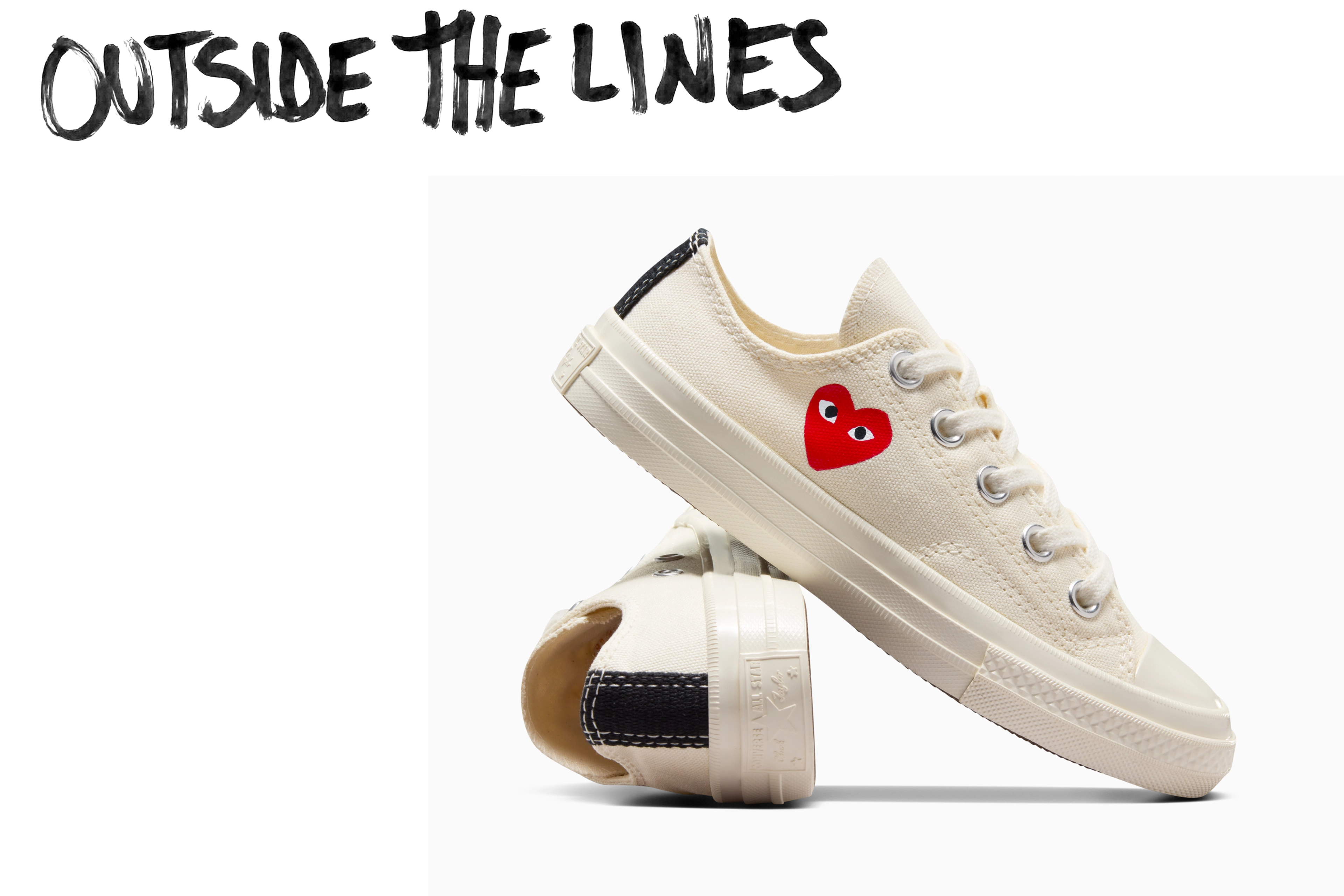 It all began in 1934 with Disney, Converse’s first brand partnership, which defined Chucks as the first shoes to feature Mickey Mouse. Despite this high-profile launch, it wasn’t until the late aughts that collaboration became a central element of the Chuck. The 2008 Converse 1HUND(RED) Artists collection commissioned 100 global musicians, graphic designers and graffiti artists to use the Chuck as a canvas on which to express their support of the fight against AIDS, empowering community for a cause and unleashing a dam of creativity. The stream of joint creations has remained steady, including signature contributions from the brand’s longest-standing collaborator, Comme des Garçons (CDG) PLAY.