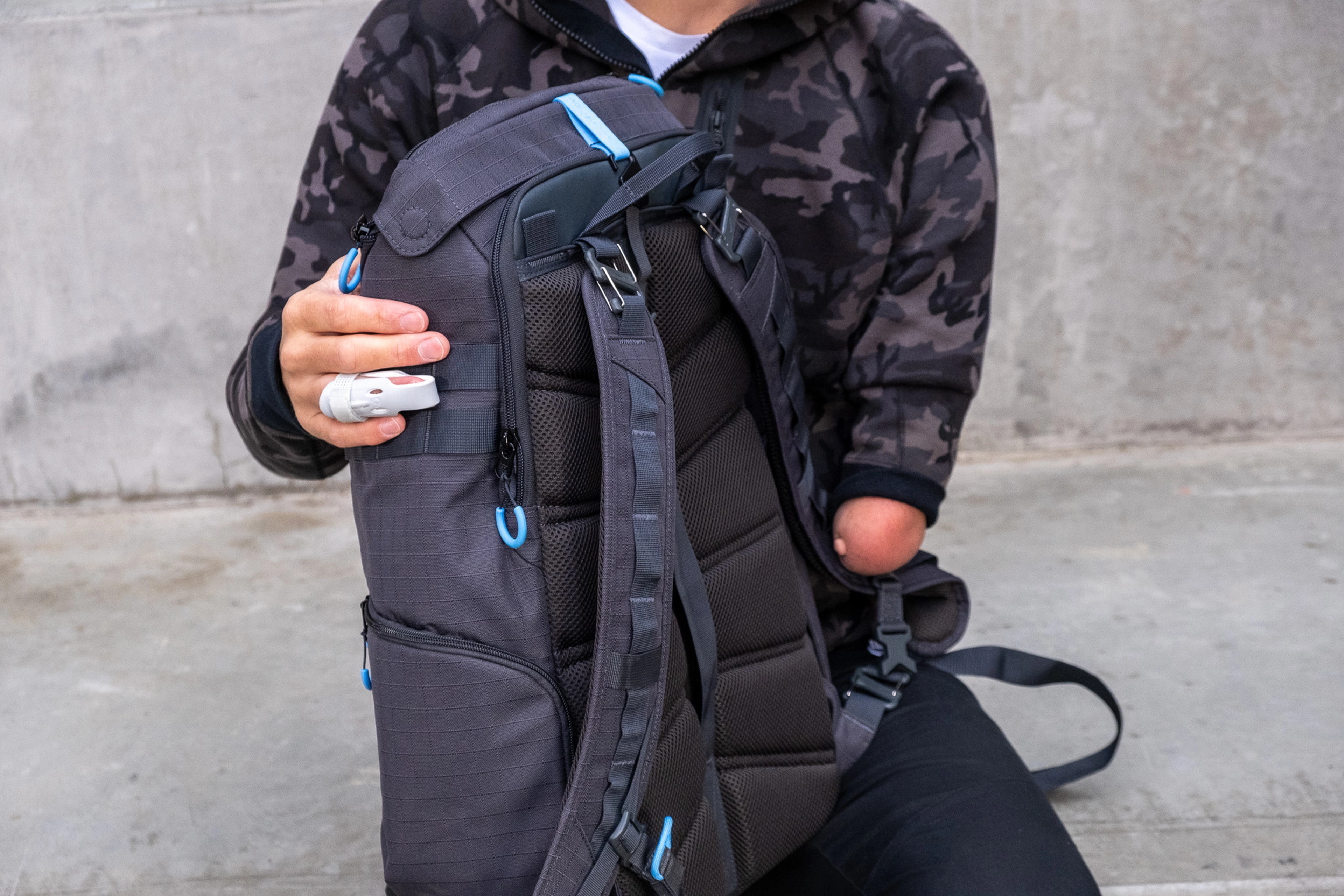 “A comment we were frequently hearing from adaptive athletes was how difficult it was to open and close traditional backpacks without a high-dexterity anchor point, like a hand,” says Radewald. “If they don’t have full use of both hands, small features like zippers and pull tags can be hard to grip.”