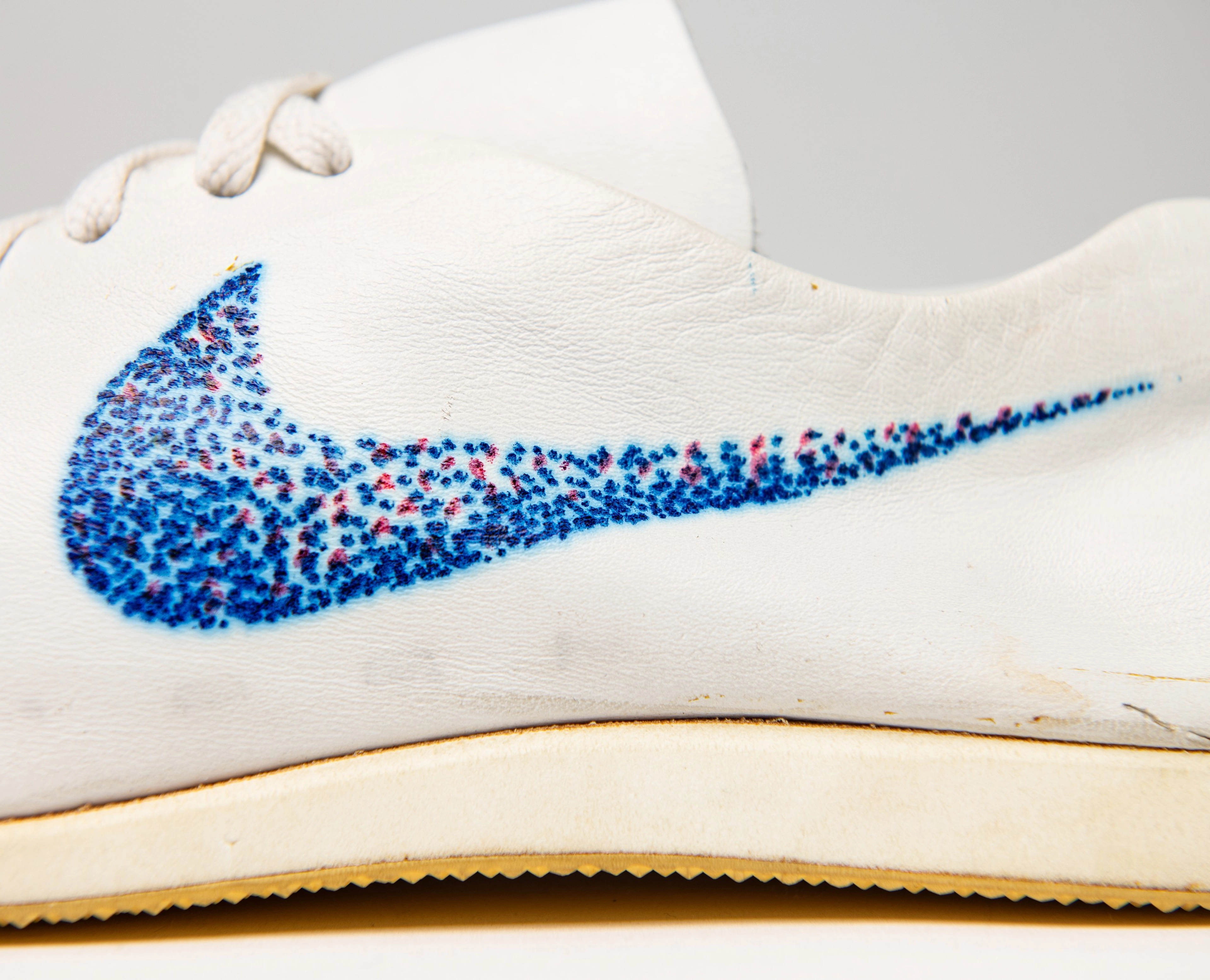 A perfect example of a one-off Swoosh — In his never-ending quest to make shoes lighter, in 1975 Bill Bowerman directed the Swoosh on this prototype to be hand stippled with pen and ink.