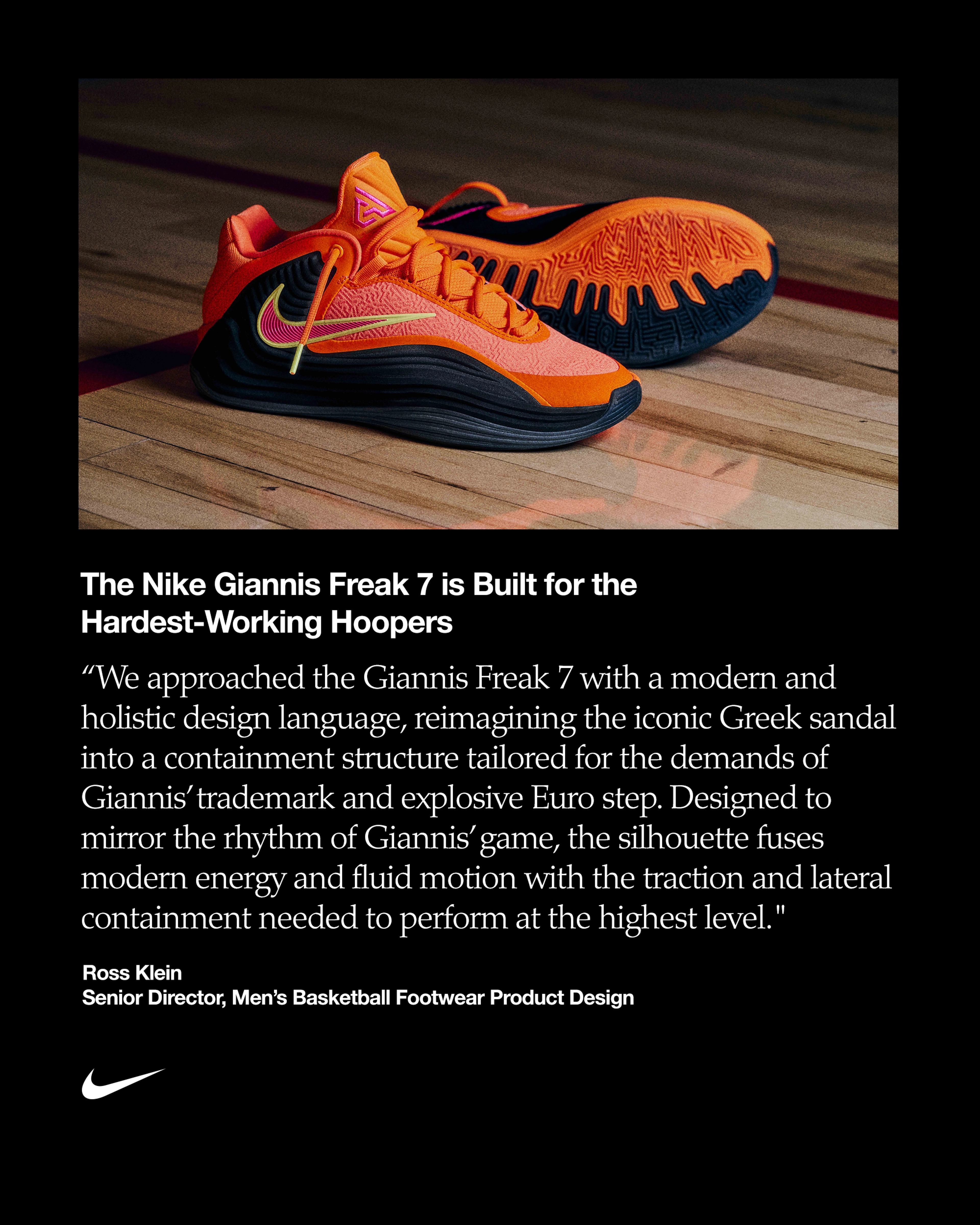 "Planteamos el diseño de los Giannis Freak 7 con un lenguaje moderno e integral, reinventando la icónica sandalia griega como una estructura de contención adaptada a las exigencias del característico y explosivo Eurostep de Giannis", afirma Ross Klein, director senior de Diseño de Calzado de Básquetbol para Hombre. "Diseñado para reflejar el ritmo de su juego, el modelo combina energía moderna y fluidez de movimiento con la tracción y contención lateral necesarias para rendir al máximo".