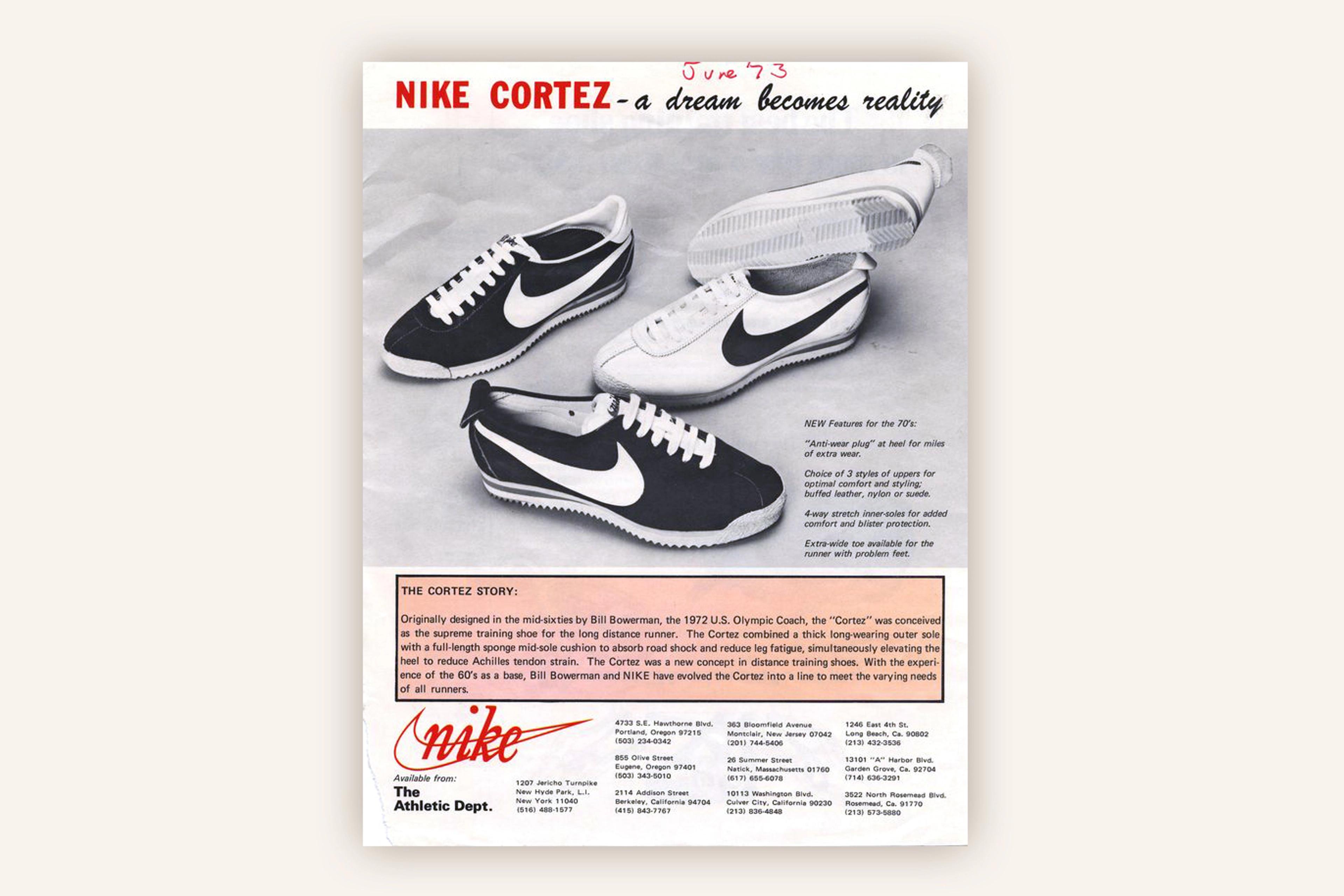 Finalmente, Onitsuka introdujo los Tiger Cortez con el diseño avanzado de Bowerman, que un catálogo de principios de 1967 describió de la siguiente manera: Están diseñados para ser los mejores tenis para recorrer largas distancias del mundo. La entresuela de esponja suave en el antepié y el talón absorbe los impactos de la carretera; la suela exterior de alta densidad dura más kilómetros.