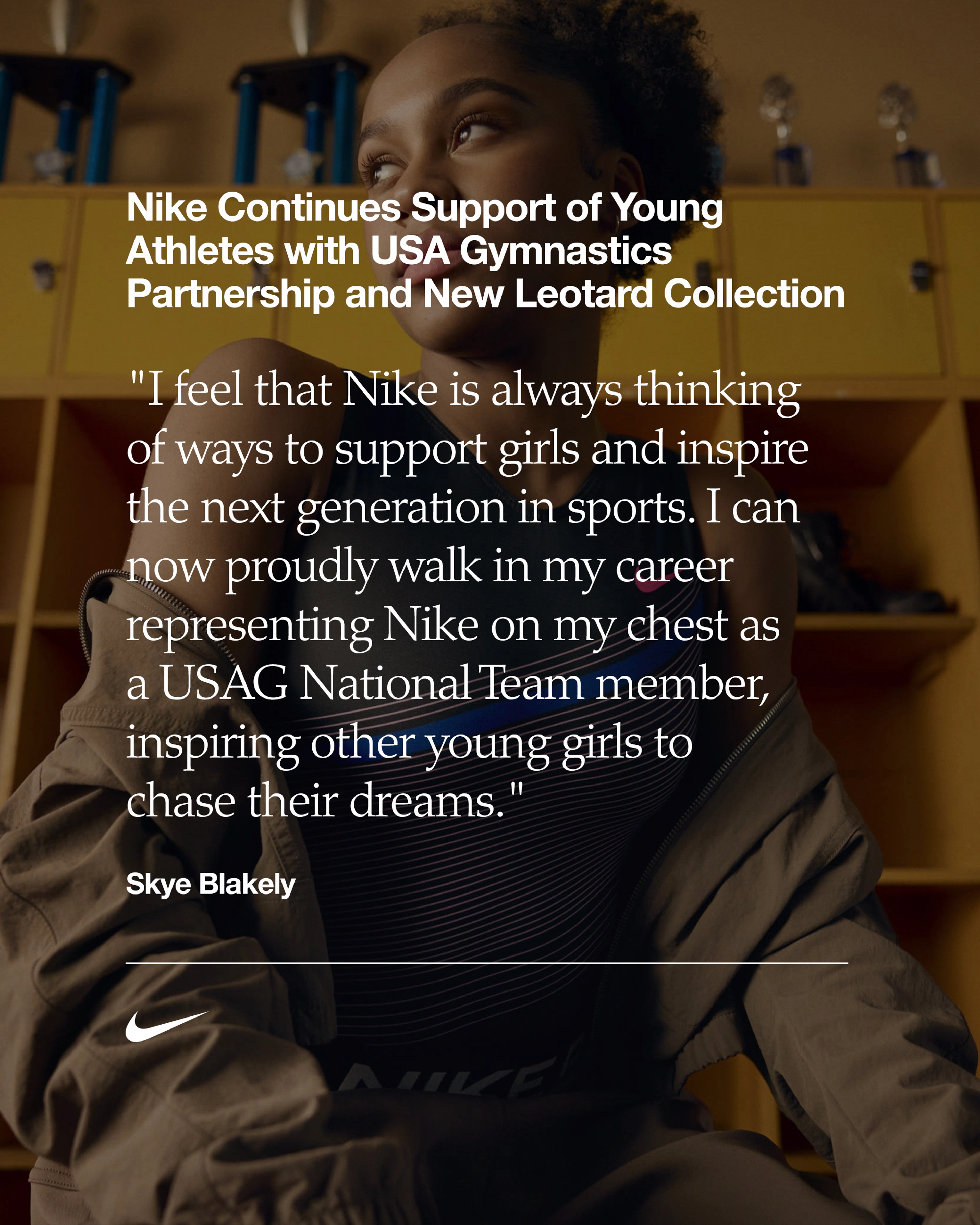 "Creo que Nike siempre está planteándose formas de ayudar a las niñas e impulsar el deporte entre la nueva generación", afirma Skye Blakely, atleta Nike de la selección de gimnasia de EE. UU. "Ahora puedo progresar en mi deporte como parte de la selección de gimnasia de EE. UU. mientras llevo con orgullo el Swoosh en el pecho y motivar a las niñas para que persigan sus sueños".