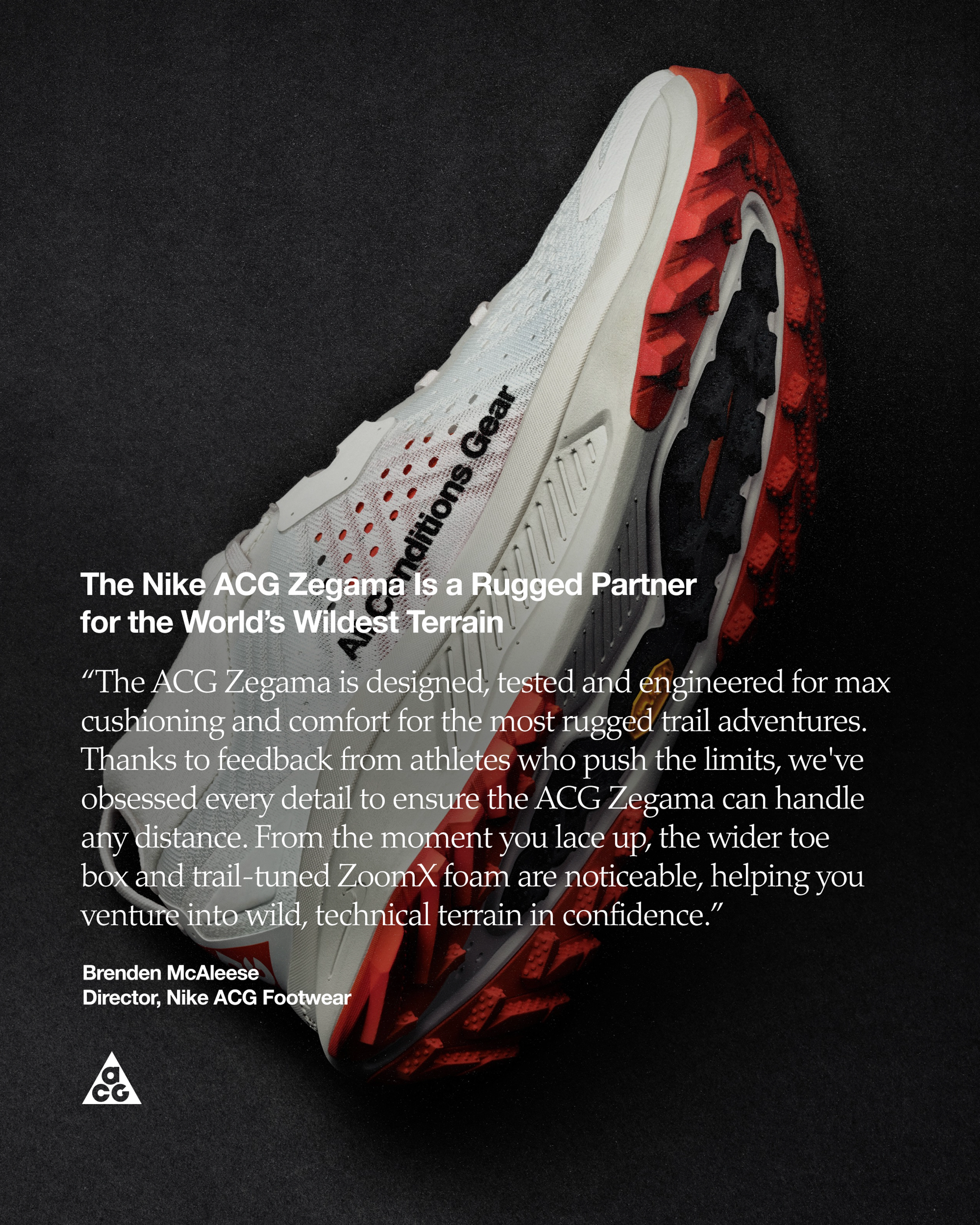 "Las ACG Zegama se han diseñado, fabricado y probado con el objetivo de proporcionar una amortiguación y una comodidad máximas en los senderos más irregulares", explica Brenden McAleese, director de zapatillas Nike ACG. "Gracias a los comentarios de atletas que van más allá de sus límites, hemos perfeccionado cada detalle para asegurarnos de que las ACG Zegama sean perfectas para cualquier distancia. En cuanto te las pones, sientes la espuma ZoomX y que la puntera es más ancha, lo que te ayuda a adentrarte en terrenos técnicos y salvajes con confianza".