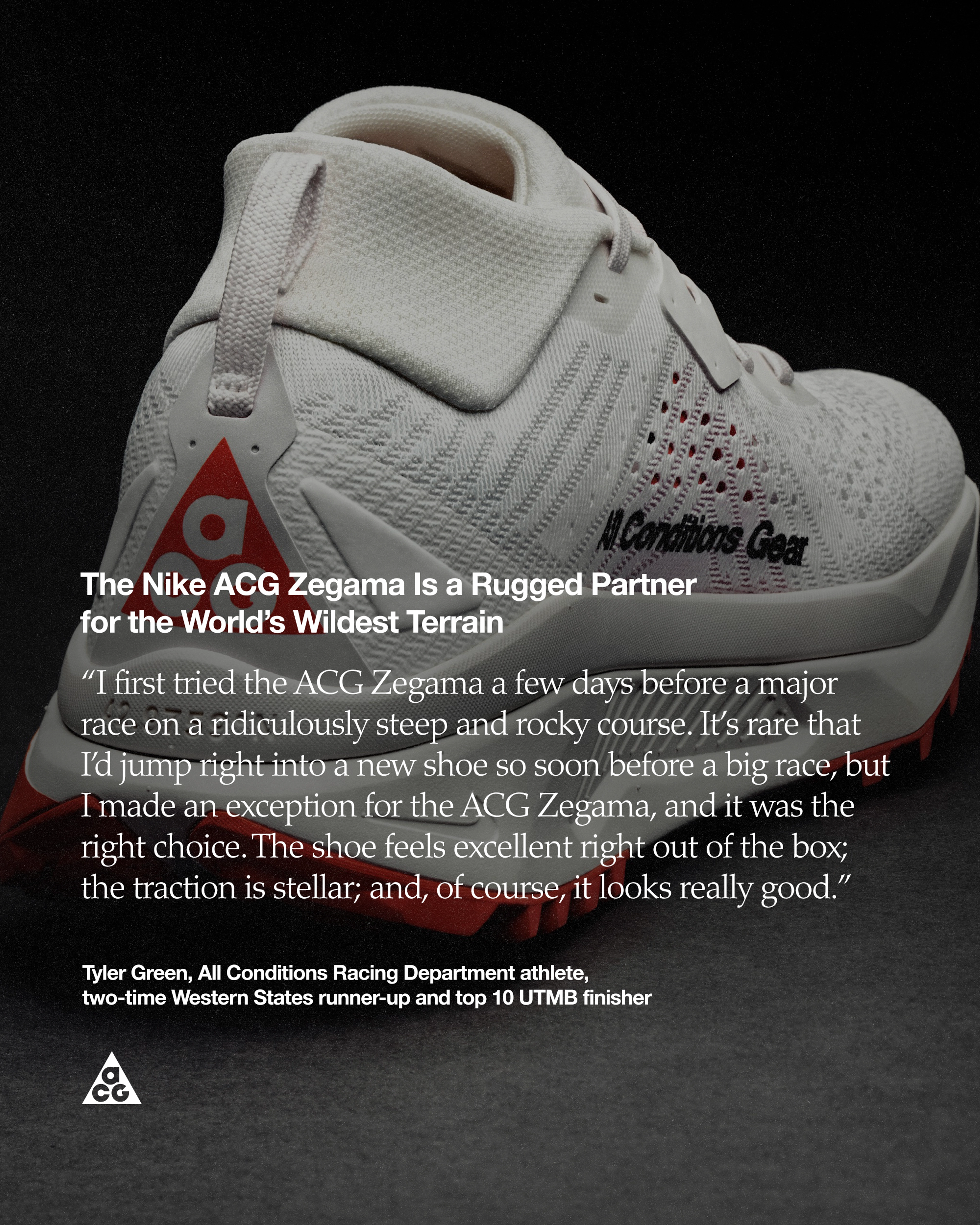 "Probé las ACG Zegama por primera vez unos días antes de una competición importante en un terreno rocoso con bastante desnivel", comenta Tyler Green, atleta del All Conditions Racing Department, dos veces subcampeón de la Western States y uno de los 10 mejores tiempos de la UTMB. "No suelo utilizar zapatillas nuevas poco antes de una gran carrera, pero hice una excepción con las ACG Zegama y acerté. La sensación es espectacular desde el primer momento; la tracción es excelente; y, además, son muy bonitas".