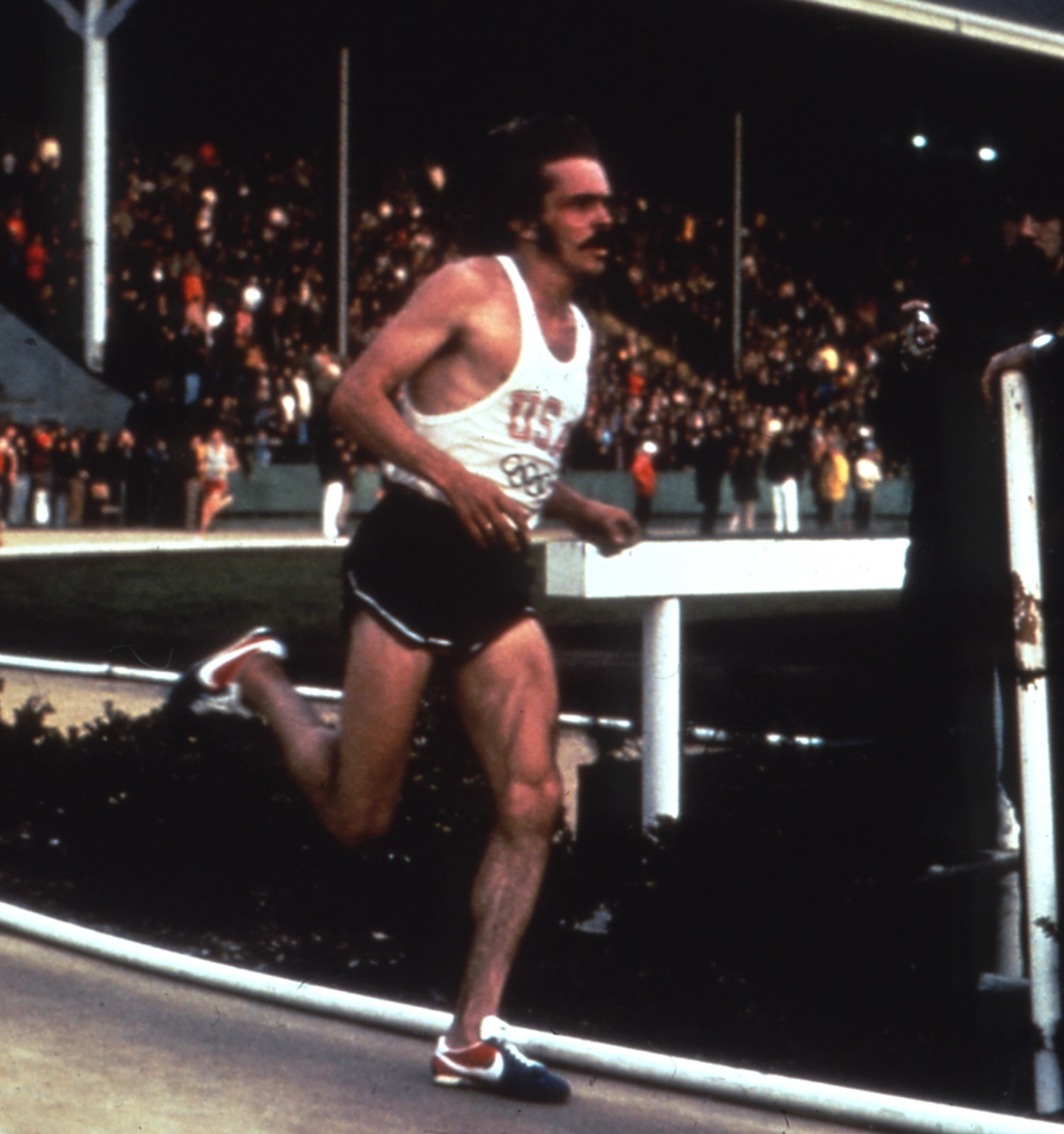 Steve Prefontaine courant avec ses Nike Pre Montreal à Hayward Field, lors de l'Oregon Twilight en 1974.