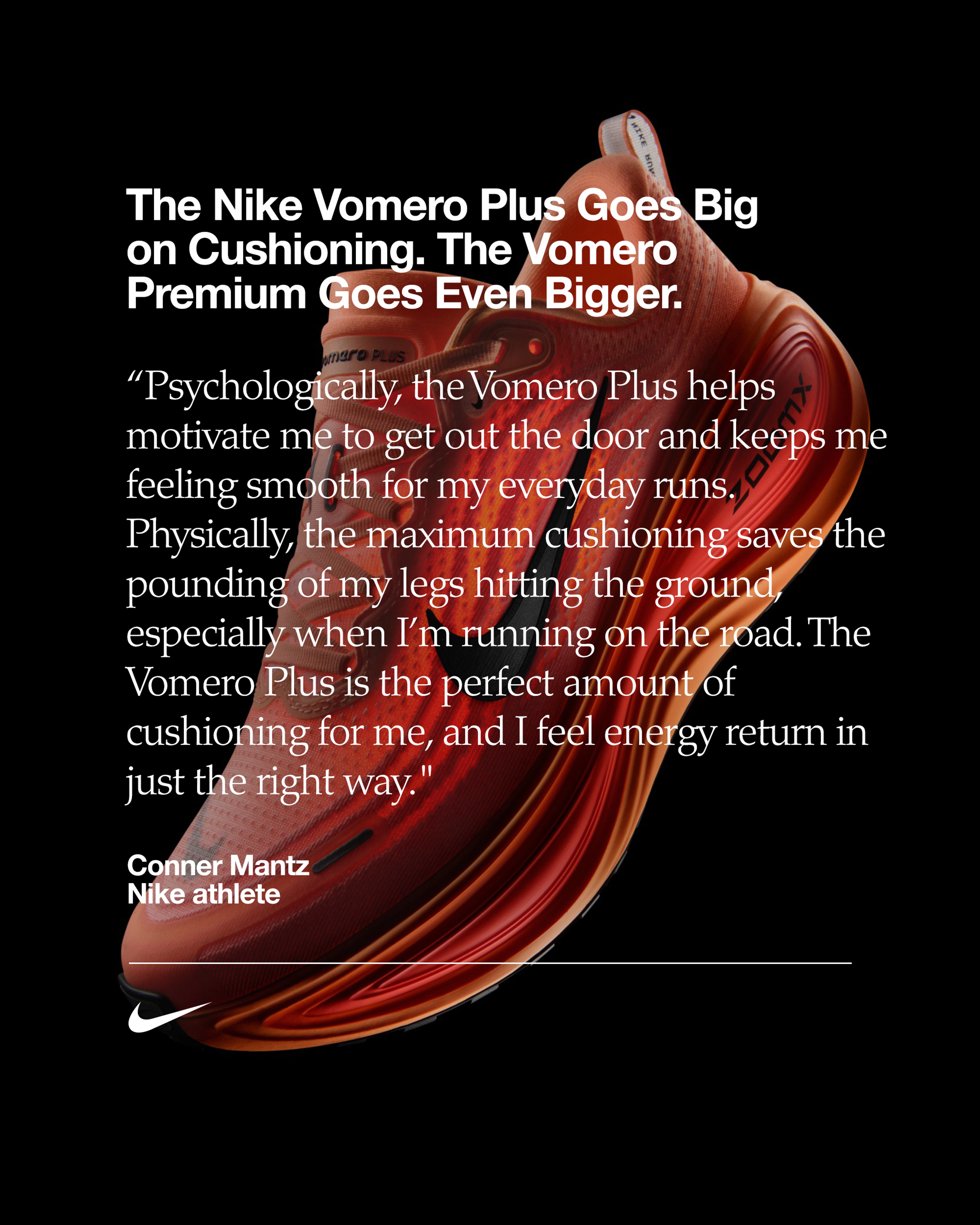 « Psychologiquement, la Vomero Plus m'aide à me motiver à sortir de chez moi et à me sentir bien pendant mes runs quotidiens, déclare Conner Mantz, athlète Nike qui a remporté les qualifications américaines pour le marathon olympique en 2024. D'un point de vue physique, l'amorti maximal évite à mes pieds de heurter trop durement le sol, surtout quand je cours sur la route. L'amorti de la Vomero Plus me convient parfaitement, et le retour d'énergie est exactement au bon niveau. »