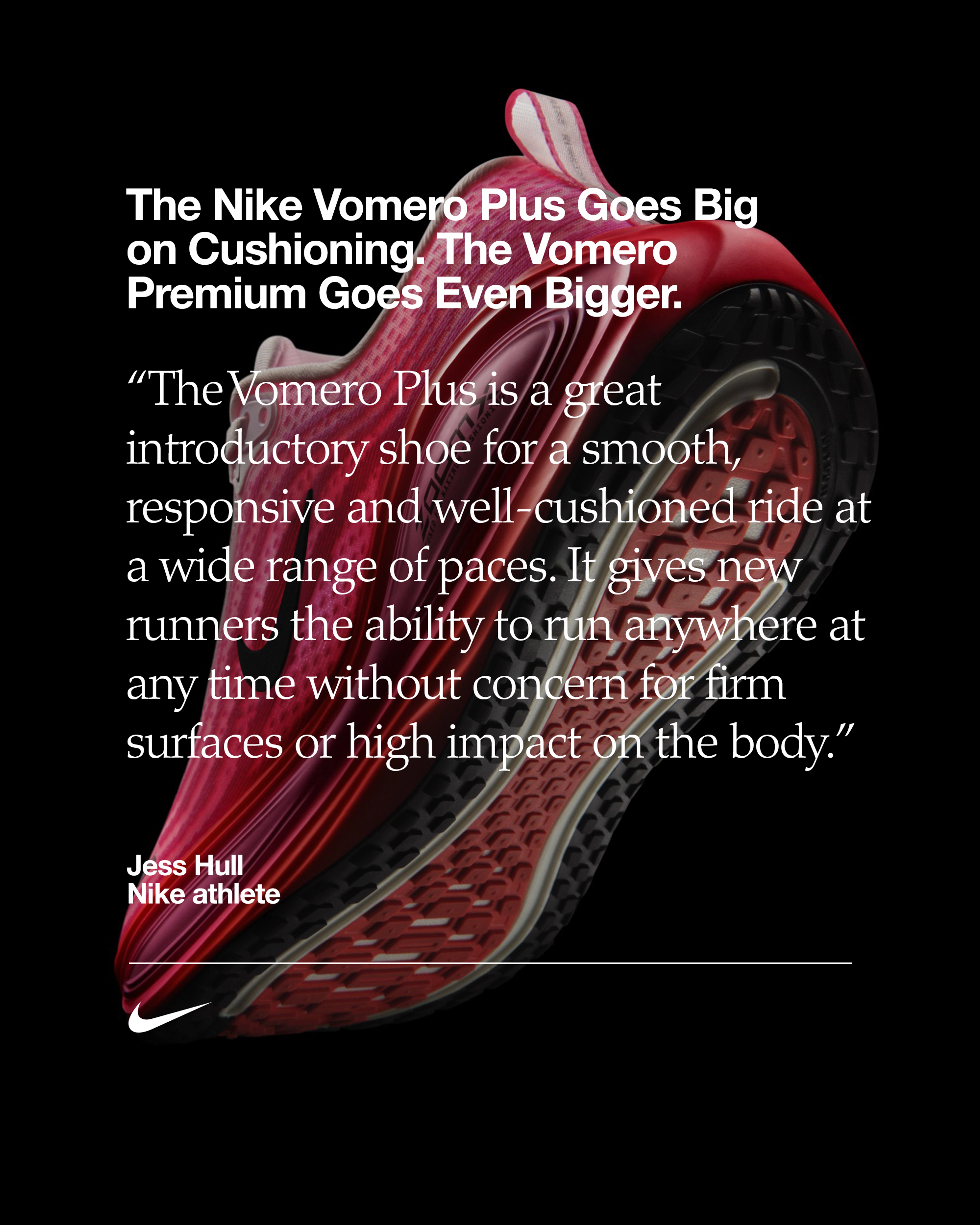 - La Vomero Plus intègre une semelle intermédiaire ZoomX sur toute la longueur pour une foulée encore plus souple, légère et réactive que la Vomero 18, qui fait pourtant partie des préférées de la communauté running en tant qu'icône de Nike dans la catégorie « Amorti maximal » des chaussures de running sur route.